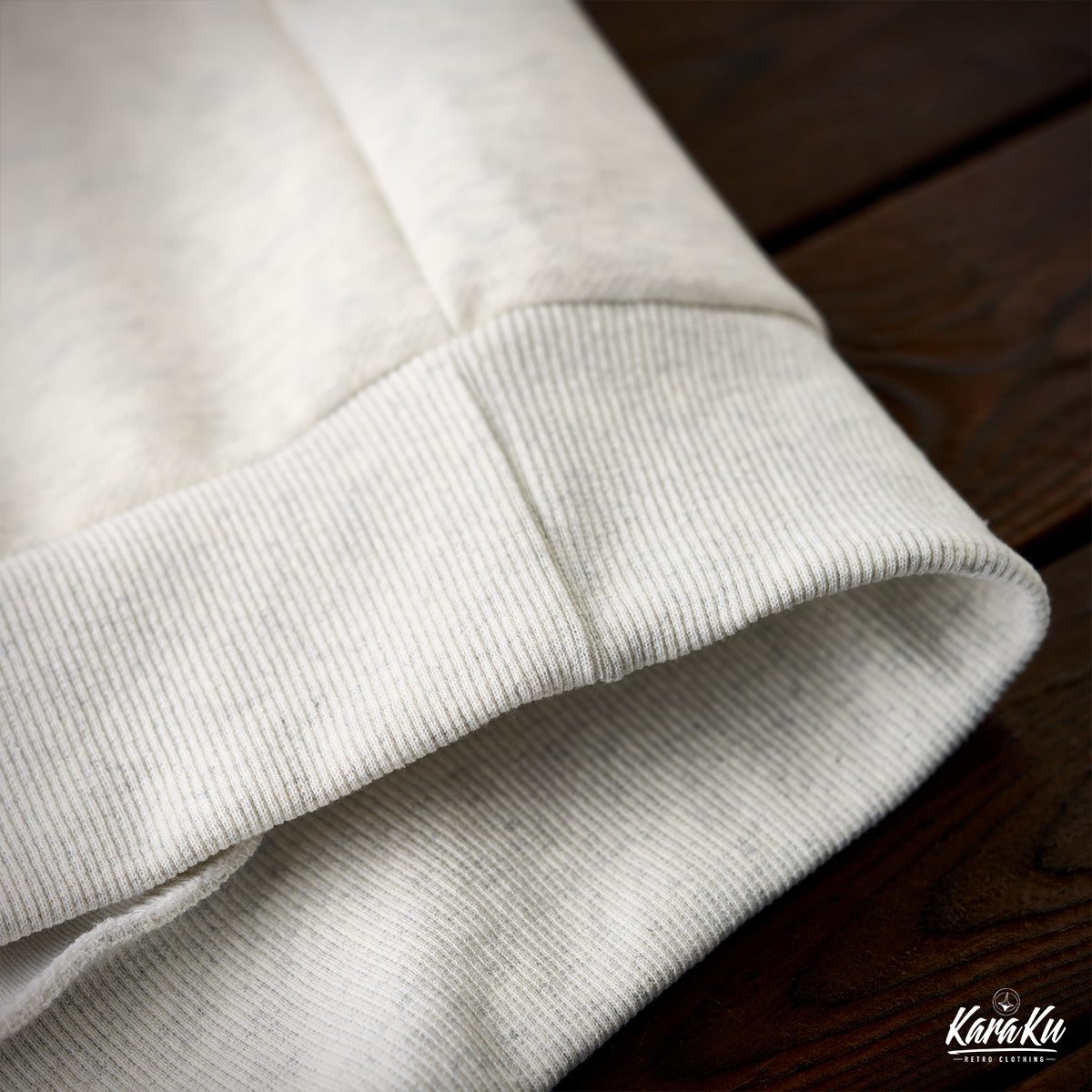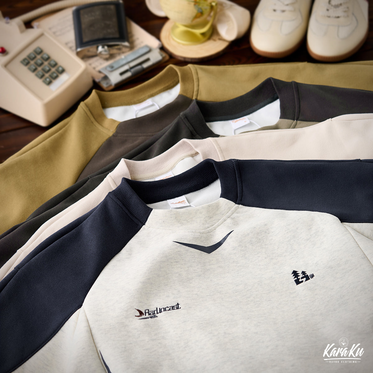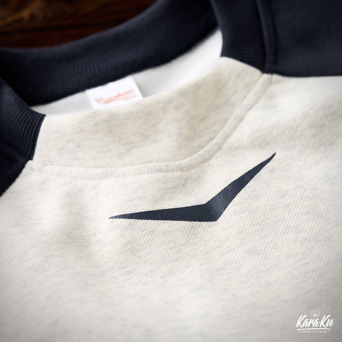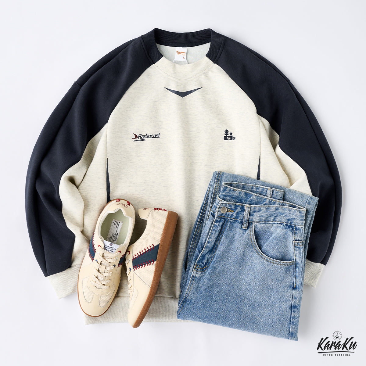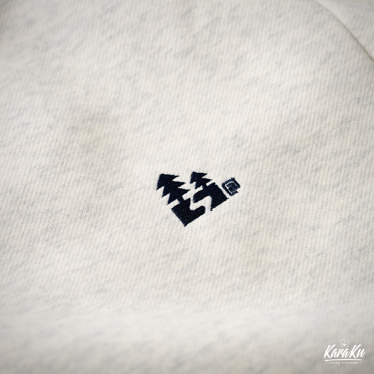 가슴과 소매에 로고 자수가 레트로한 감성을 더하며, 전체적인 분위기와 잘 어우러집니다.
