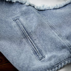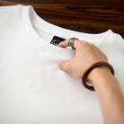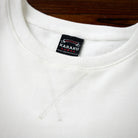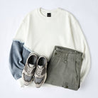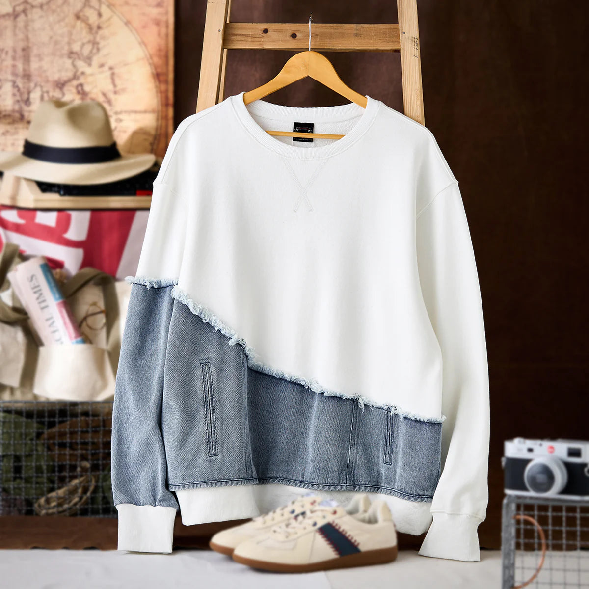 빈티지 워시드 데님 배색과 ‘V 가셋’, 페이크 포켓 장식이 돋보이는 크루넥 코튼 스웨트셔츠입니다.