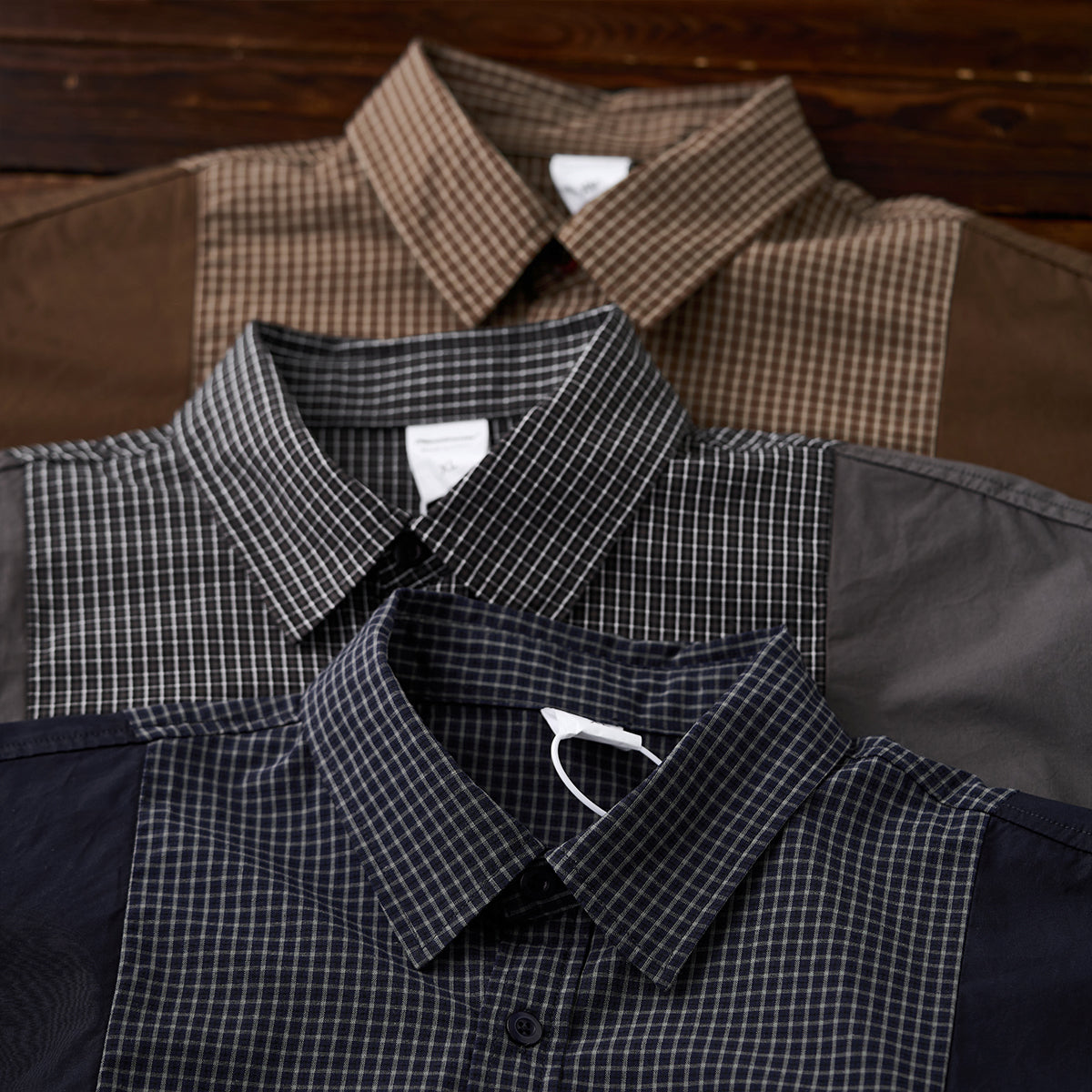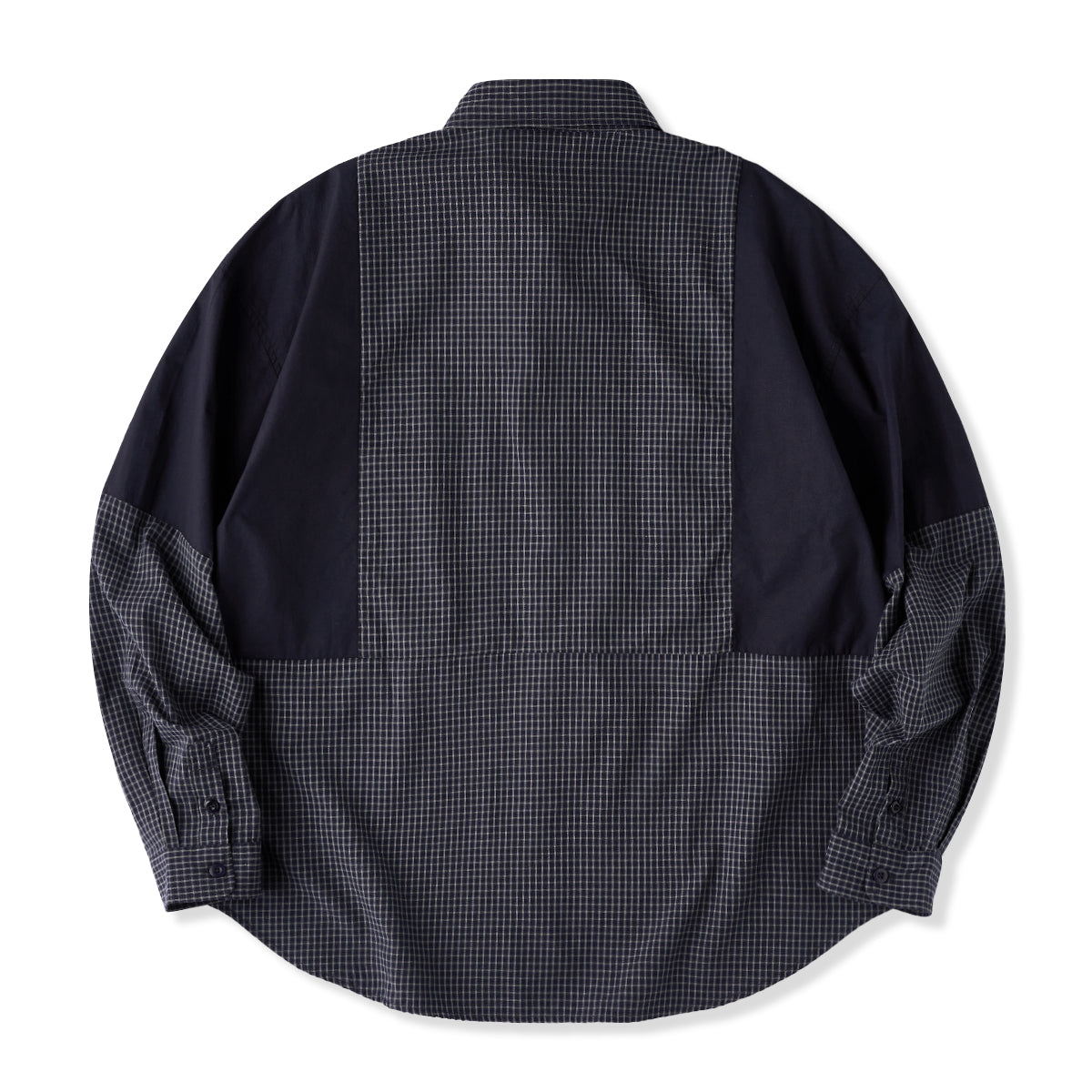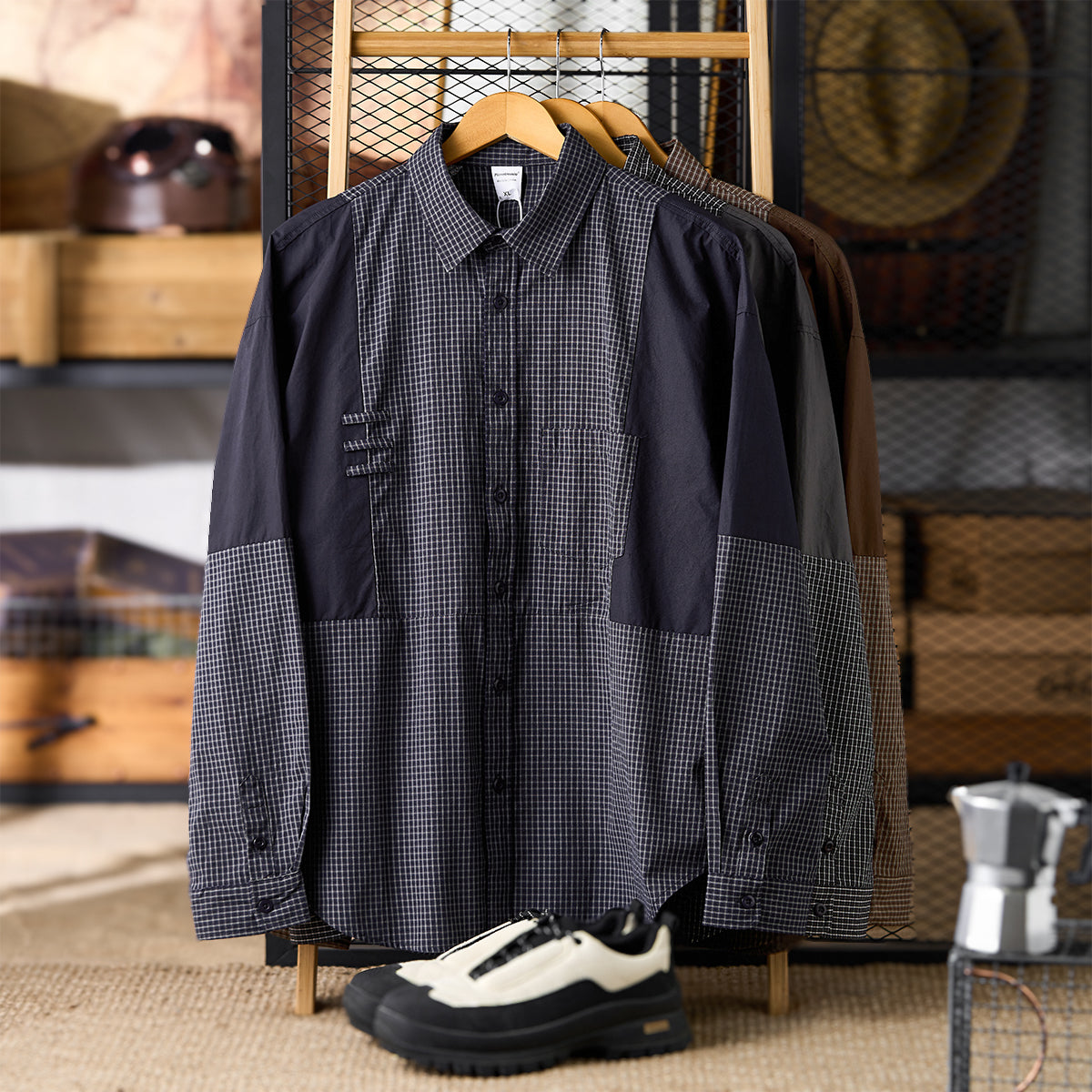 어깨와 소매 부분에 무지 원단을 배색하며, 몸판에는 차분한 체크 패턴을 적용해 시각적인 포인트와 워크웨어 특유의 실용성을 더했습니다.