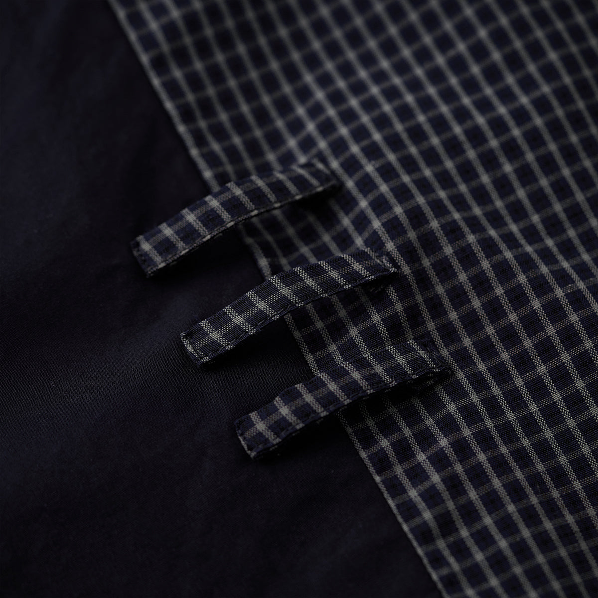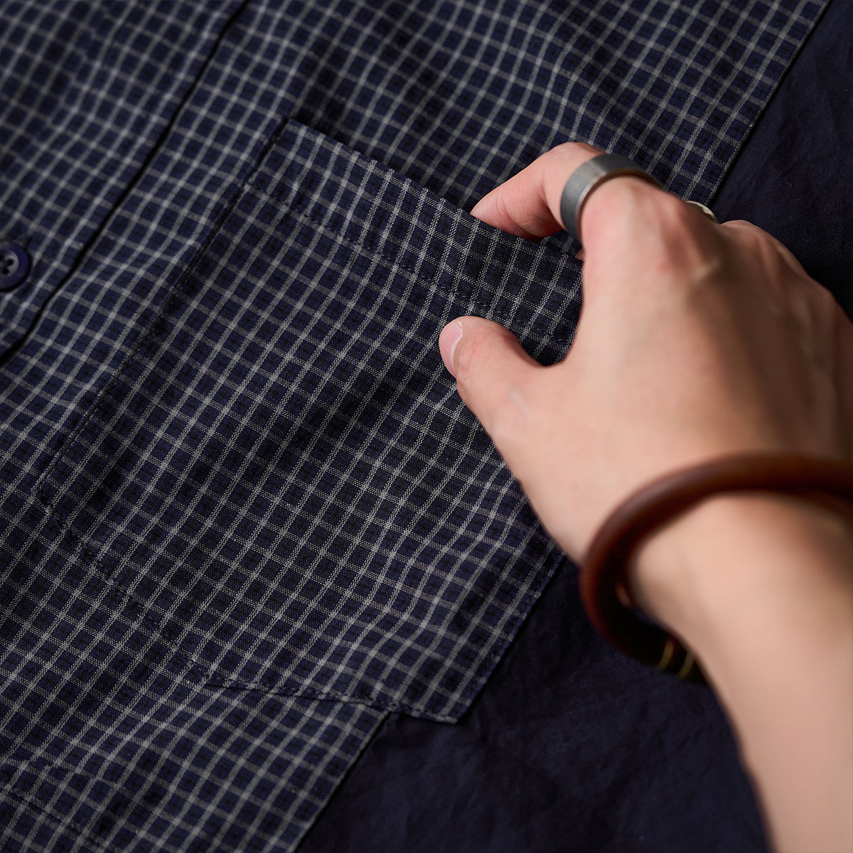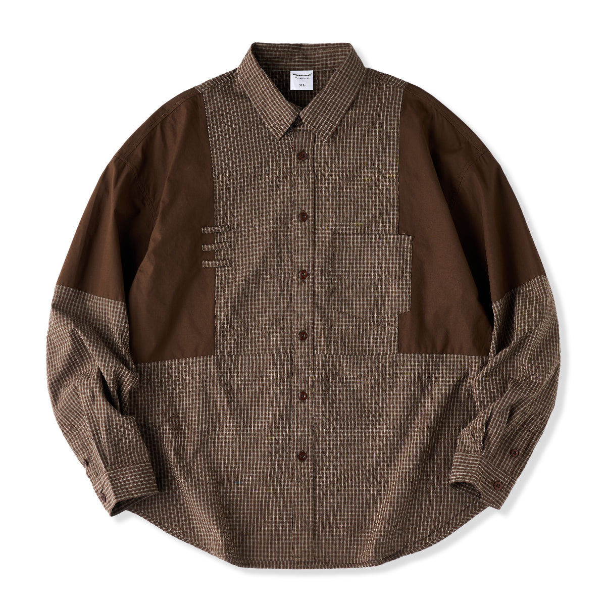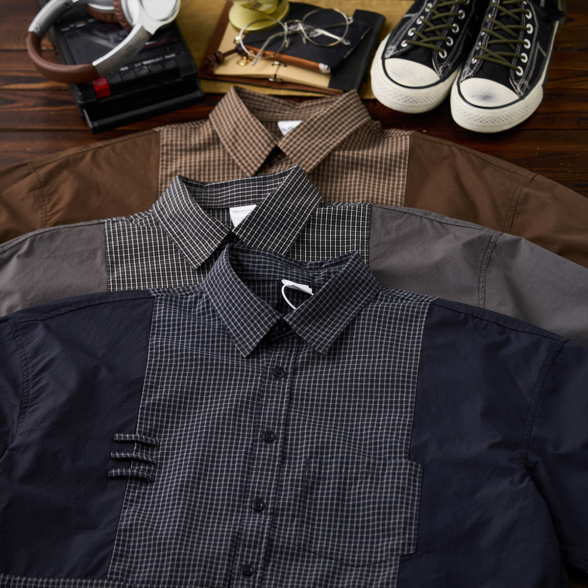 어깨와 소매 부분에 무지 원단을 배색하며, 몸판에는 차분한 체크 패턴을 적용해 시각적인 포인트와 워크웨어 특유의 실용성을 더했습니다.