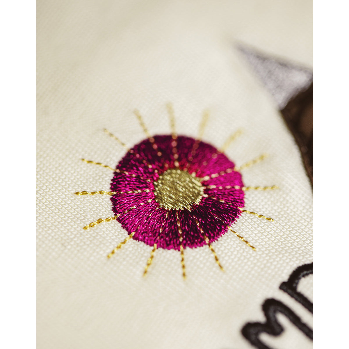 입체 텐트 디자인과 작동 지퍼, 세밀한 캠핑 디테일, 화려한 핑크·골드 태양 자수가 돋보이는 독특한 디자인입니다.