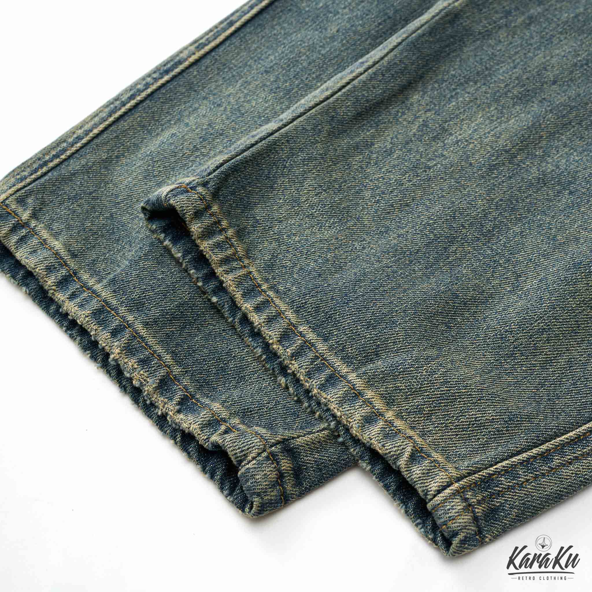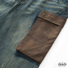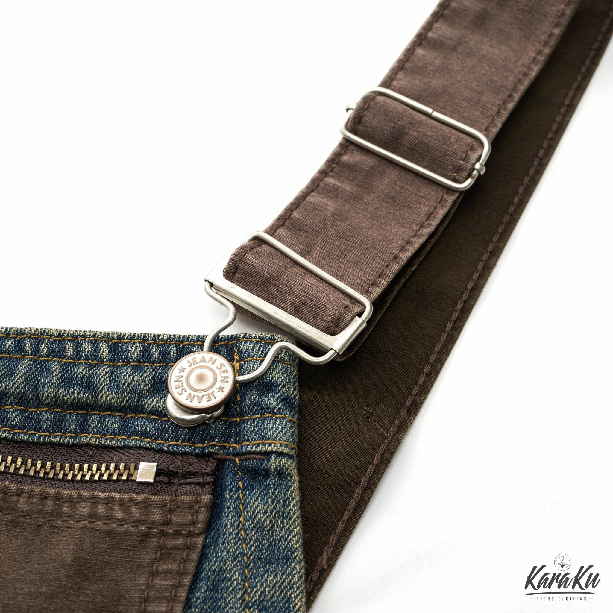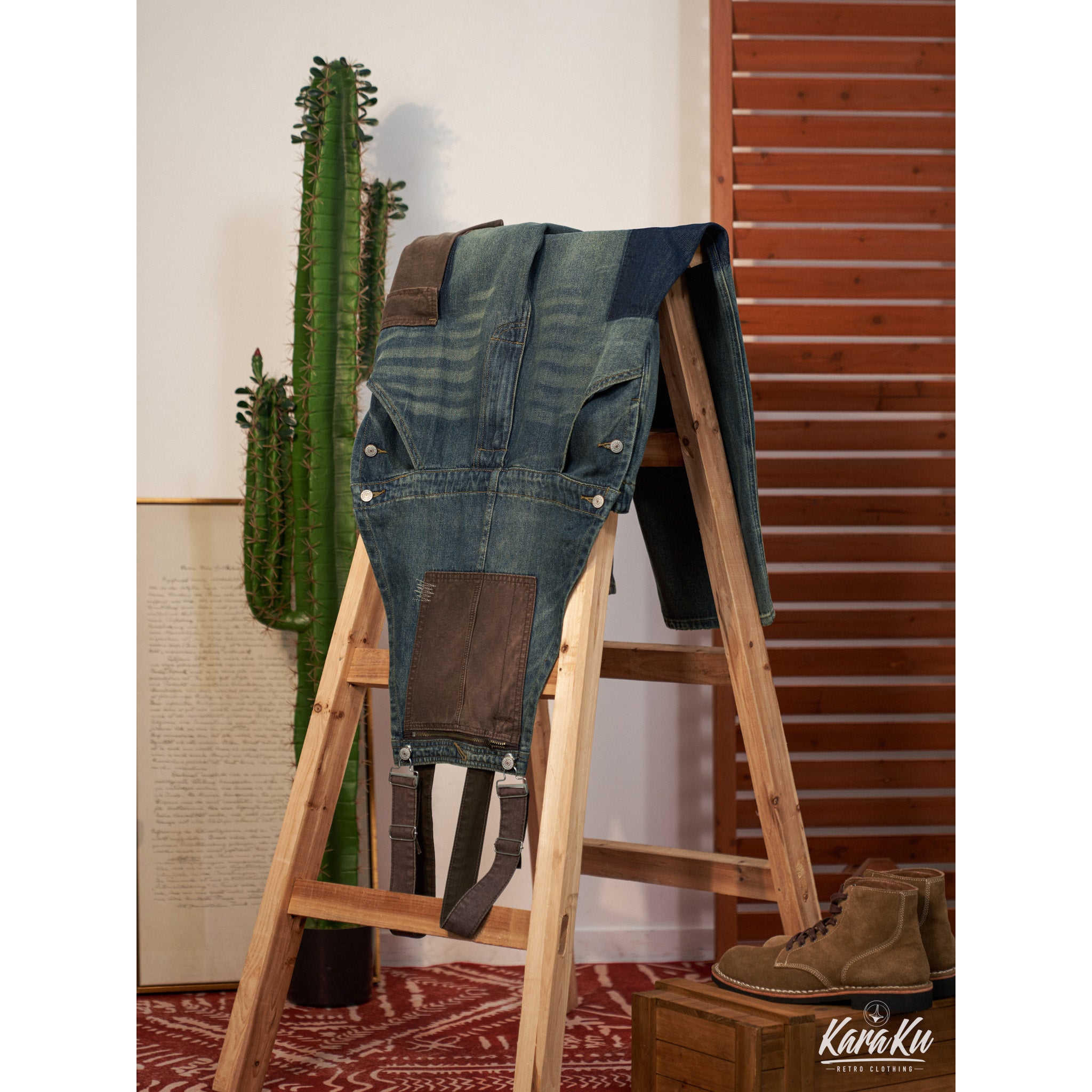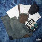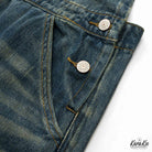 왼쪽에 컬러 전환 포켓, 후면에 패치 포켓을 배치해 워크 디테일이 돋보입니다. 데미지 가공이 되어 있기 때문에 전체적으로 레트로 느낌을 줍니다. 탈부착 가능한 멜빵을 허리 위치에 버튼으로 고정할 수 있고, 타이트하거나 루즈하게 고정하기에 따라 분위기가 다른 스타일링을 즐길 수 있습니다.