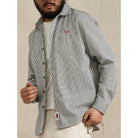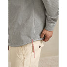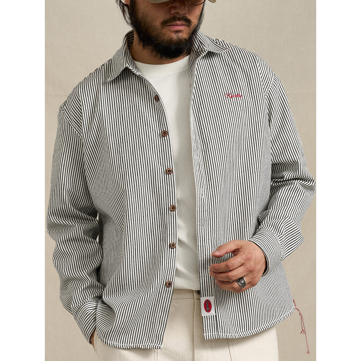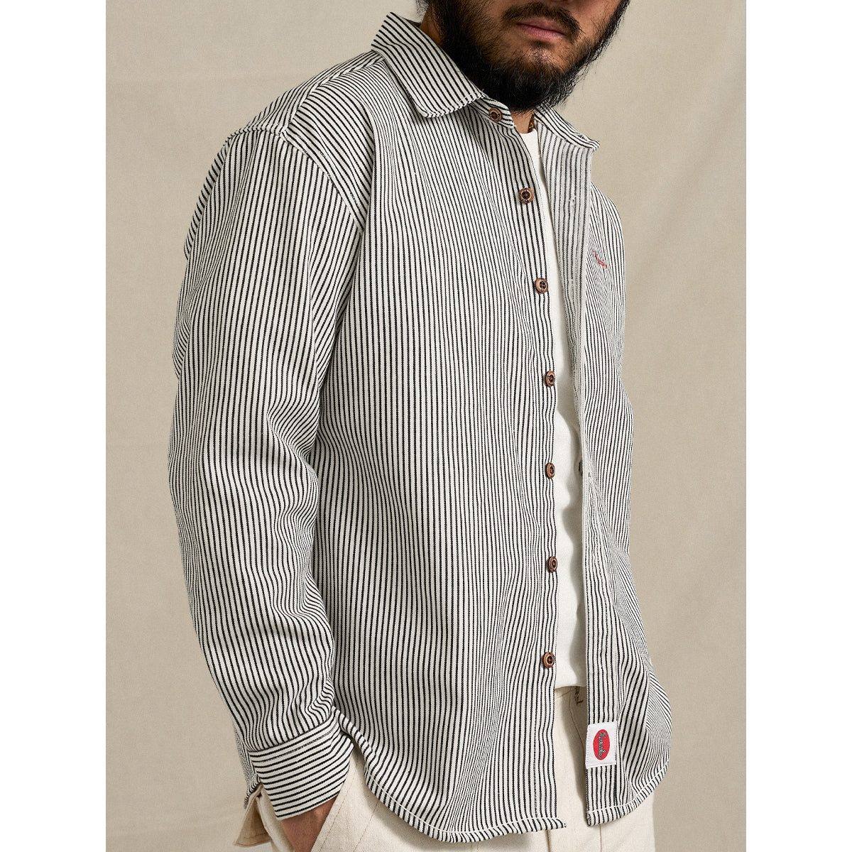 왼쪽 가슴의 "Karaku" 자수와 선염 스트라이프 패턴이 고급스러움을 더하며, 목재 느낌의 버튼과 빨간, 흰색 끈이 포인트를 주는 셔츠입니다.