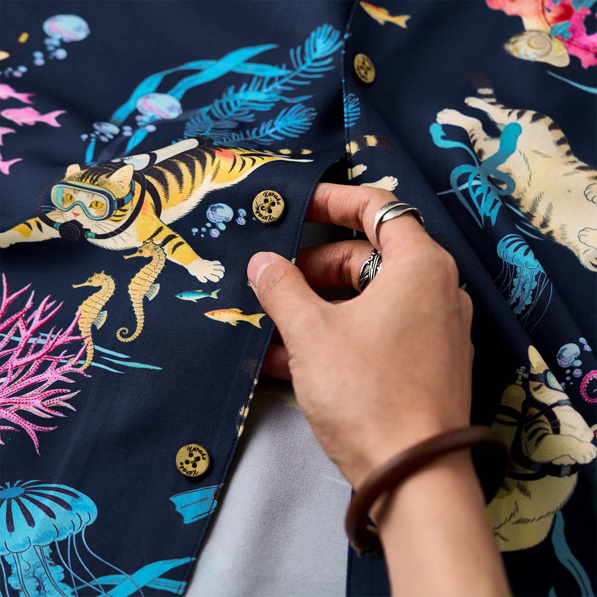 「환상 바다 속 잠수 고양이」전체 패턴 프린트 알로하 셔츠