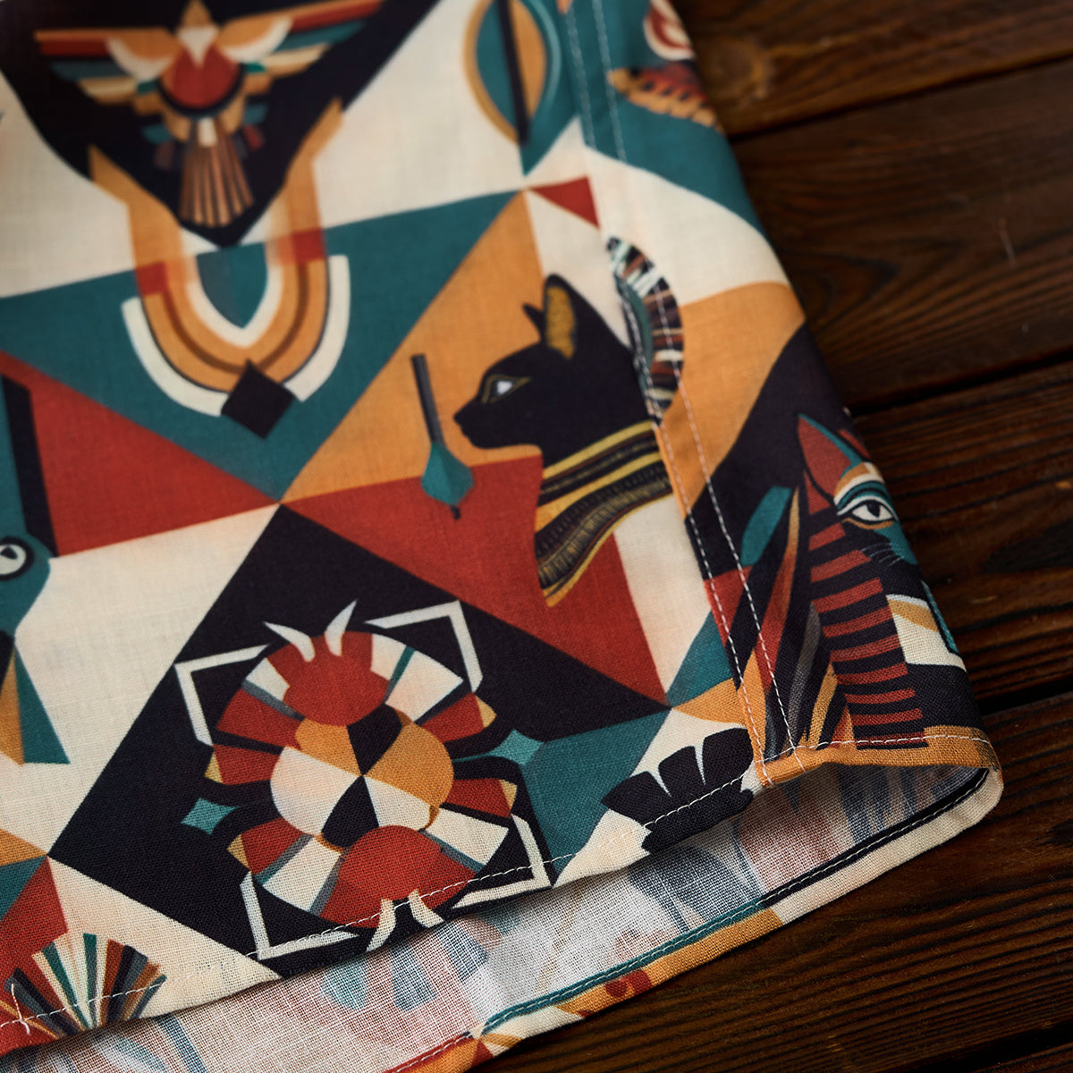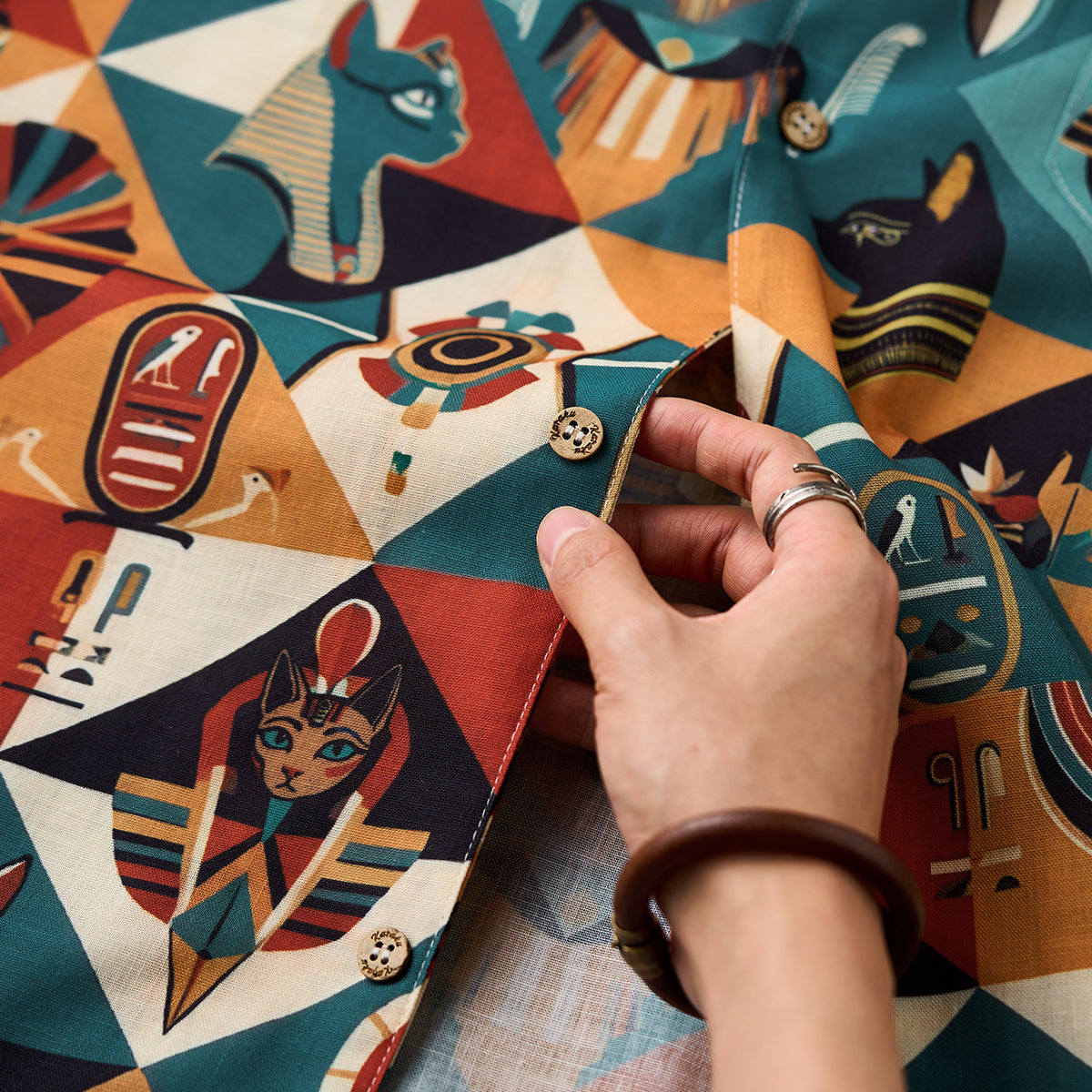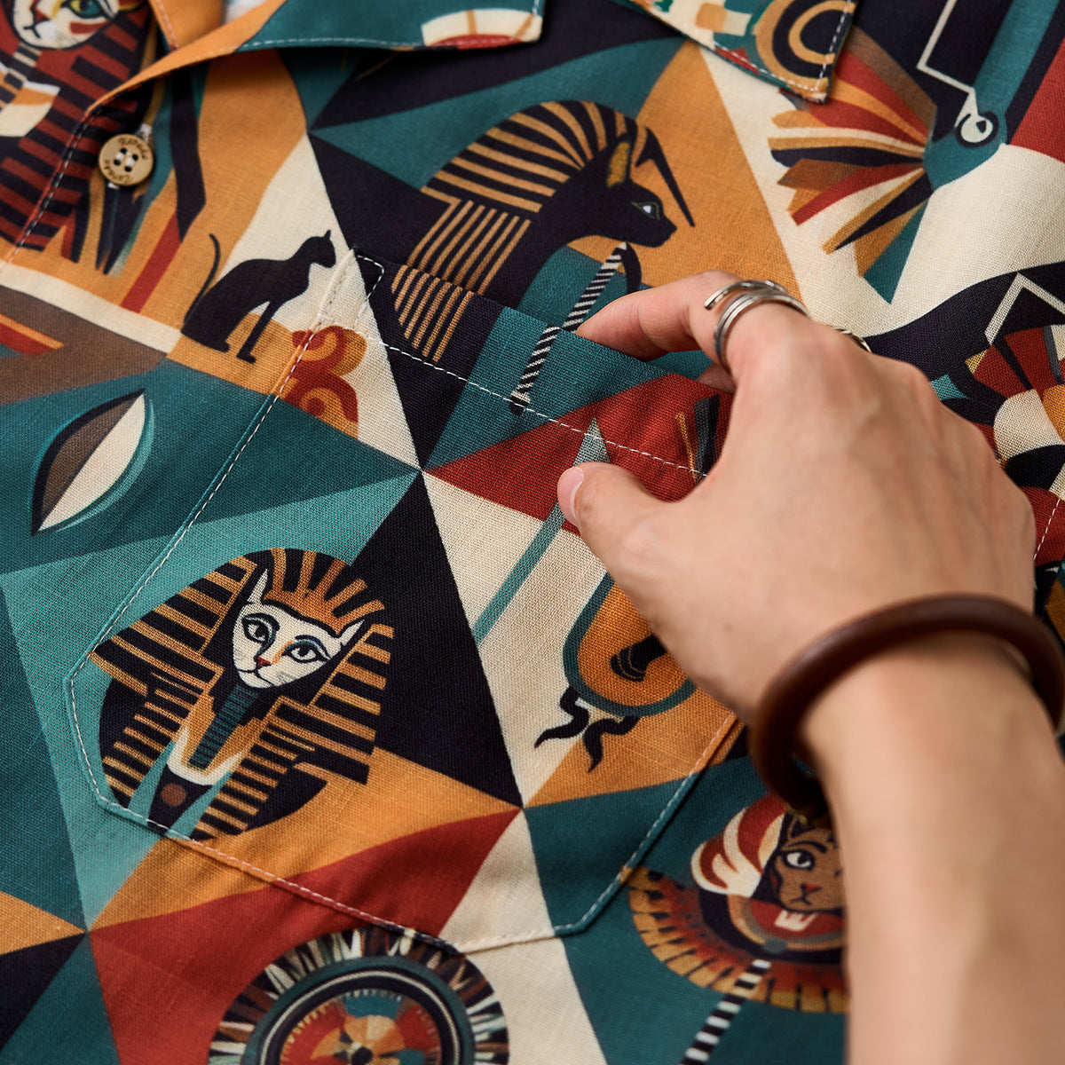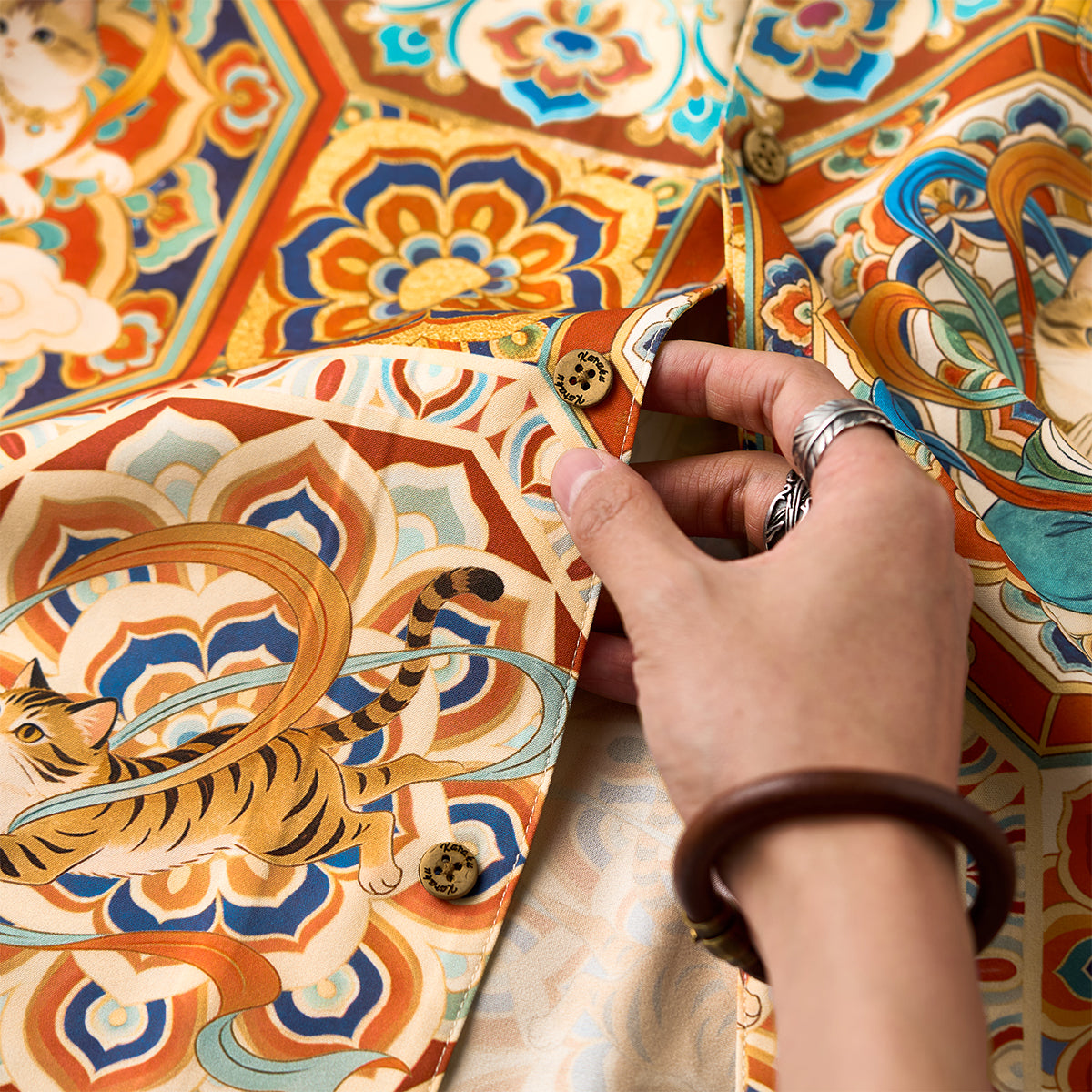 「둔황·비천 고양이」에스닉 올오버 패턴 알로하 셔츠
