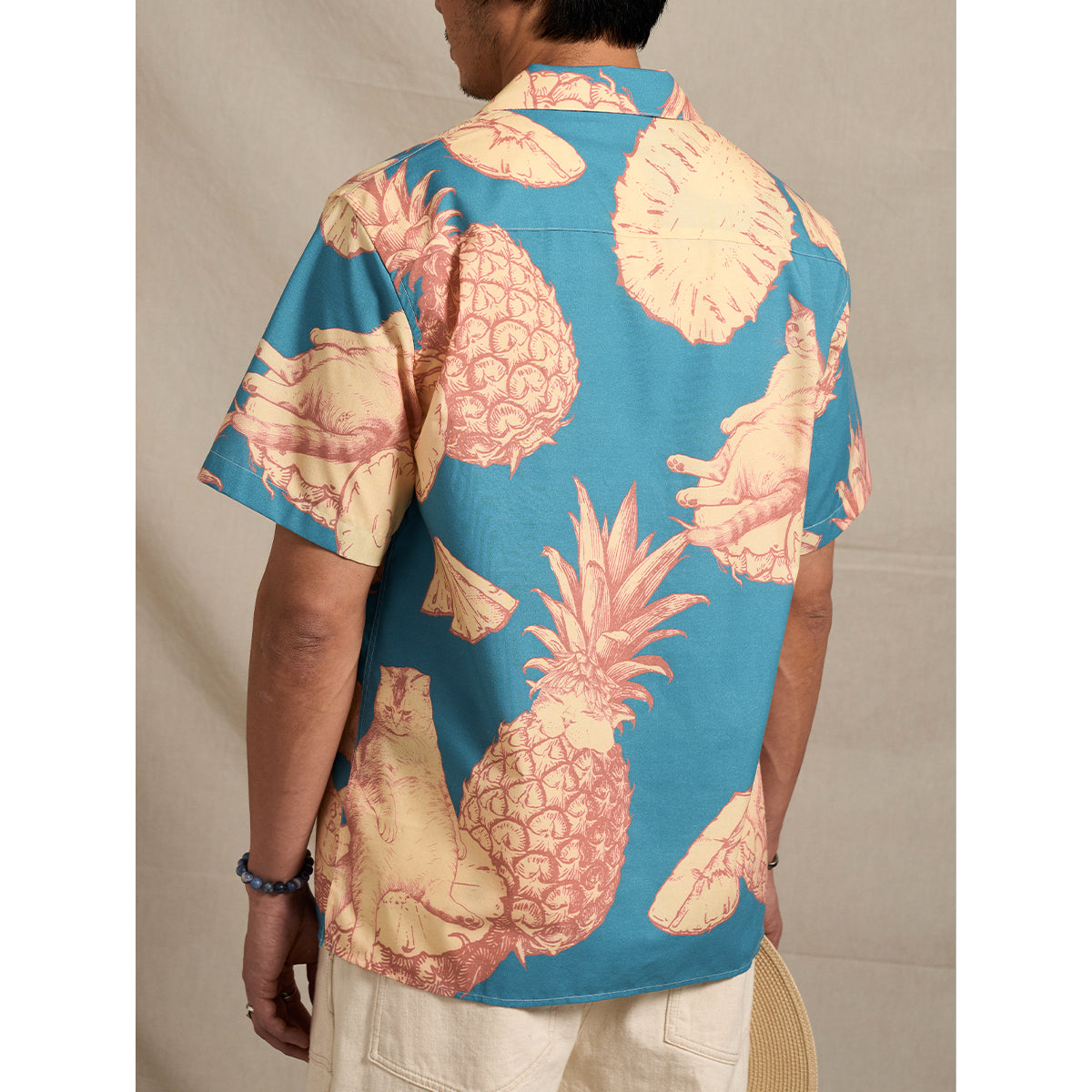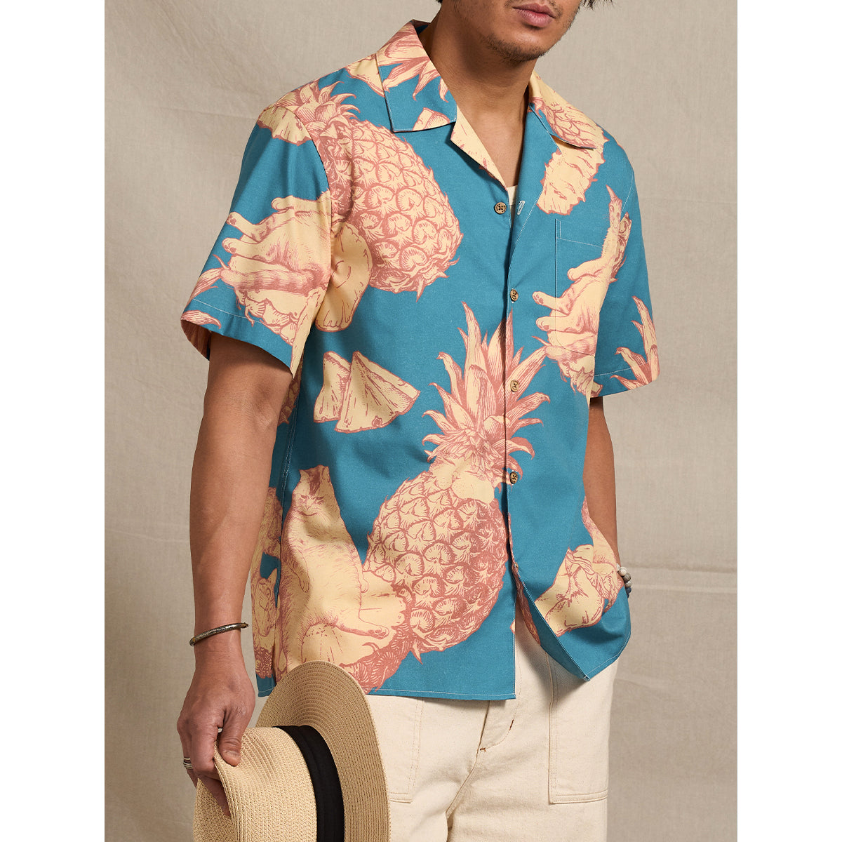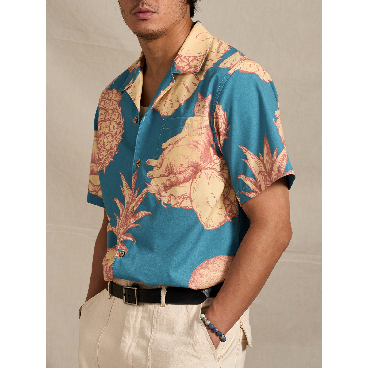 「파인애플과 여유로운 고양이」 트로피컬 패턴 알로하 셔츠