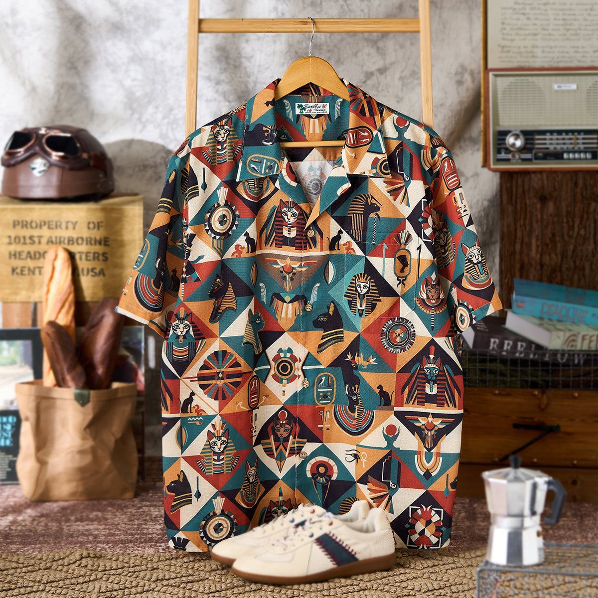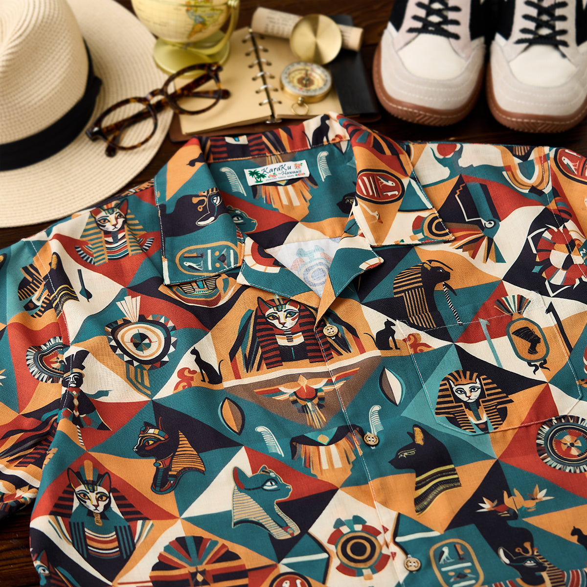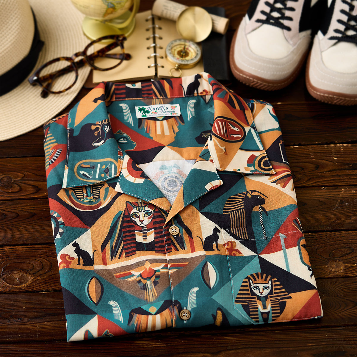 【사전예약】「고대 이집트 고양이 파라오」 올오버 프린트 알로하 셔츠