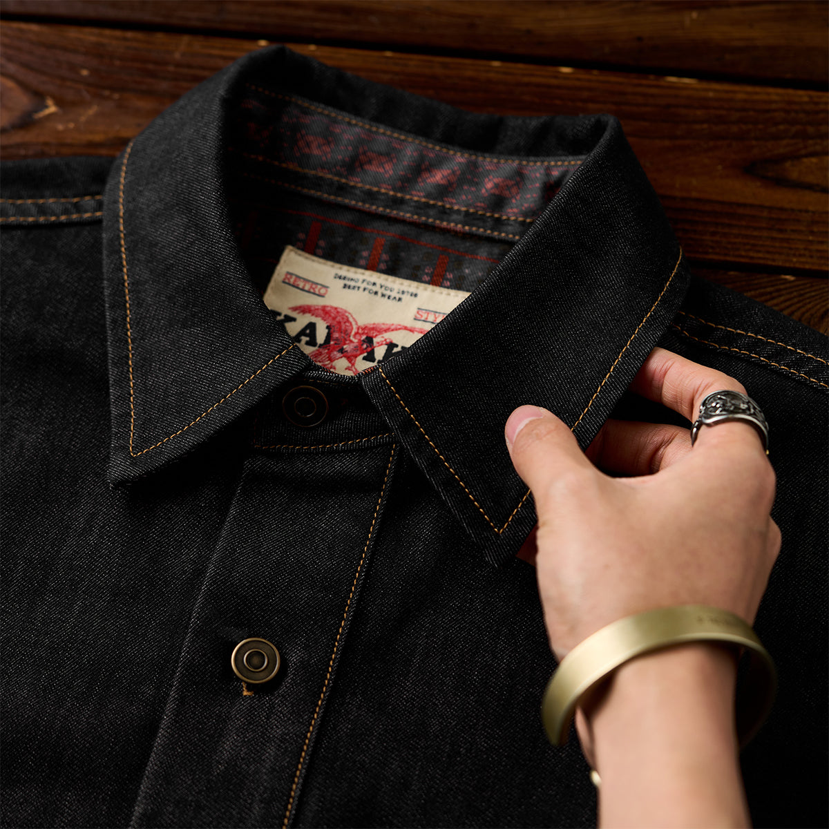 【사전예약】「Karaku」자수 빨간 매듭 끈 워싱 데님 오픈 카라 셔츠