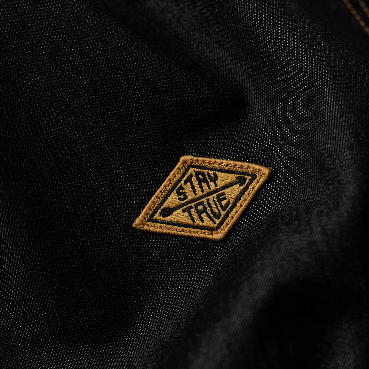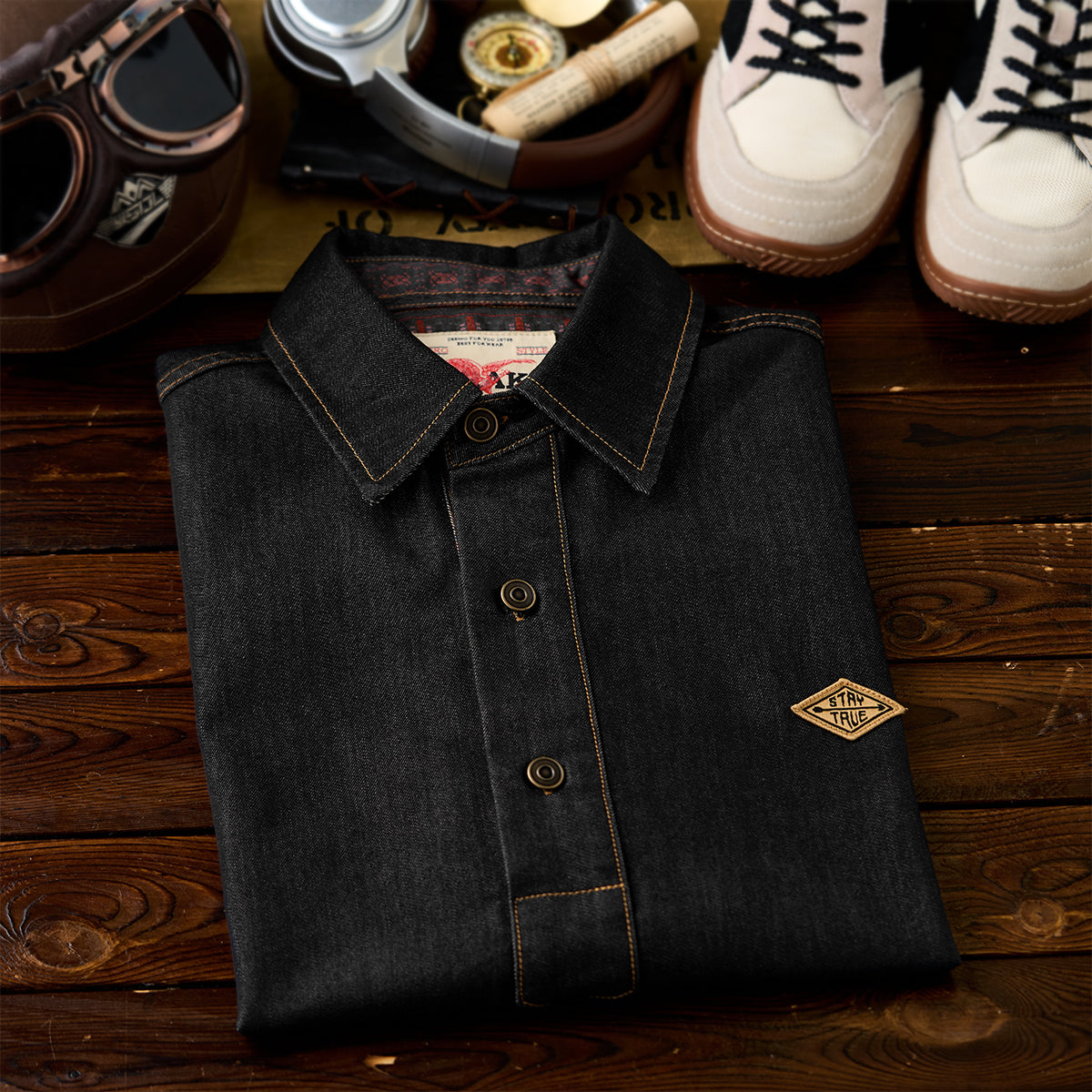 「STAY TRUE」자수 와펜 뒷면 에스닉 무드 프린트 하프 버튼 반소매 데님 셔츠