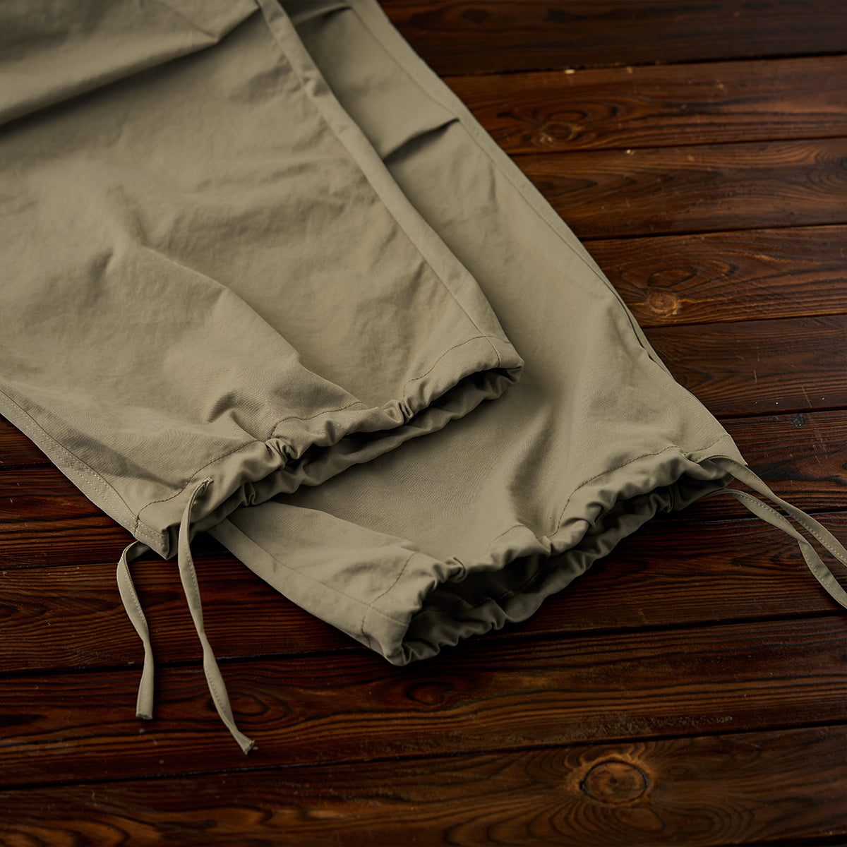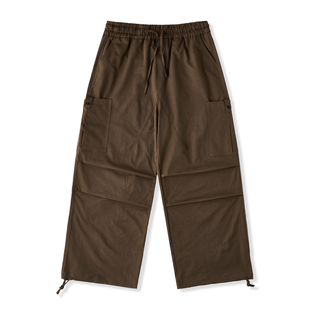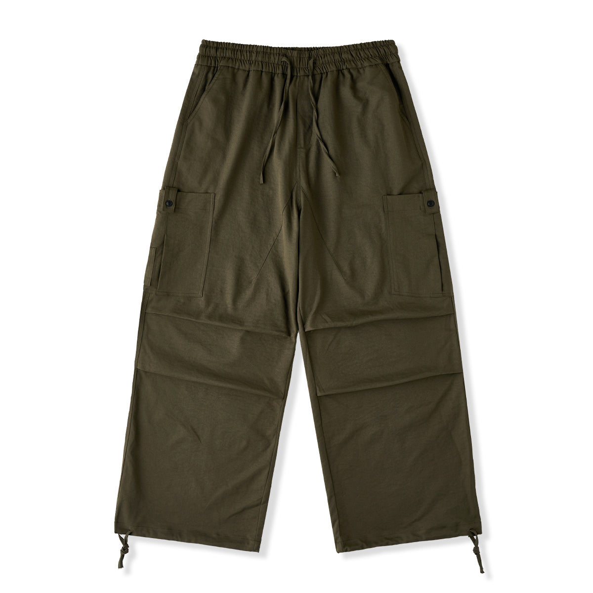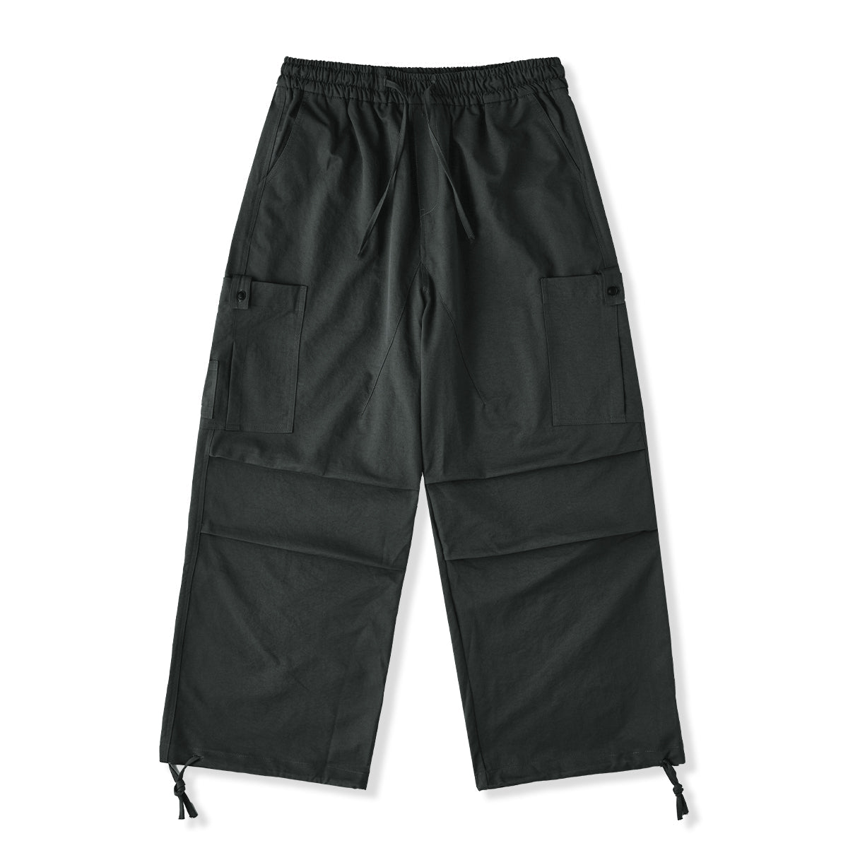 밀리터리 패러슈트 팬츠를 모티브로 한 카고 이지 팬츠. 무릎 턱 디테일과 밑단 스트링으로 입체적이고 자유로운 실루엣을 연출하며, 밴딩 허리와 카고 포켓으로 착용감과 실용성을 높였습니다.
