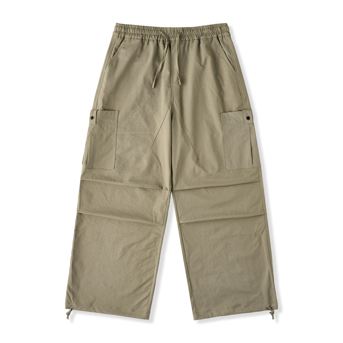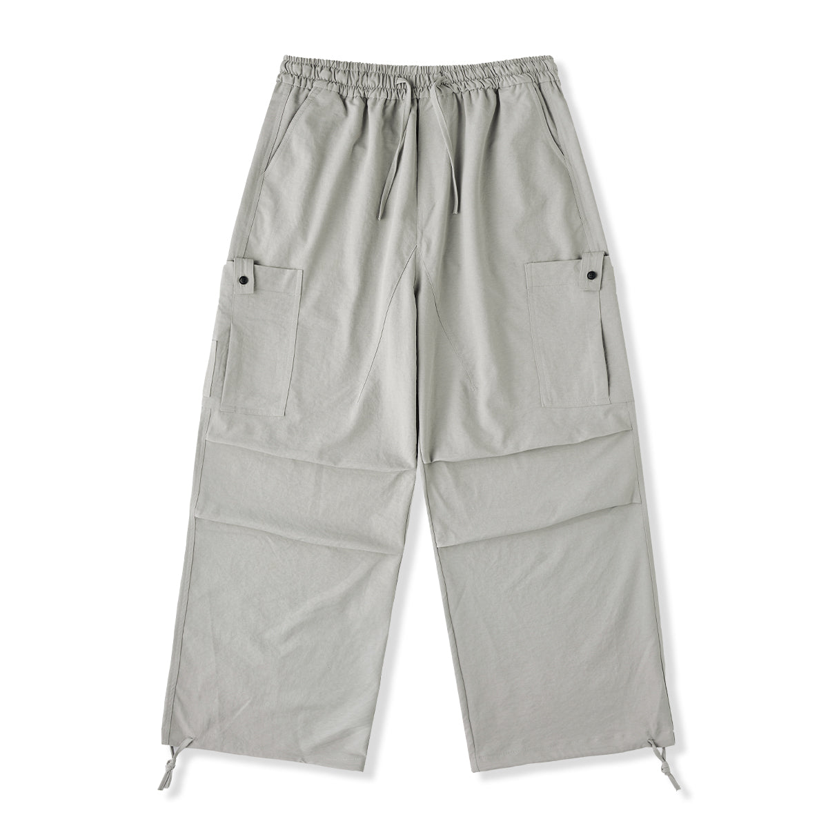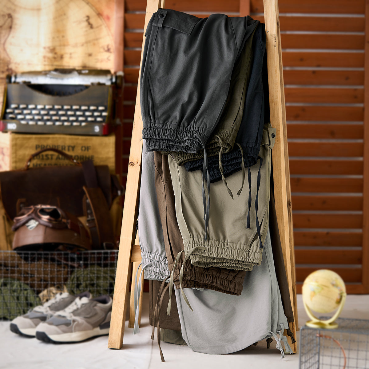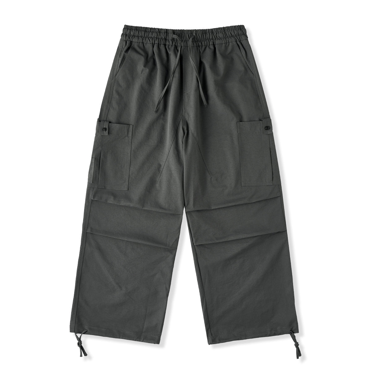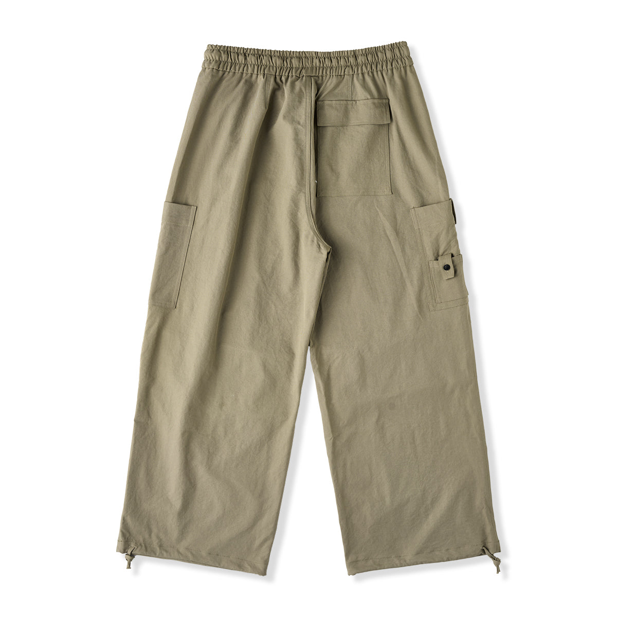 밀리터리 패러슈트 팬츠를 모티브로 한 카고 이지 팬츠. 무릎 턱 디테일과 밑단 스트링으로 입체적이고 자유로운 실루엣을 연출하며, 밴딩 허리와 카고 포켓으로 착용감과 실용성을 높였습니다.