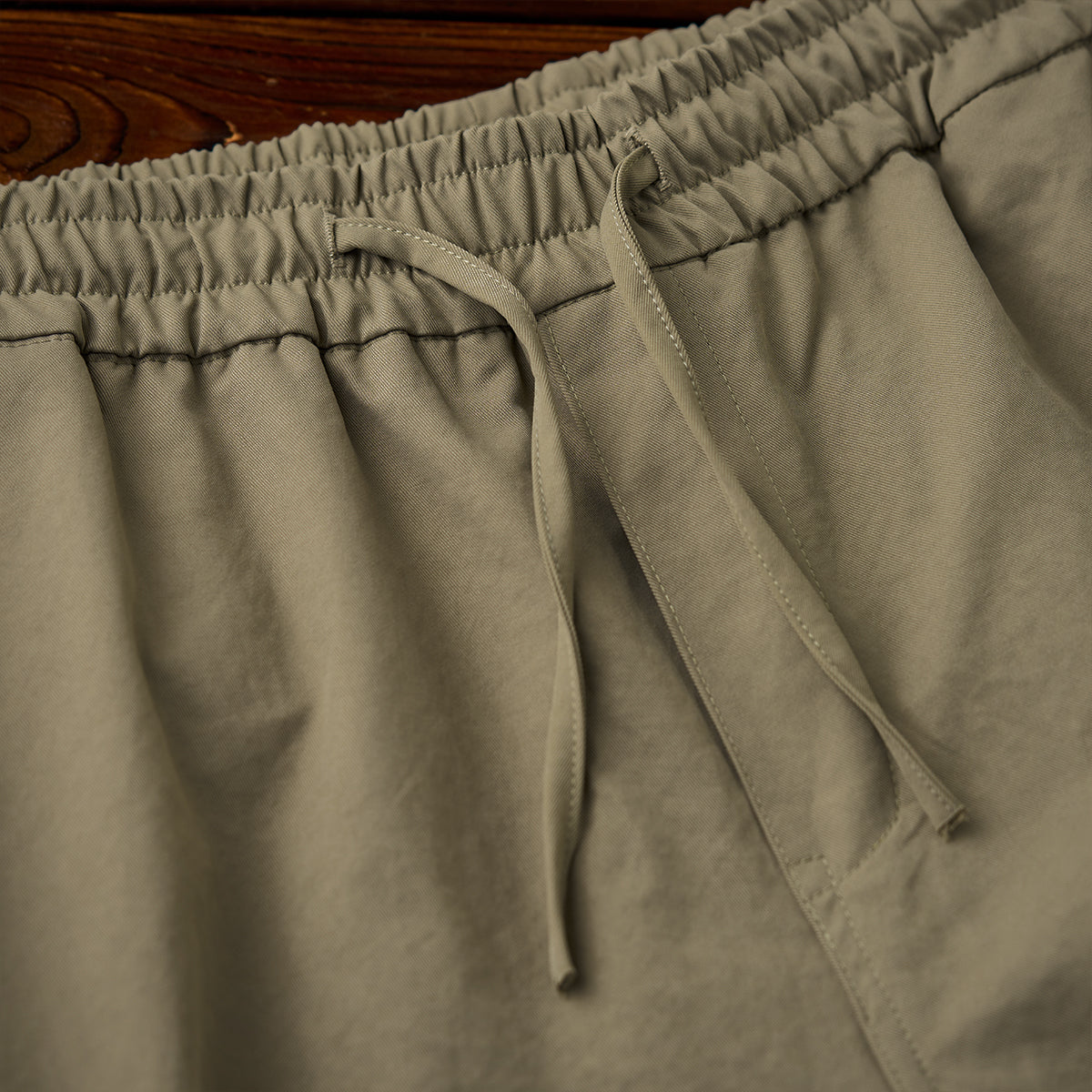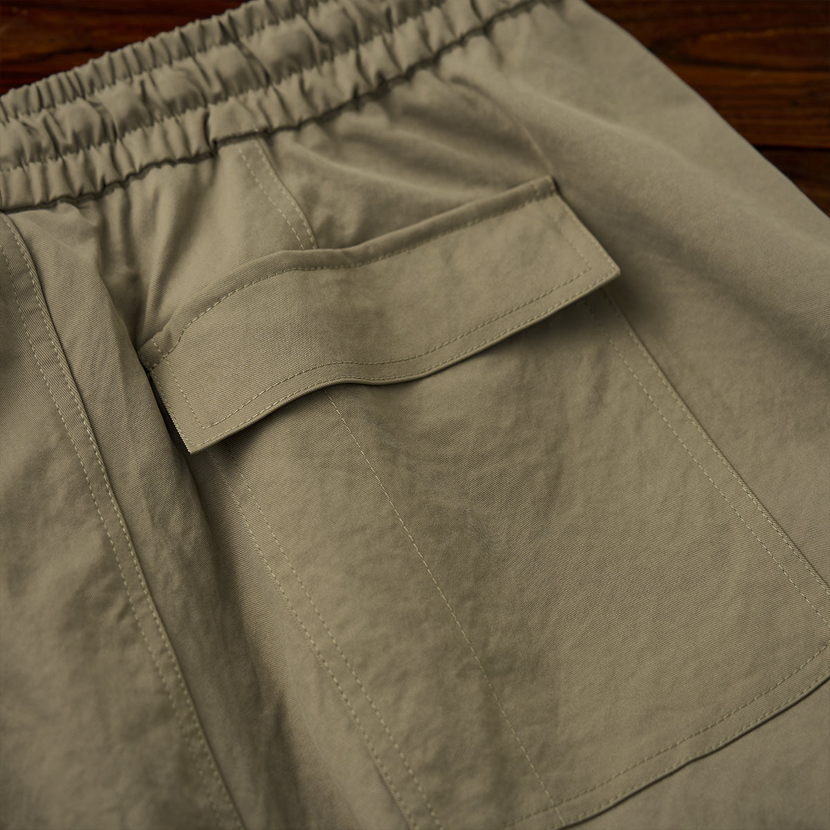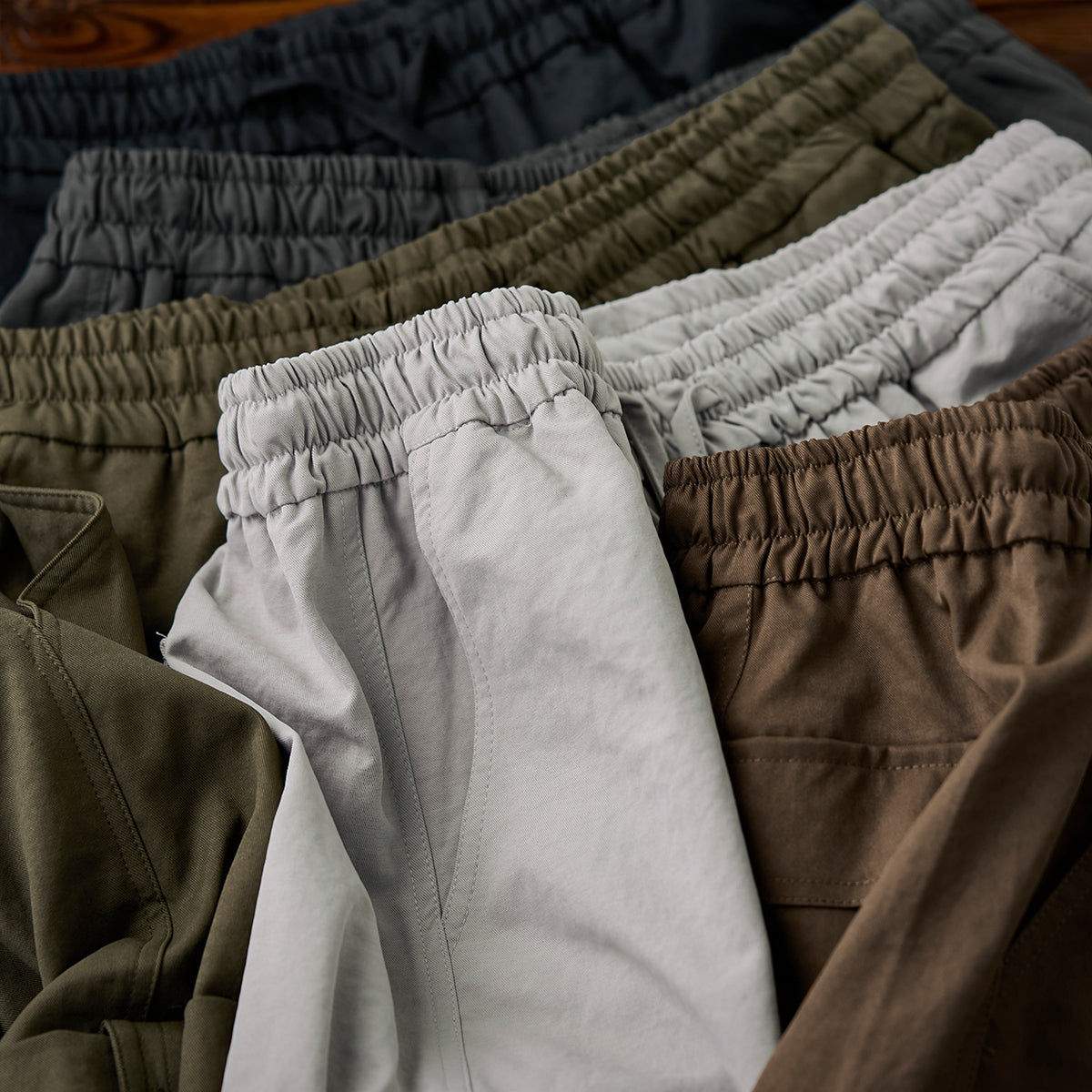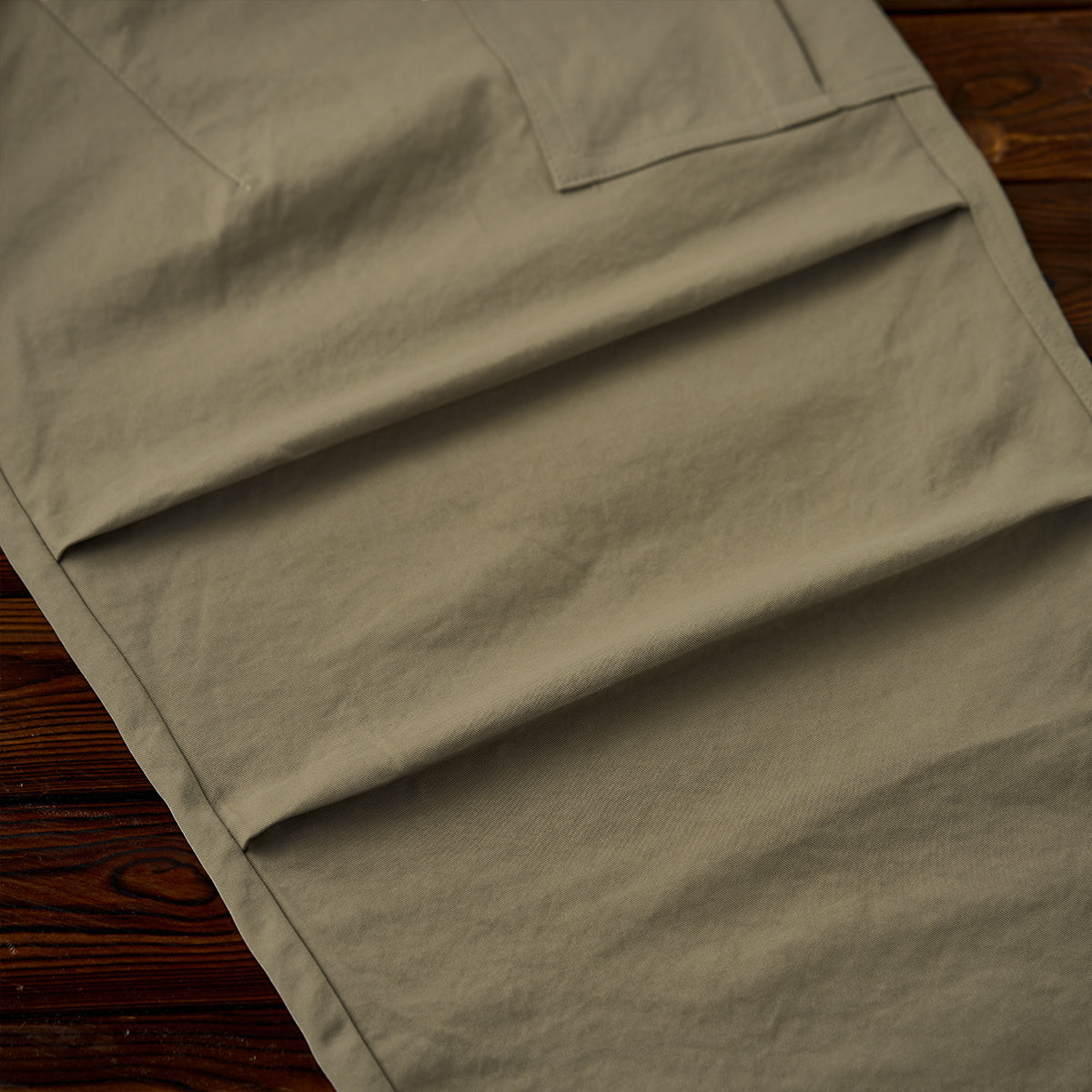 밀리터리 패러슈트 팬츠를 모티브로 한 카고 이지 팬츠. 무릎 턱 디테일과 밑단 스트링으로 입체적이고 자유로운 실루엣을 연출하며, 밴딩 허리와 카고 포켓으로 착용감과 실용성을 높였습니다.