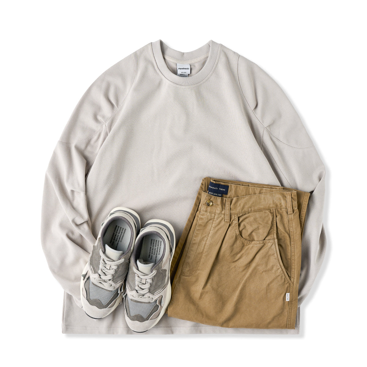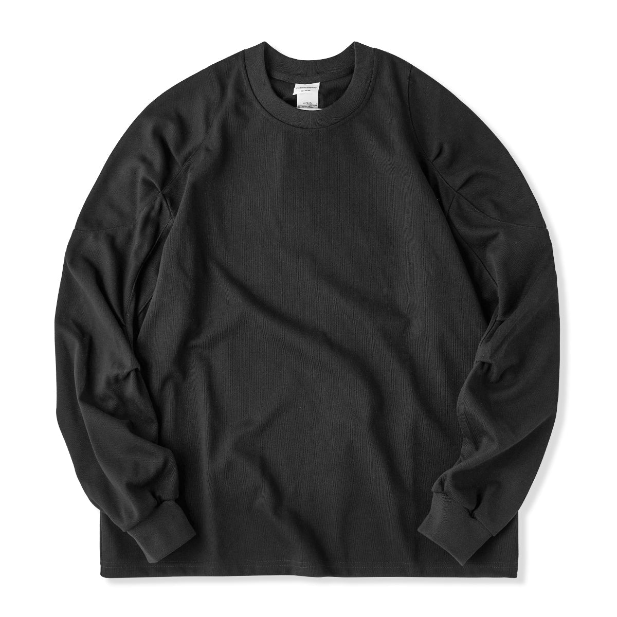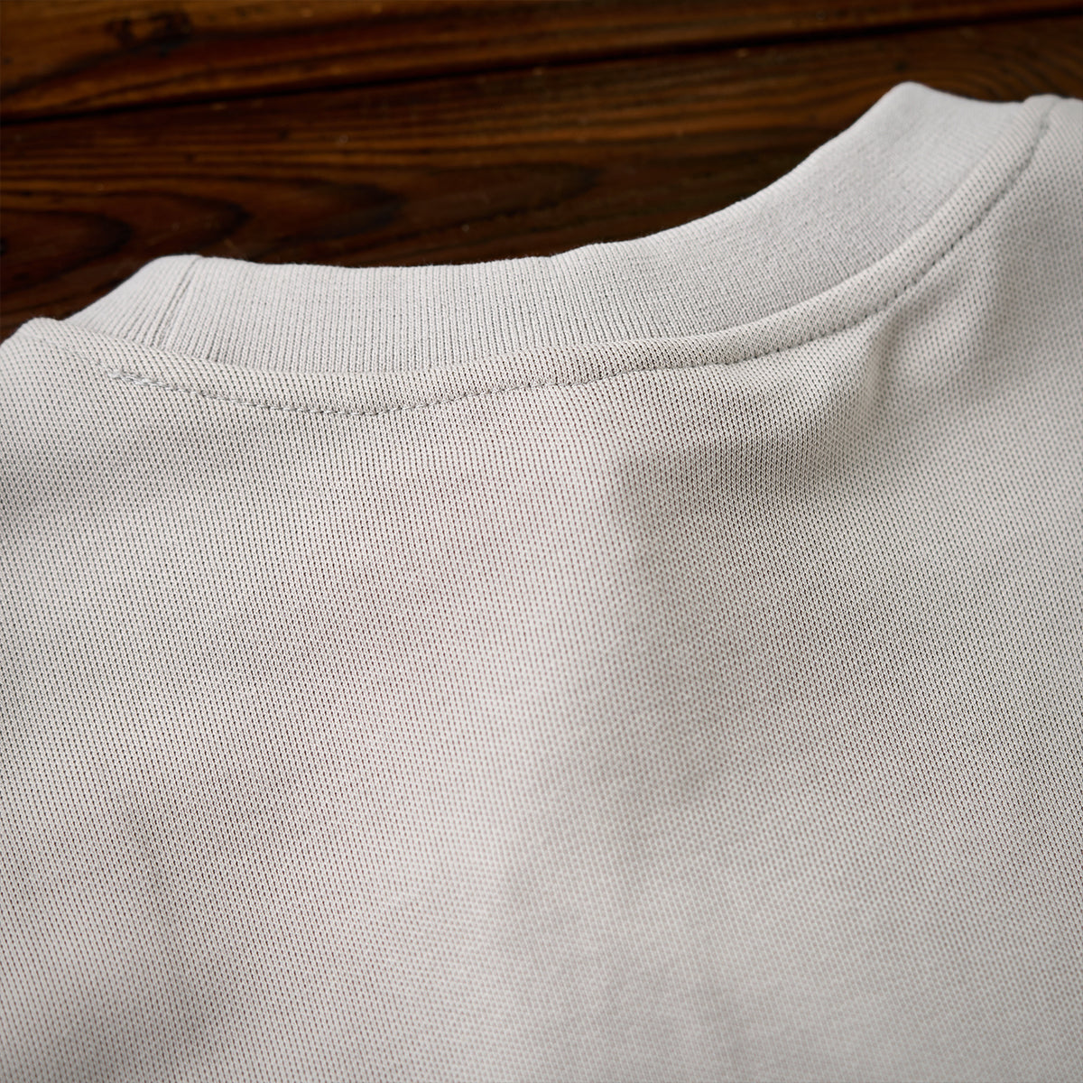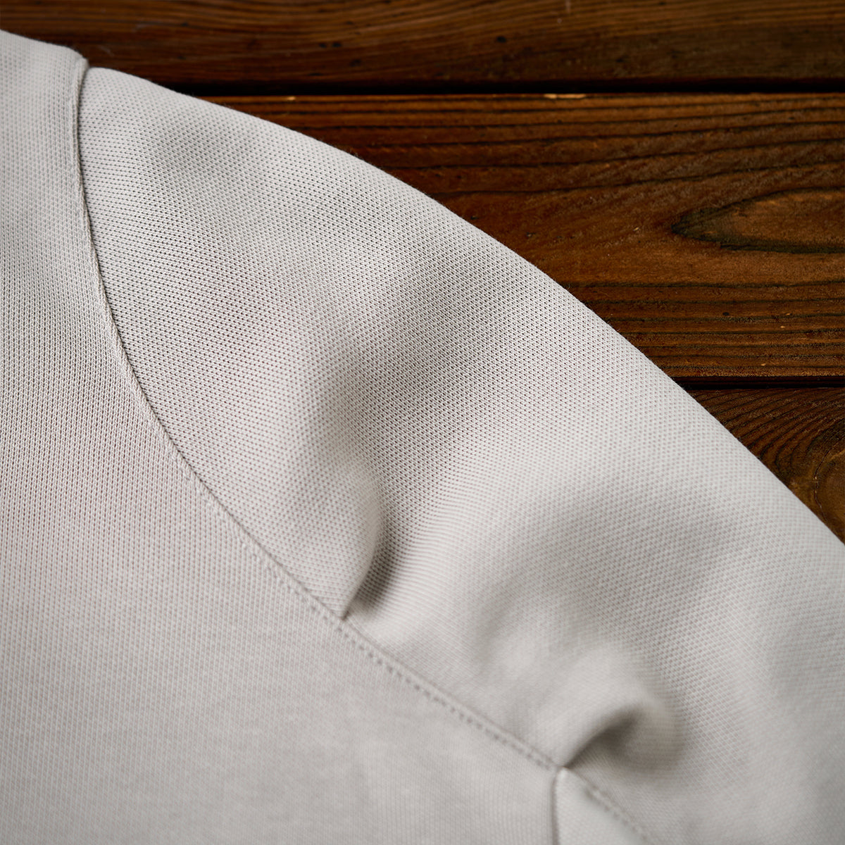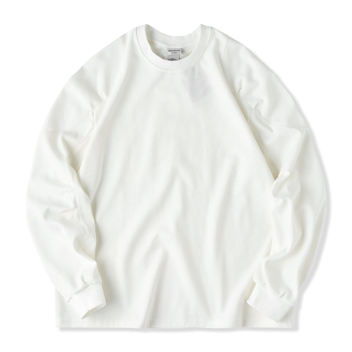 래글런 느낌의 곡선형 어깨 절개로 입체감을 살린 디자인으로 활동성과 스타일을 동시에 잡은 스웨트셔츠.