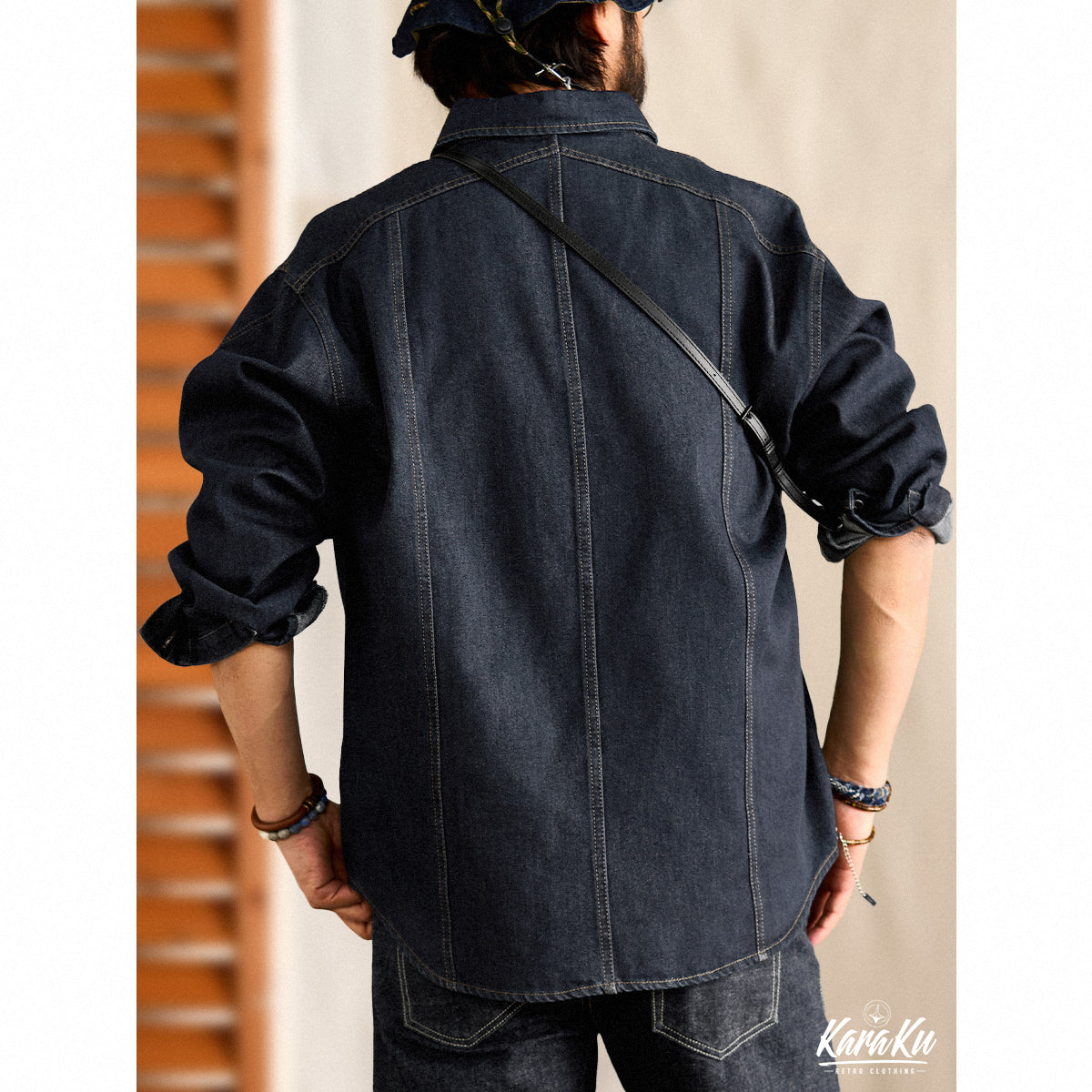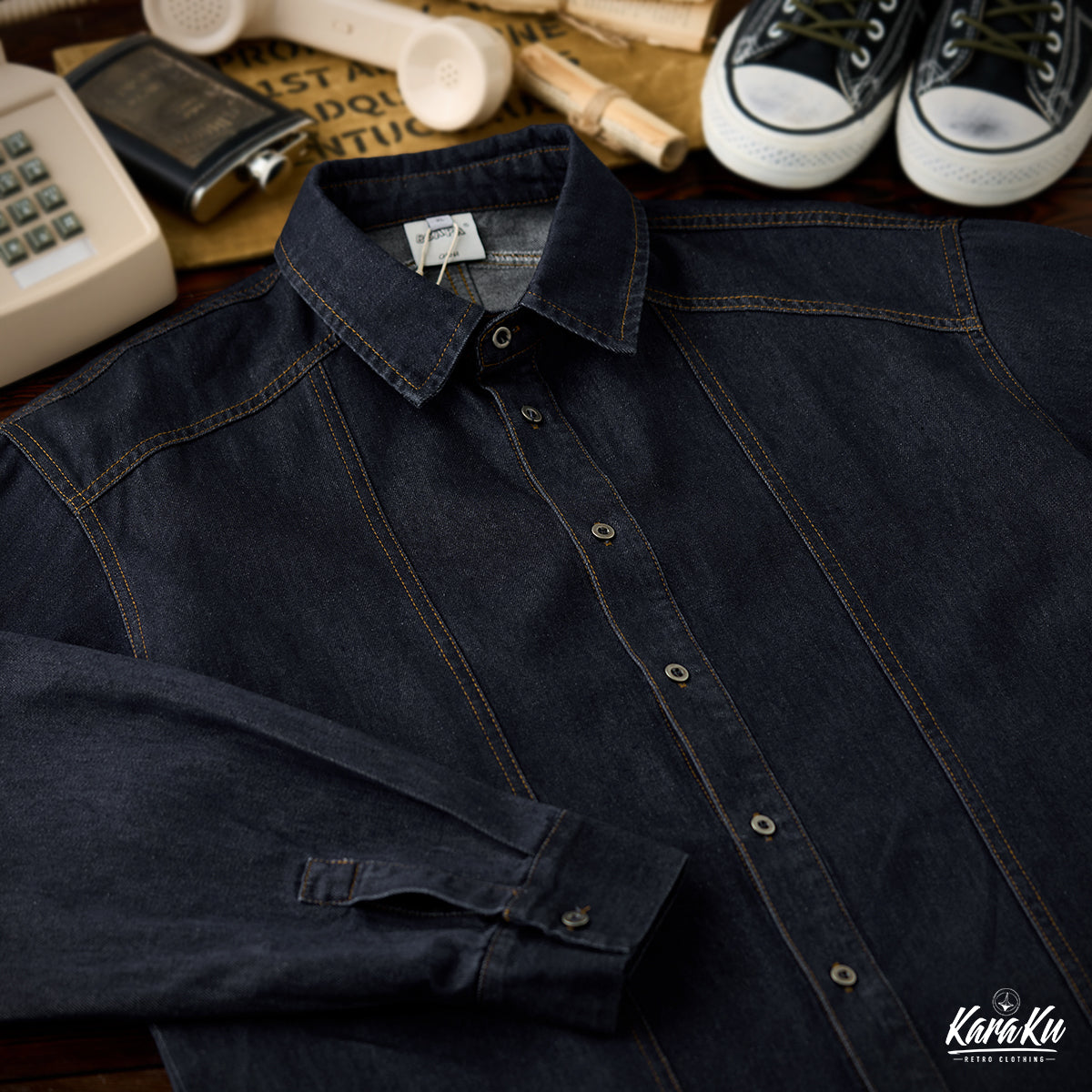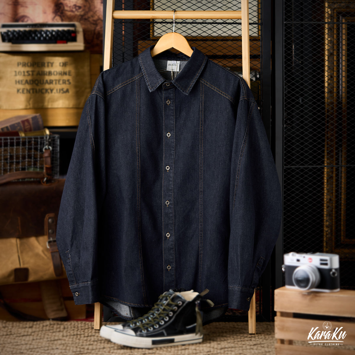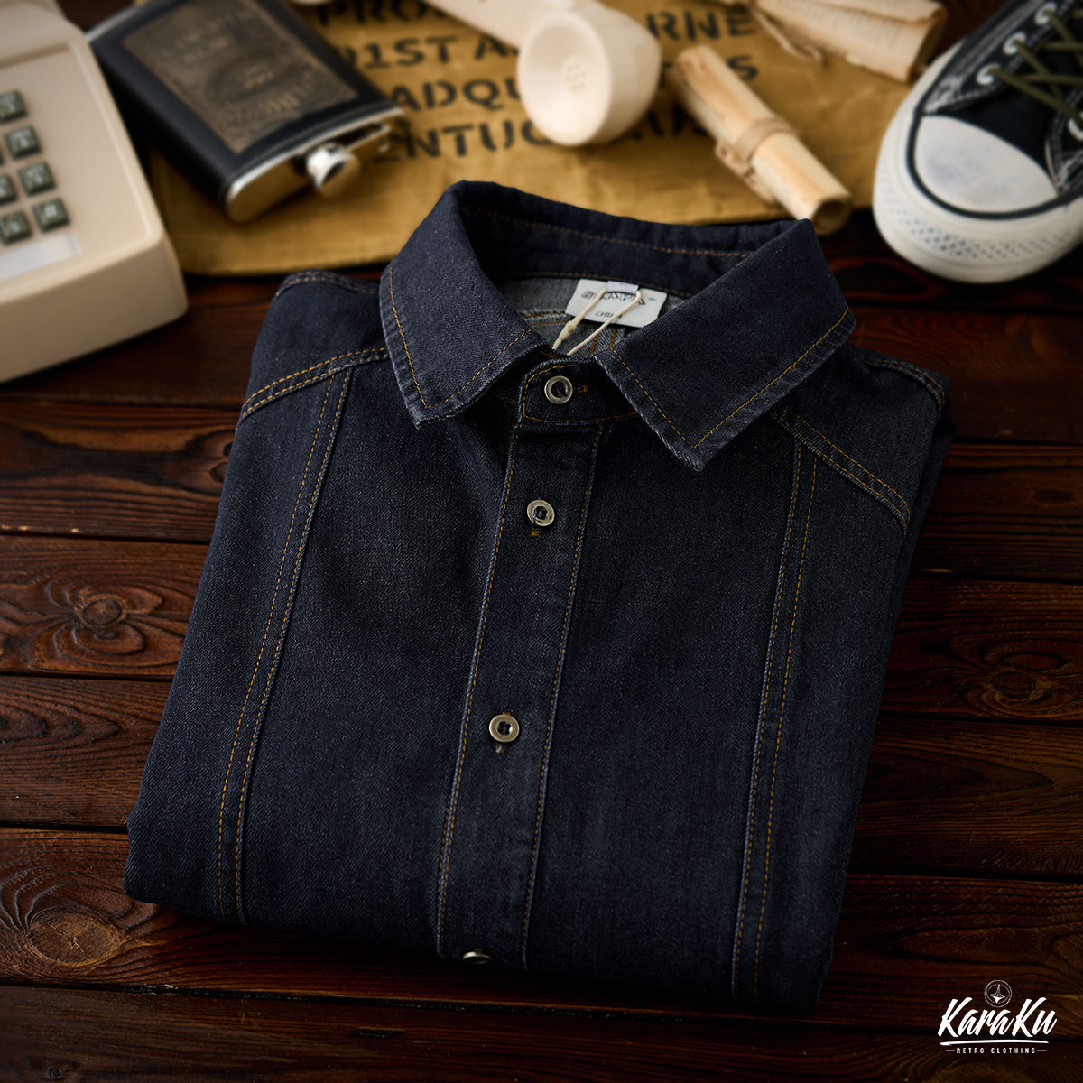 A denim shirt that combines vintage and modern styles with three-dimensional cutting and contrast stitching.