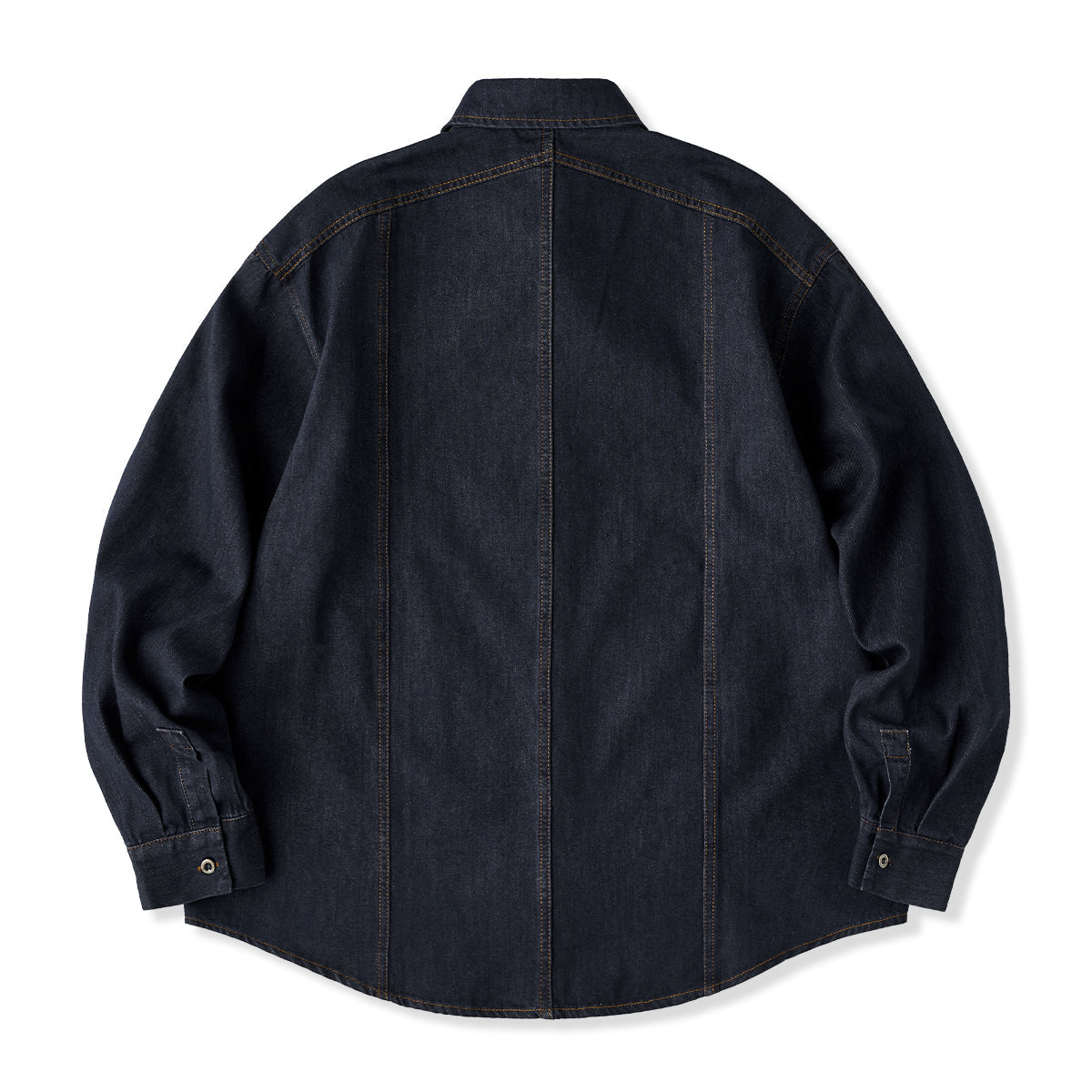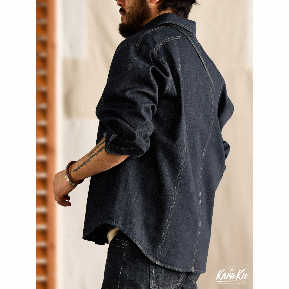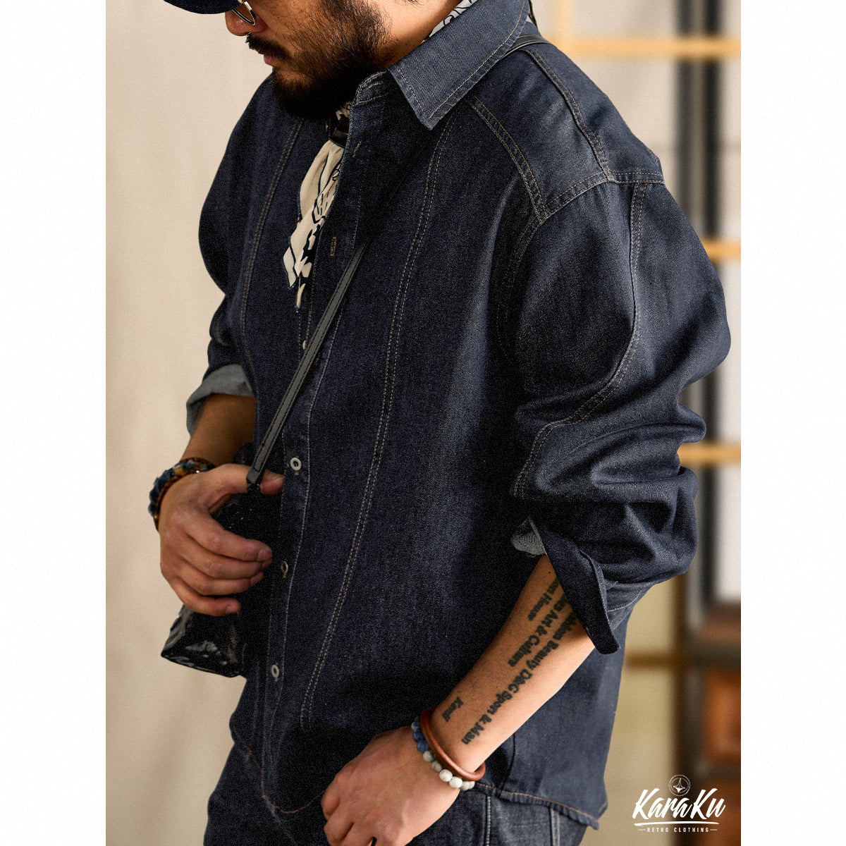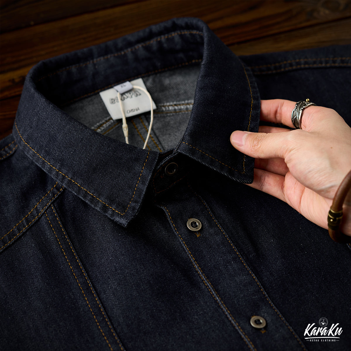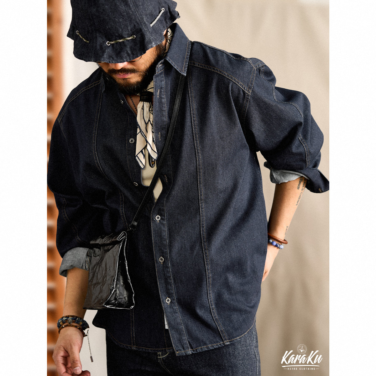 A denim shirt that combines vintage and modern styles with three-dimensional cutting and contrast stitching.