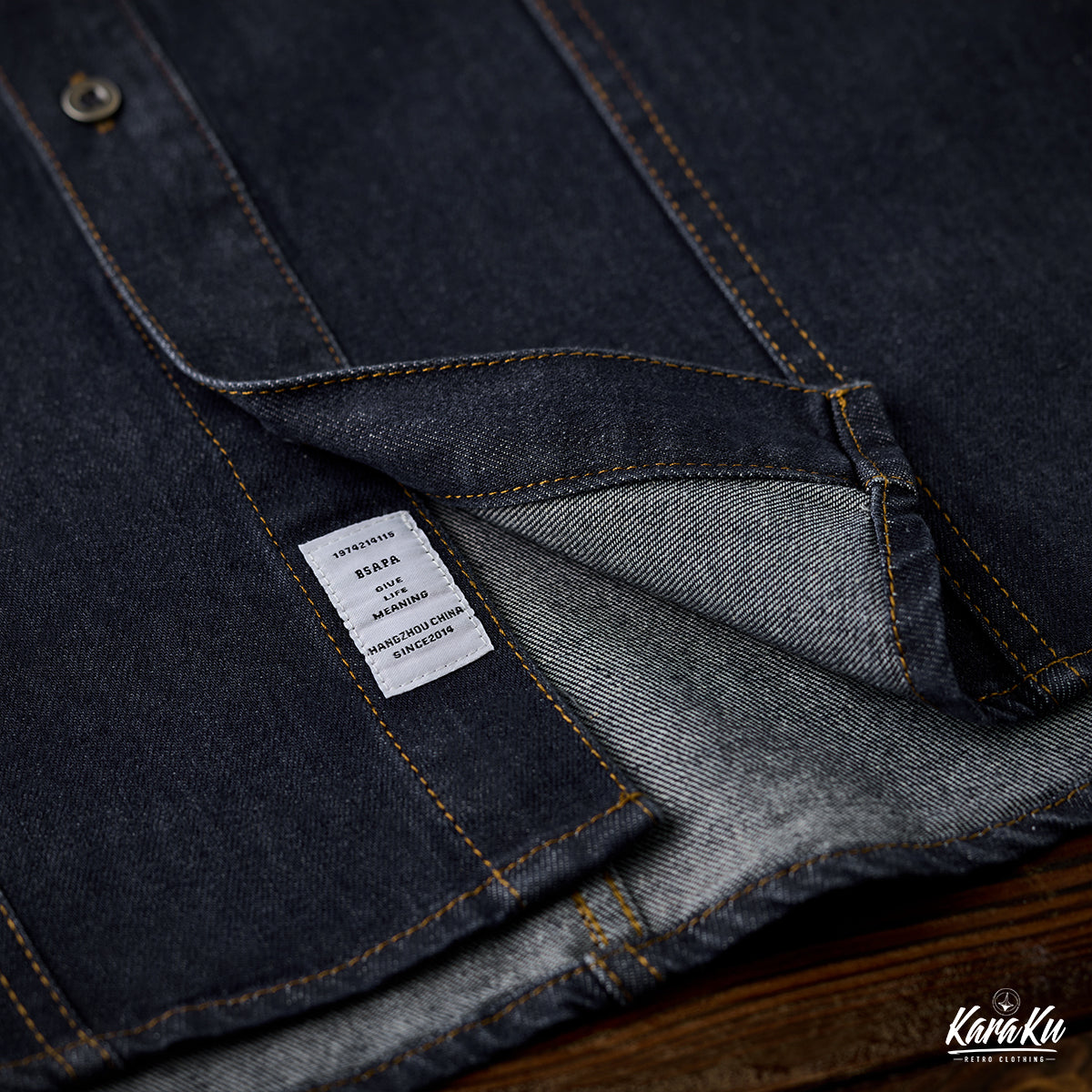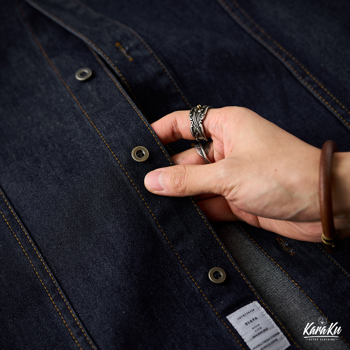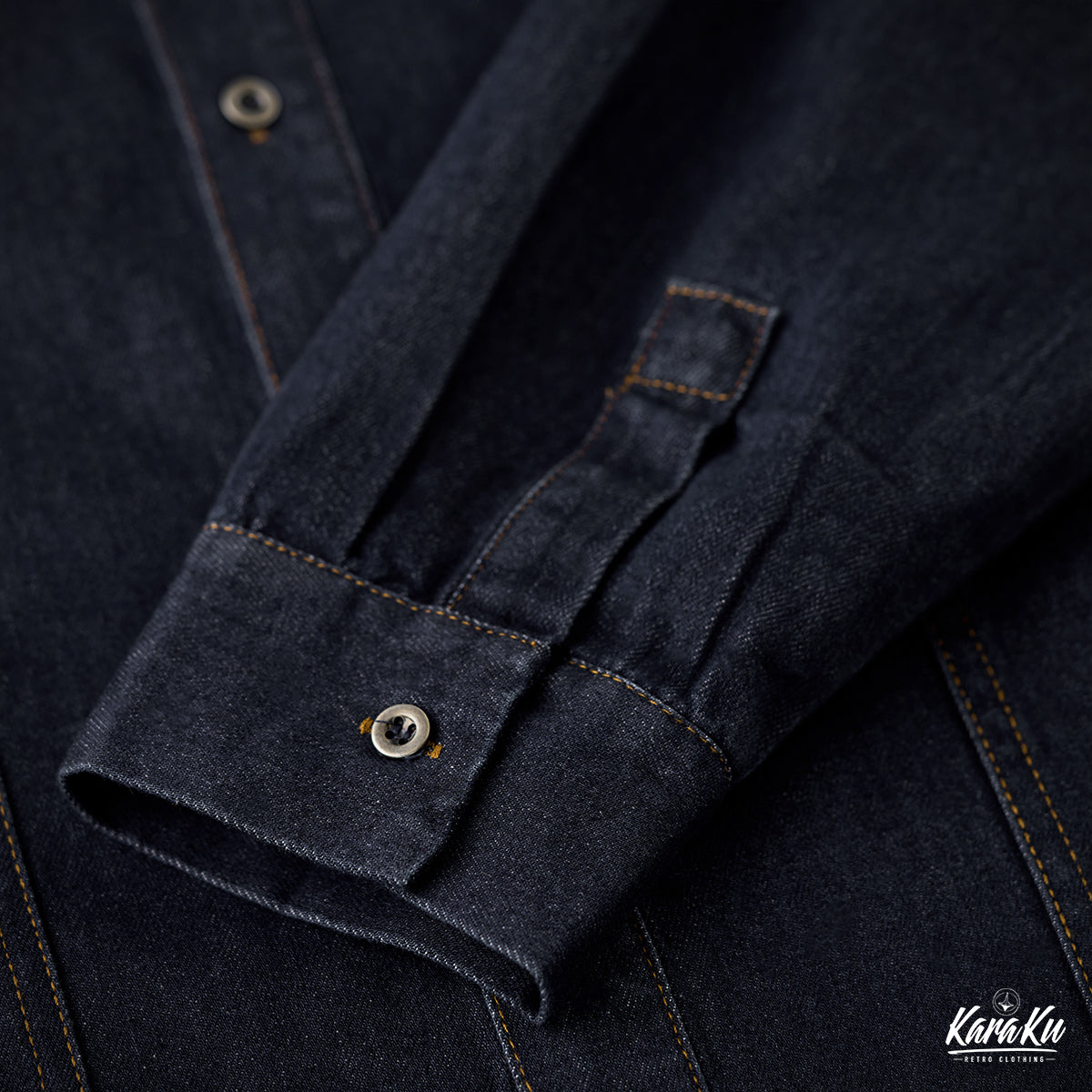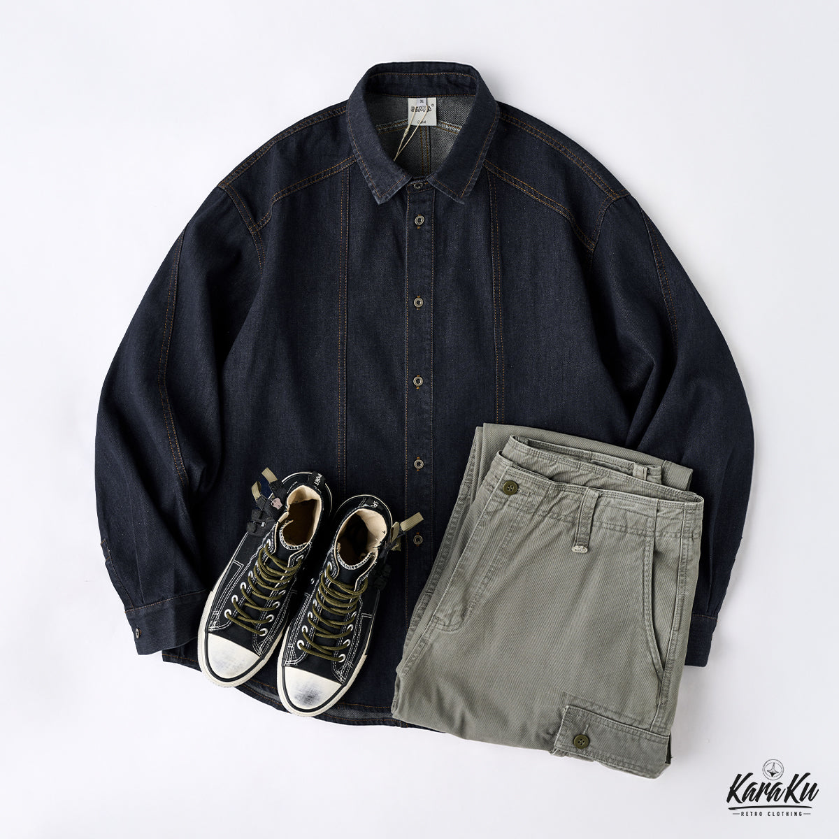 A denim shirt that combines vintage and modern styles with three-dimensional cutting and contrast stitching.