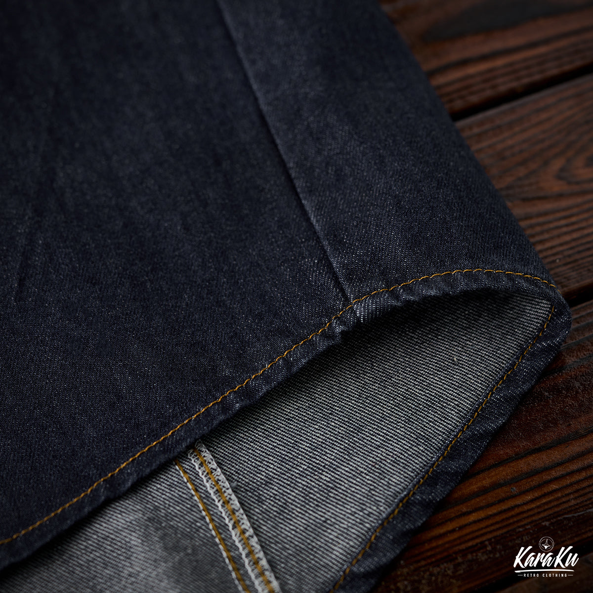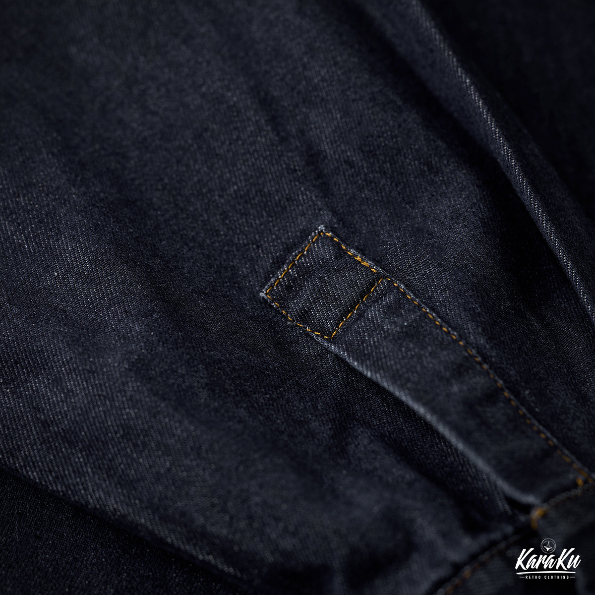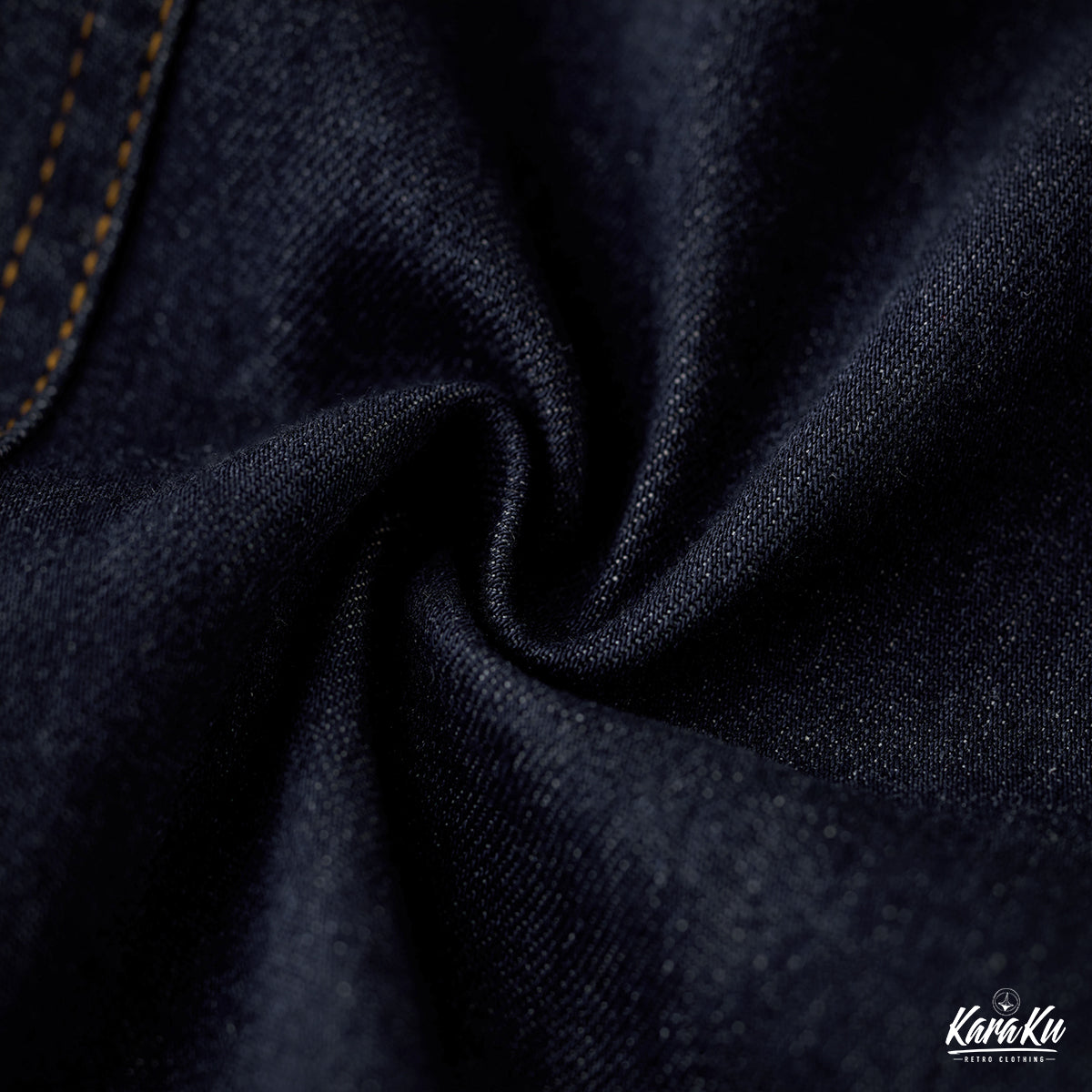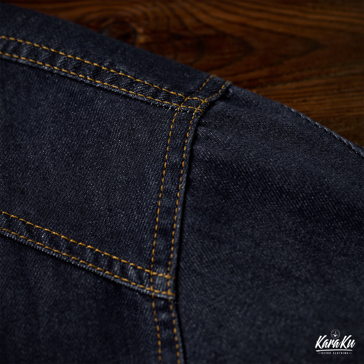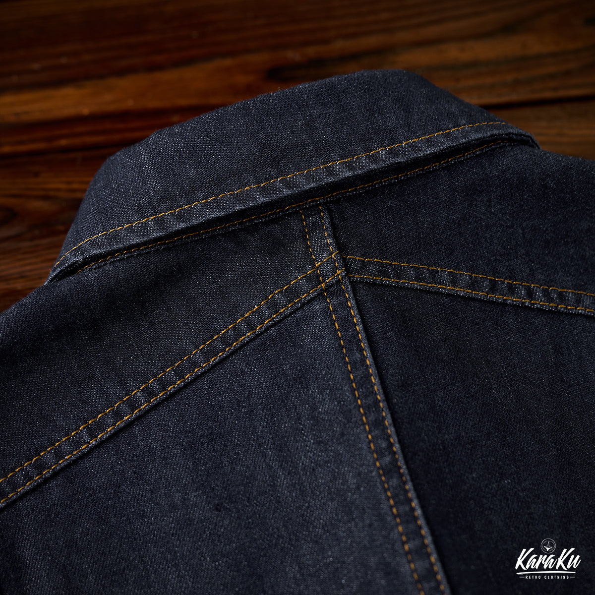 A denim shirt that combines vintage and modern styles with three-dimensional cutting and contrast stitching.