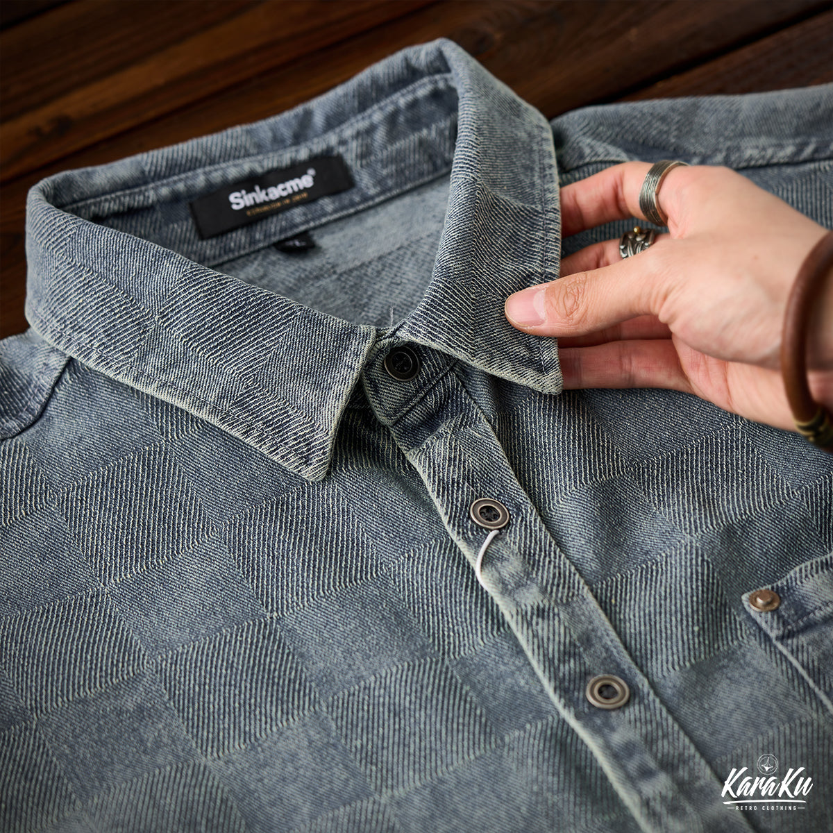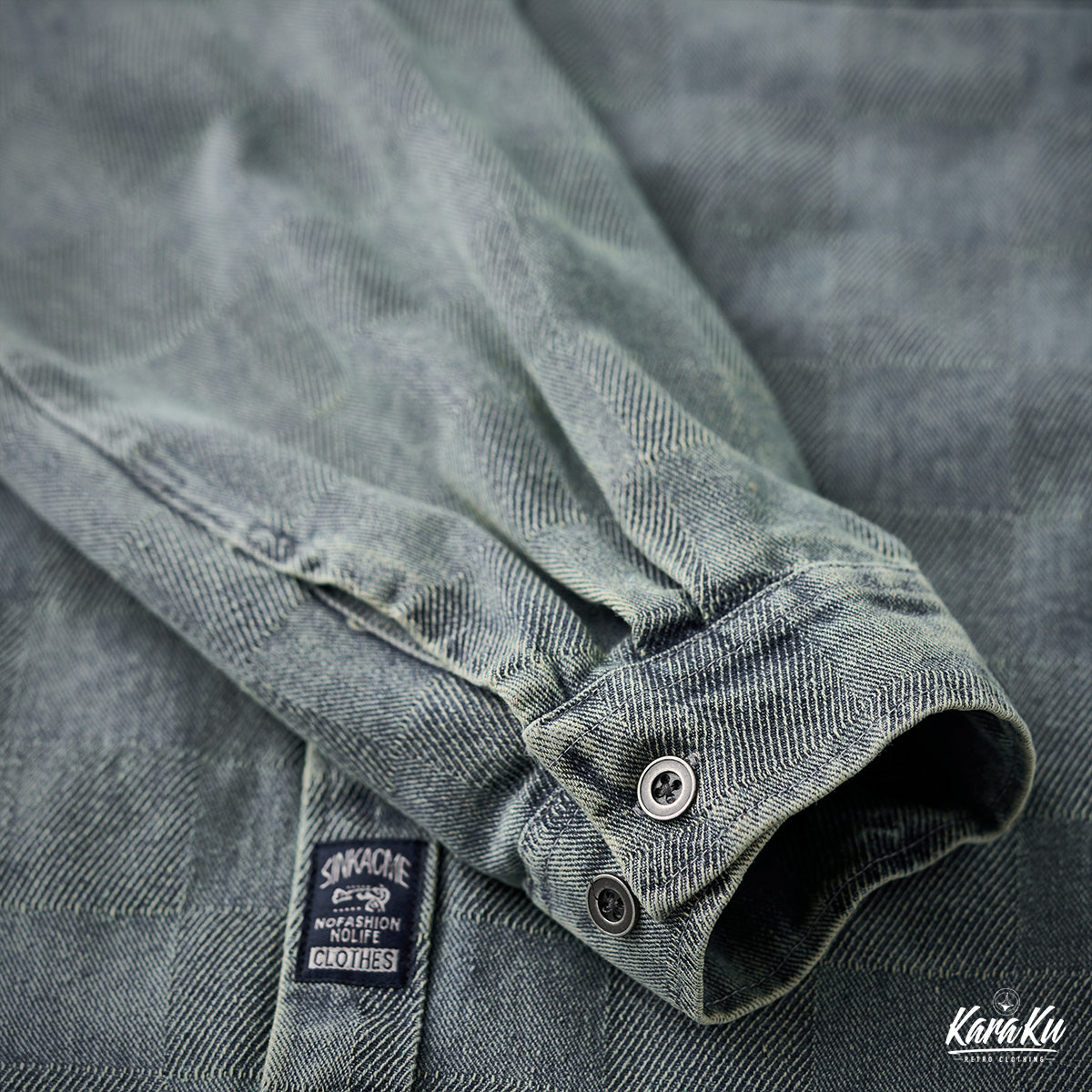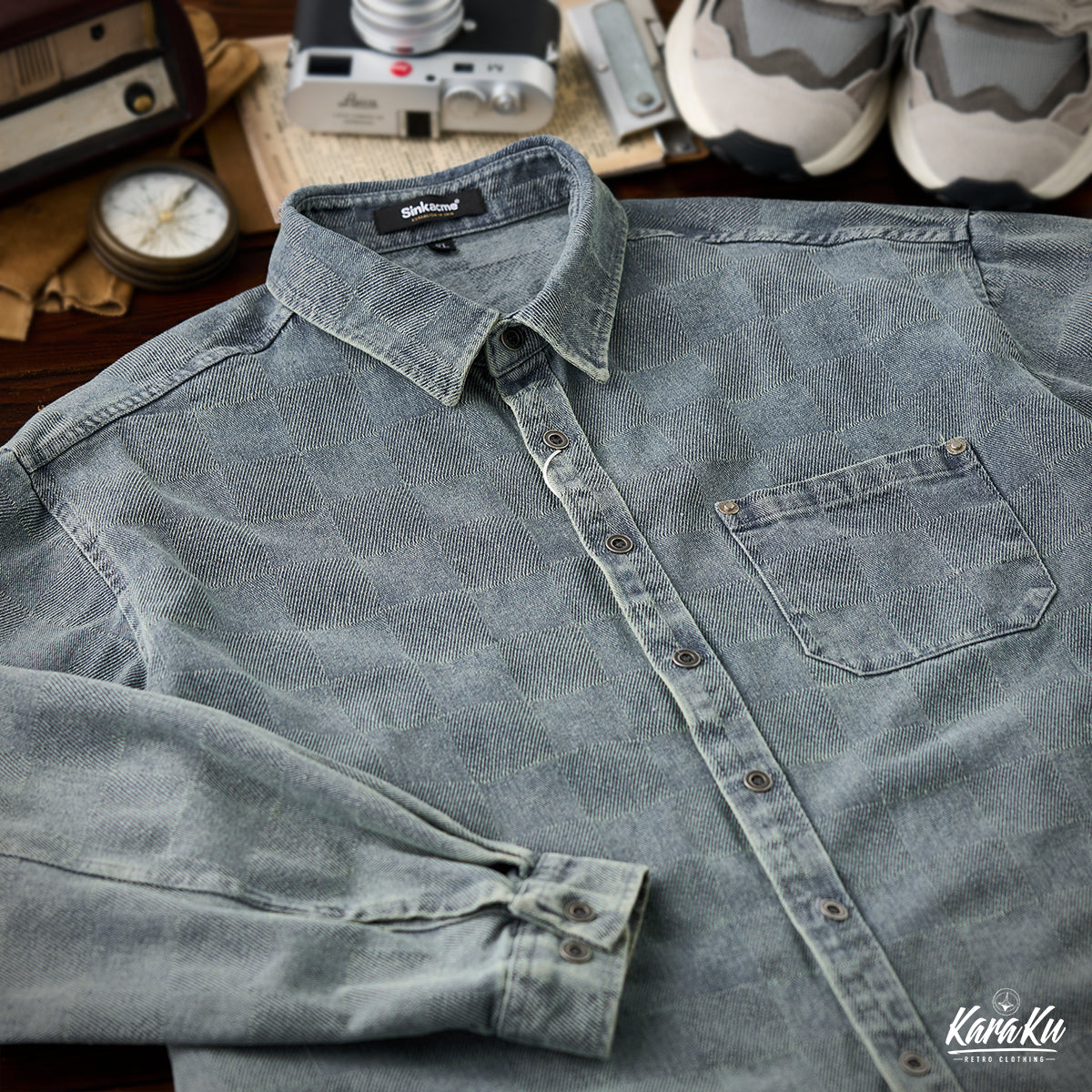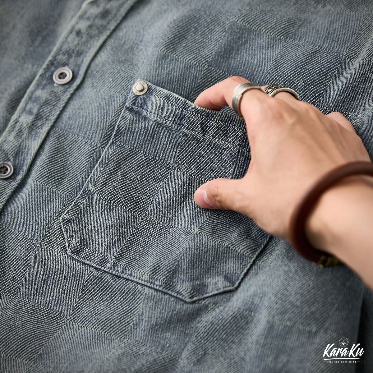 This product features a check pattern created through a knit weave that adds a subtle three-dimensional feel and a luxurious feel. It stands out with its unique design that sets it apart from regular denim shirts.