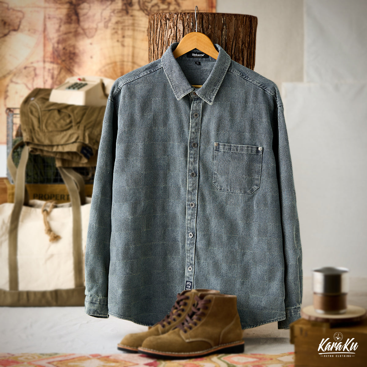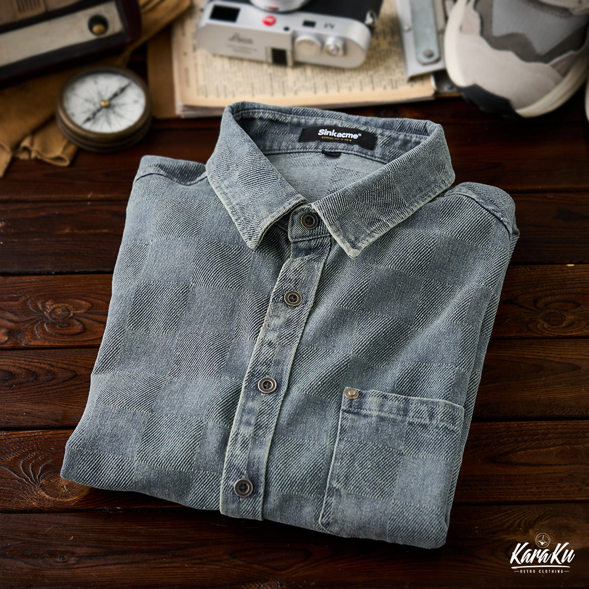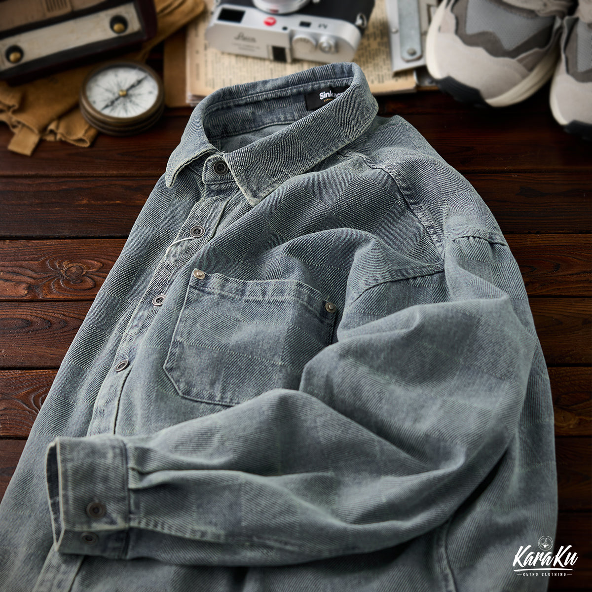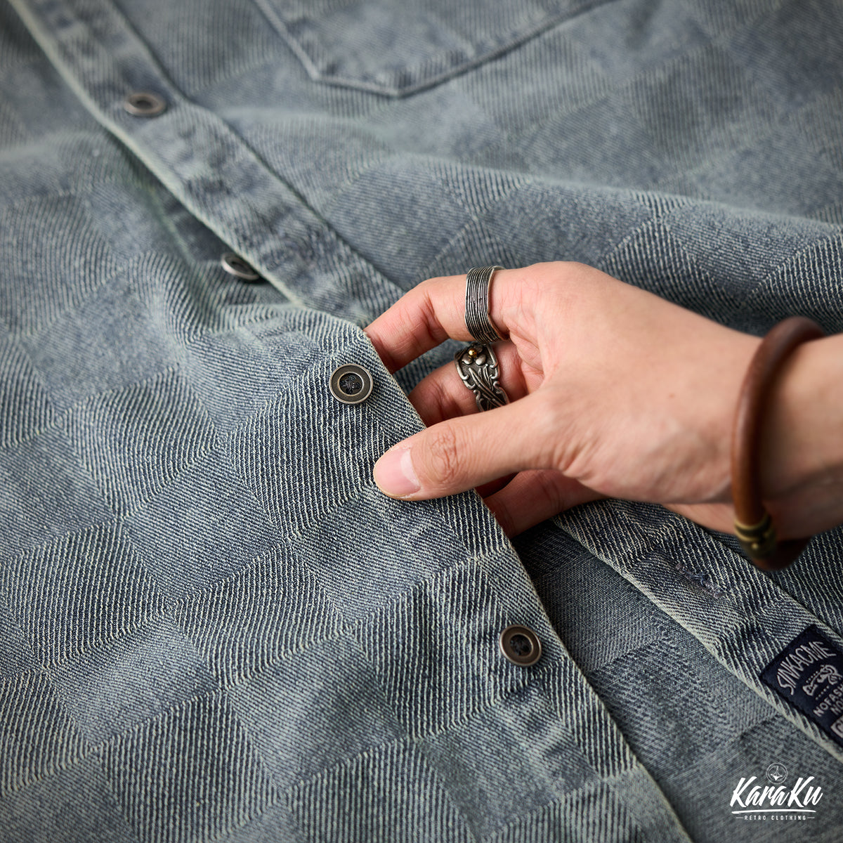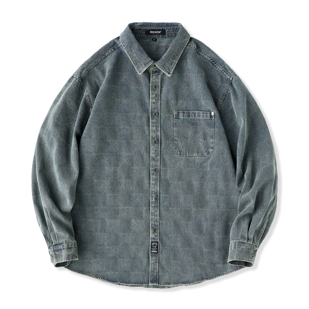This product features a check pattern created through a knit weave that adds a subtle three-dimensional feel and a luxurious feel. It stands out with its unique design that sets it apart from regular denim shirts.