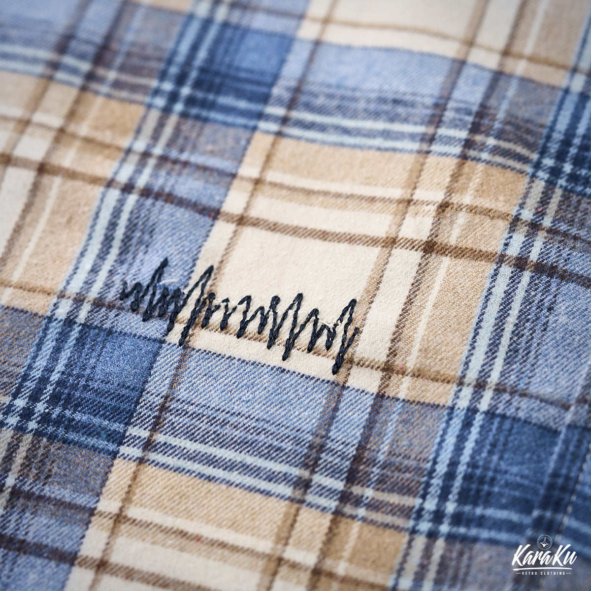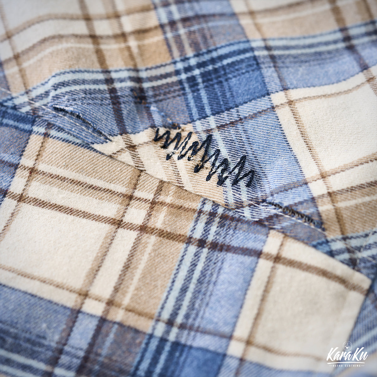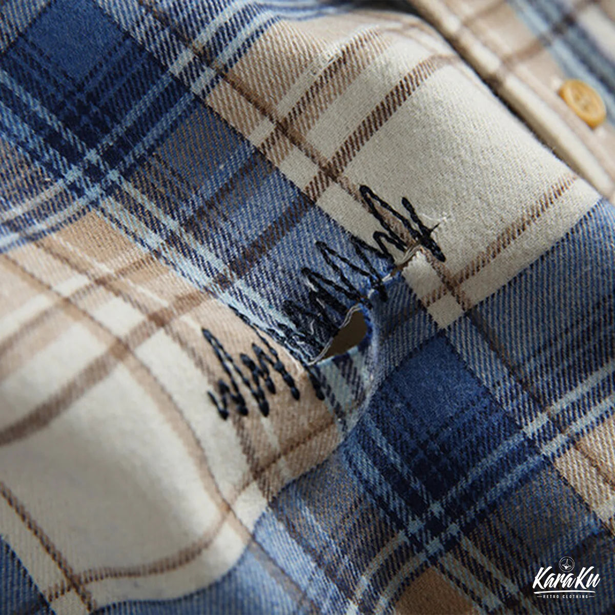 A vintage check work shirt with handmade distressing and jagged stitching for a unique twist.