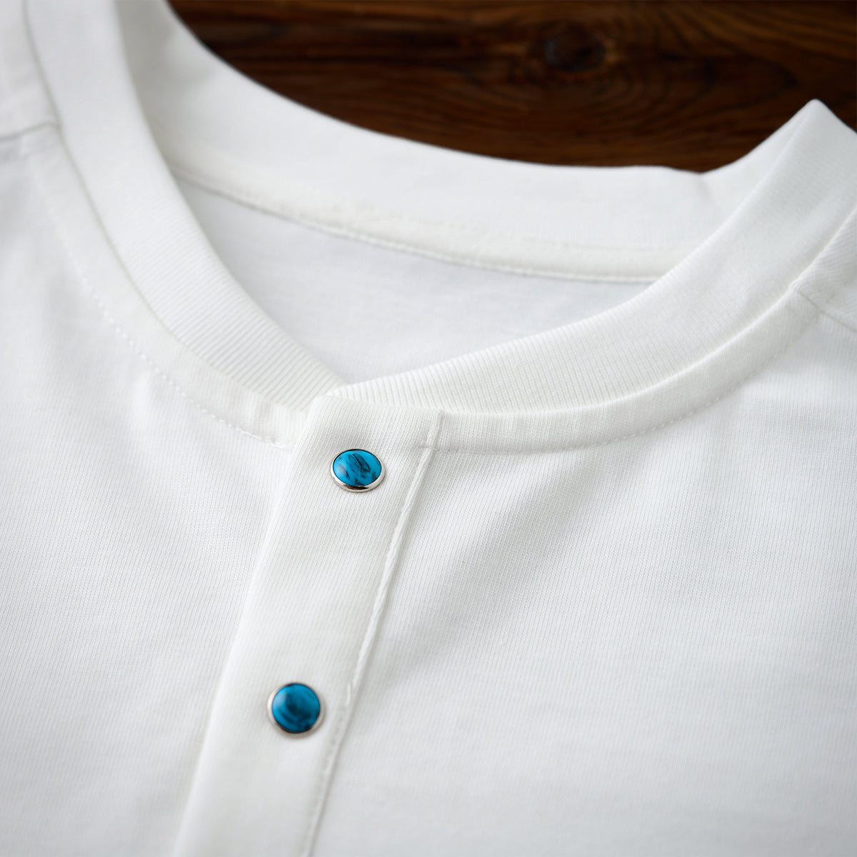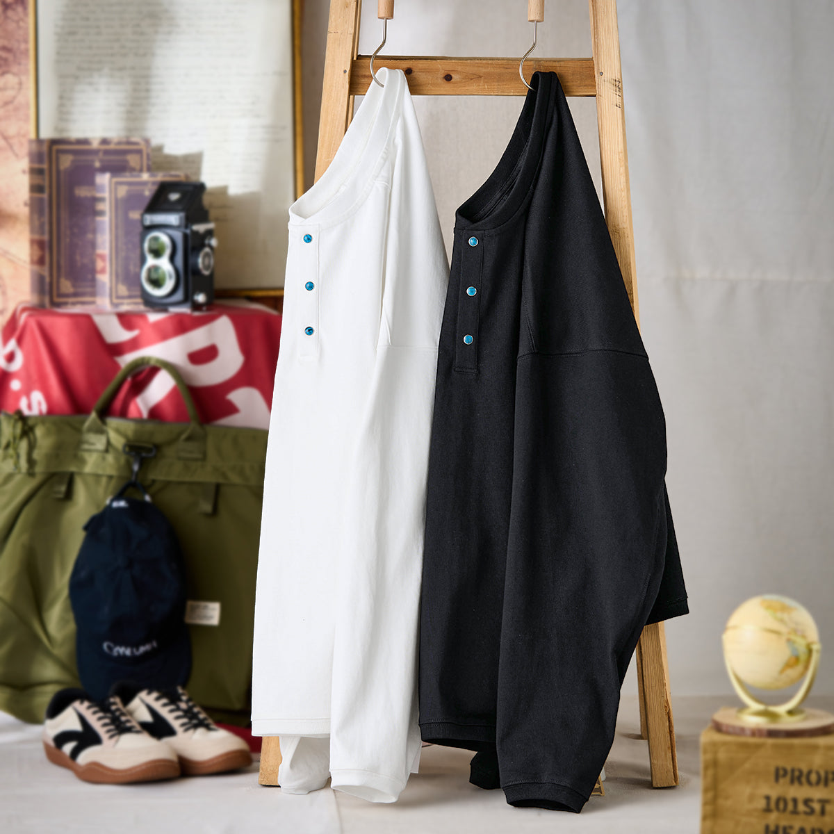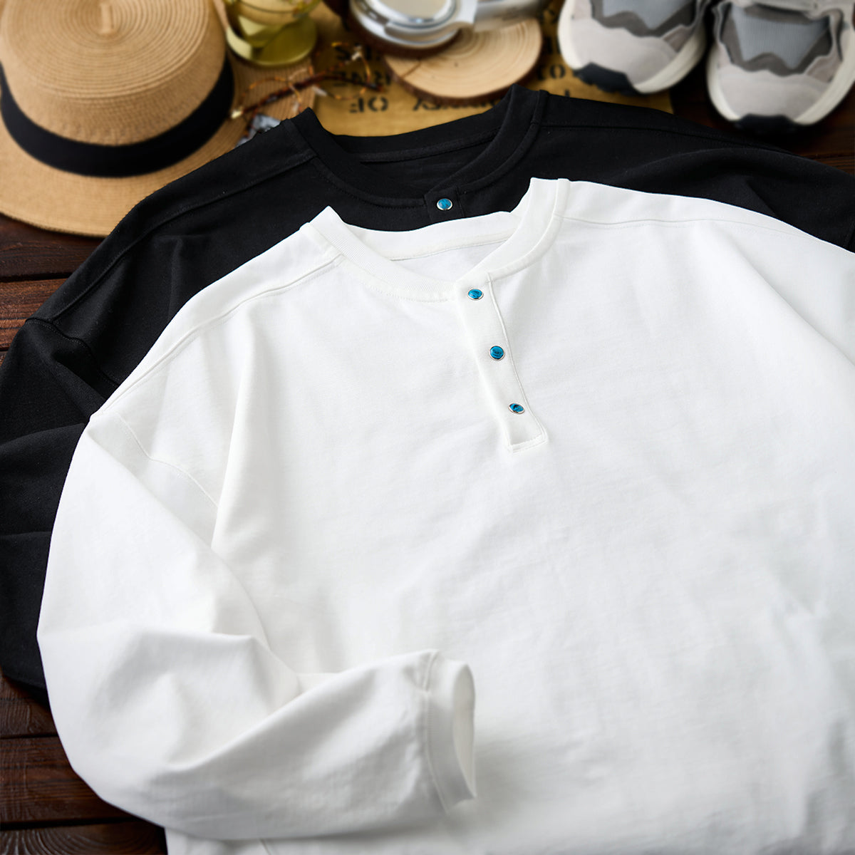 헨리넥과 드롭 숄더 디자인이 돋보이는 롱 티셔츠로, 터키석 단추가 포인트를 더하며 화이트와 블랙 두 가지 컬러로 다양한 하의와 손쉽게 코디할 수 있습니다.