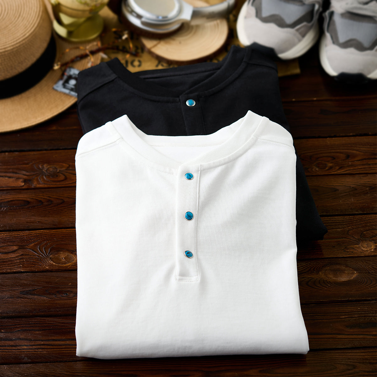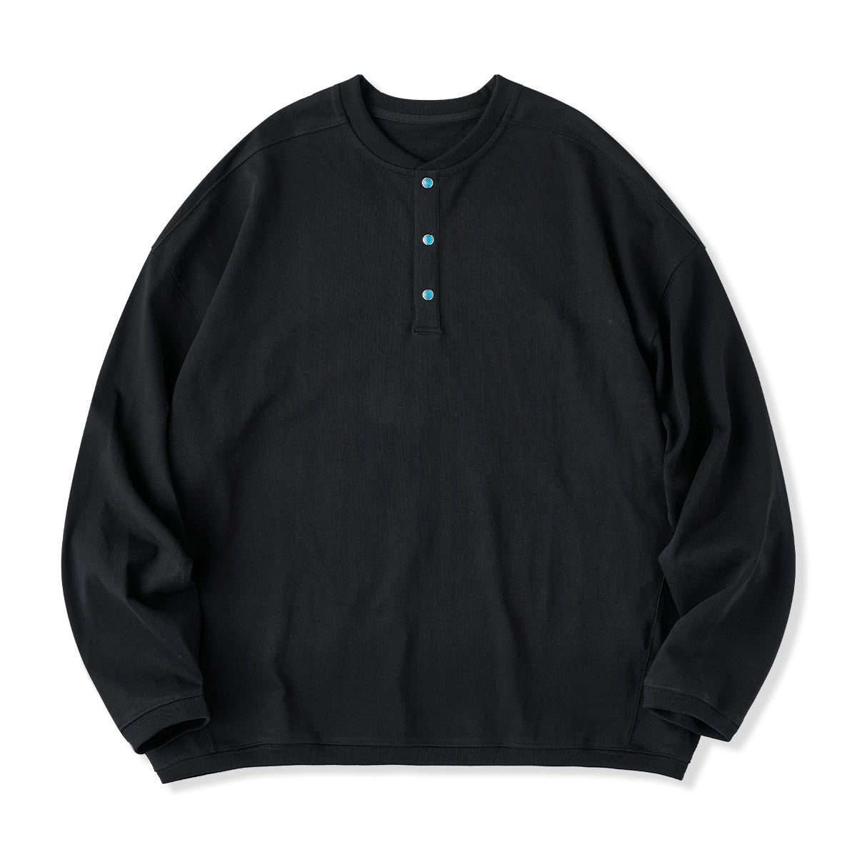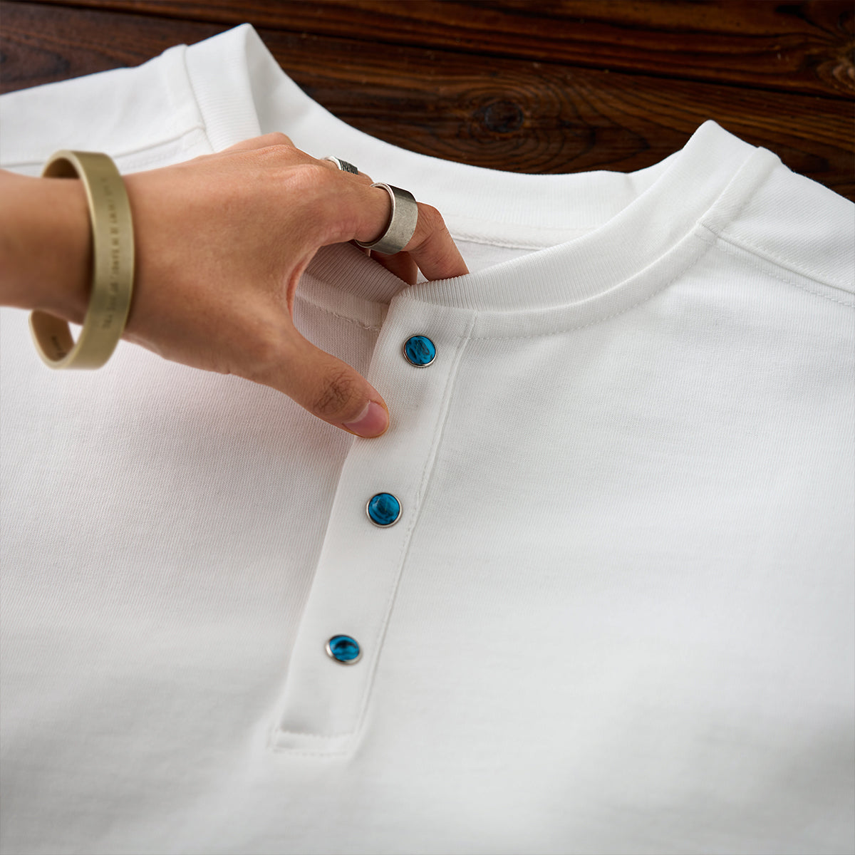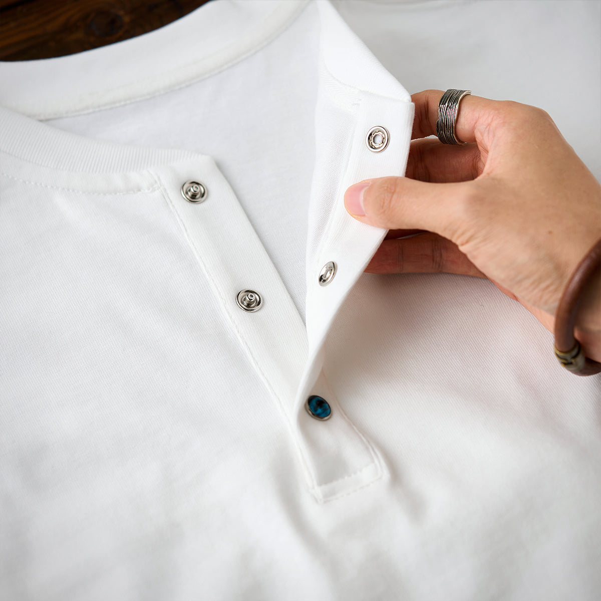 헨리넥과 드롭 숄더 디자인이 돋보이는 롱 티셔츠로, 터키석 단추가 포인트를 더하며 화이트와 블랙 두 가지 컬러로 다양한 하의와 손쉽게 코디할 수 있습니다.