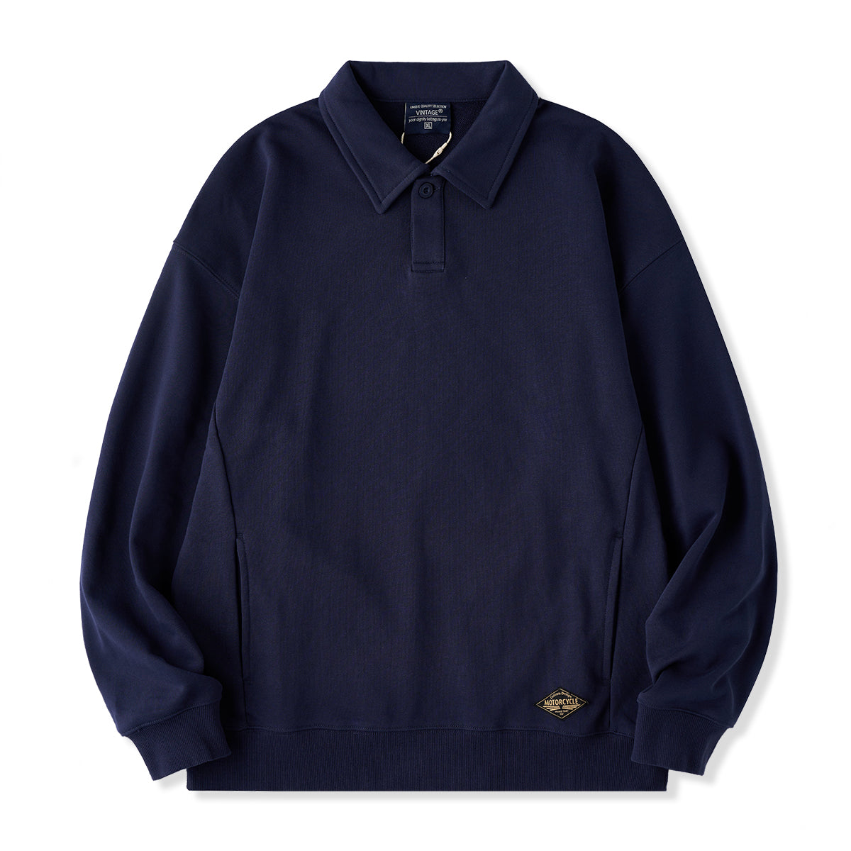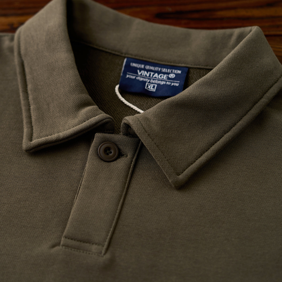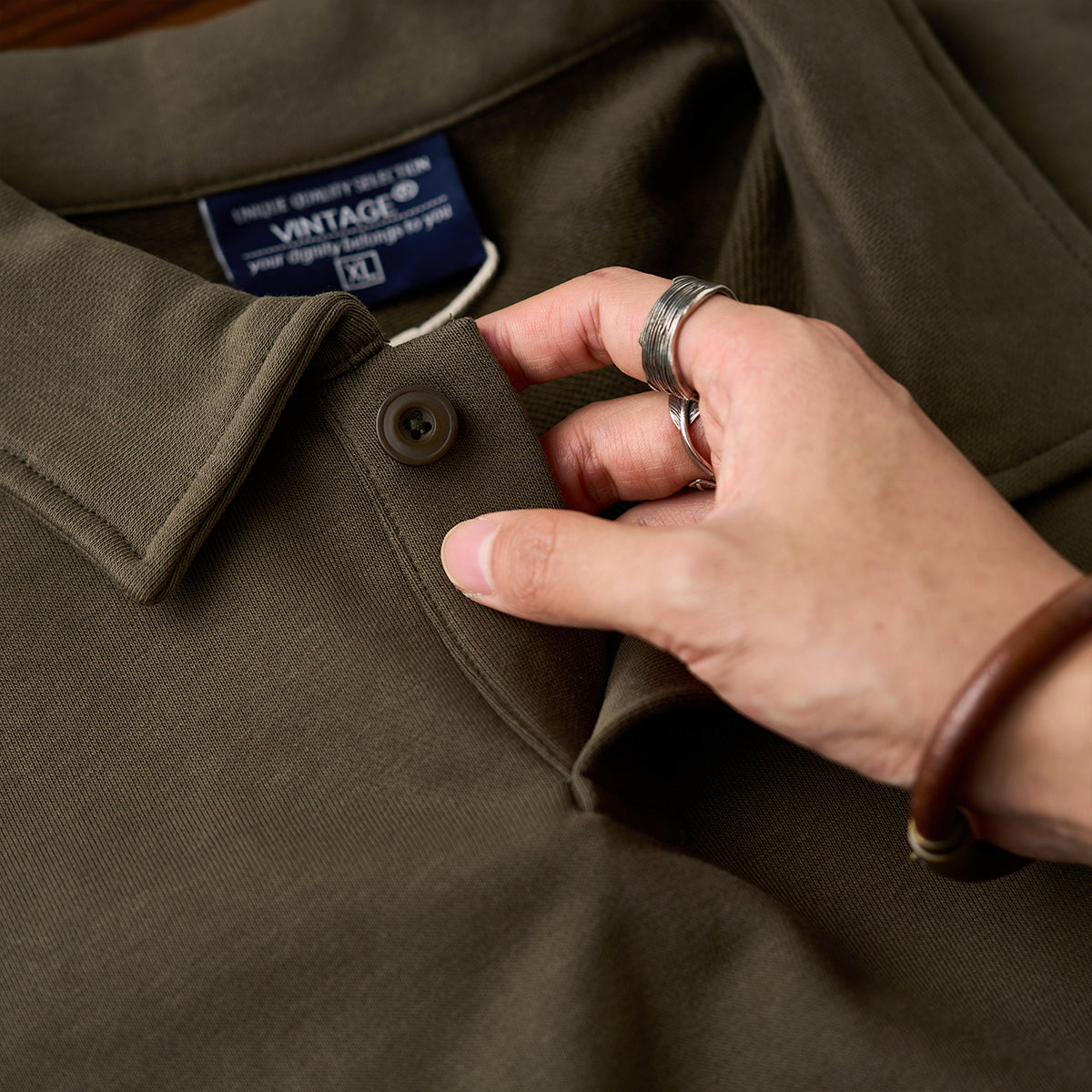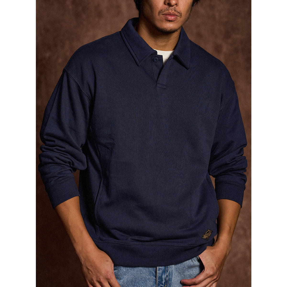 폴로 칼라와 원버튼 디테일, 리브 처리로 캐주얼과 포멀 스타일 모두 연출 가능한 드롭 숄더 릴랙스핏 스웨트셔츠.