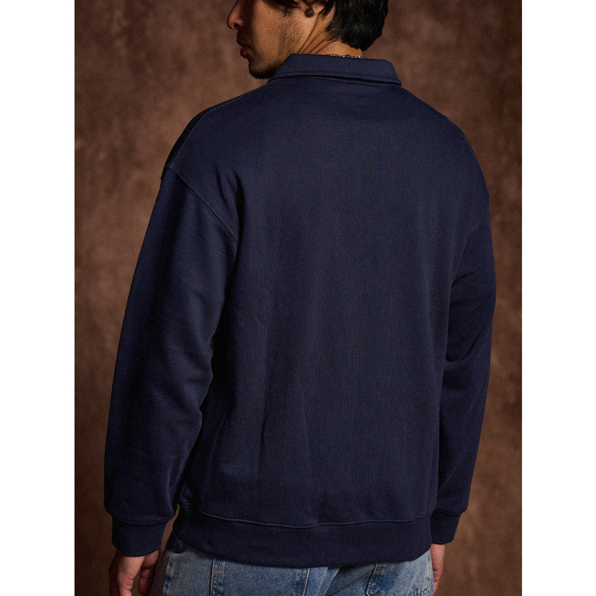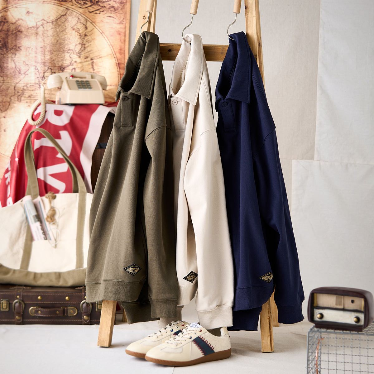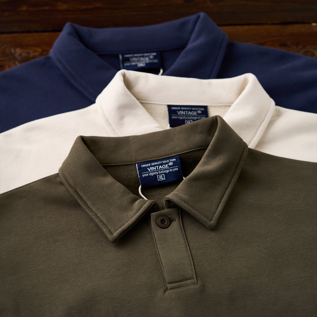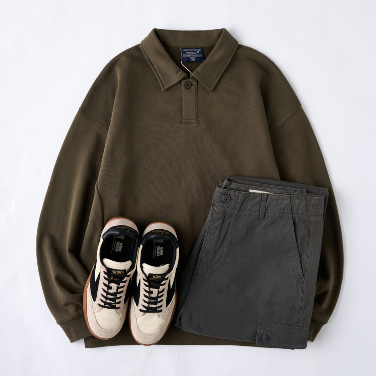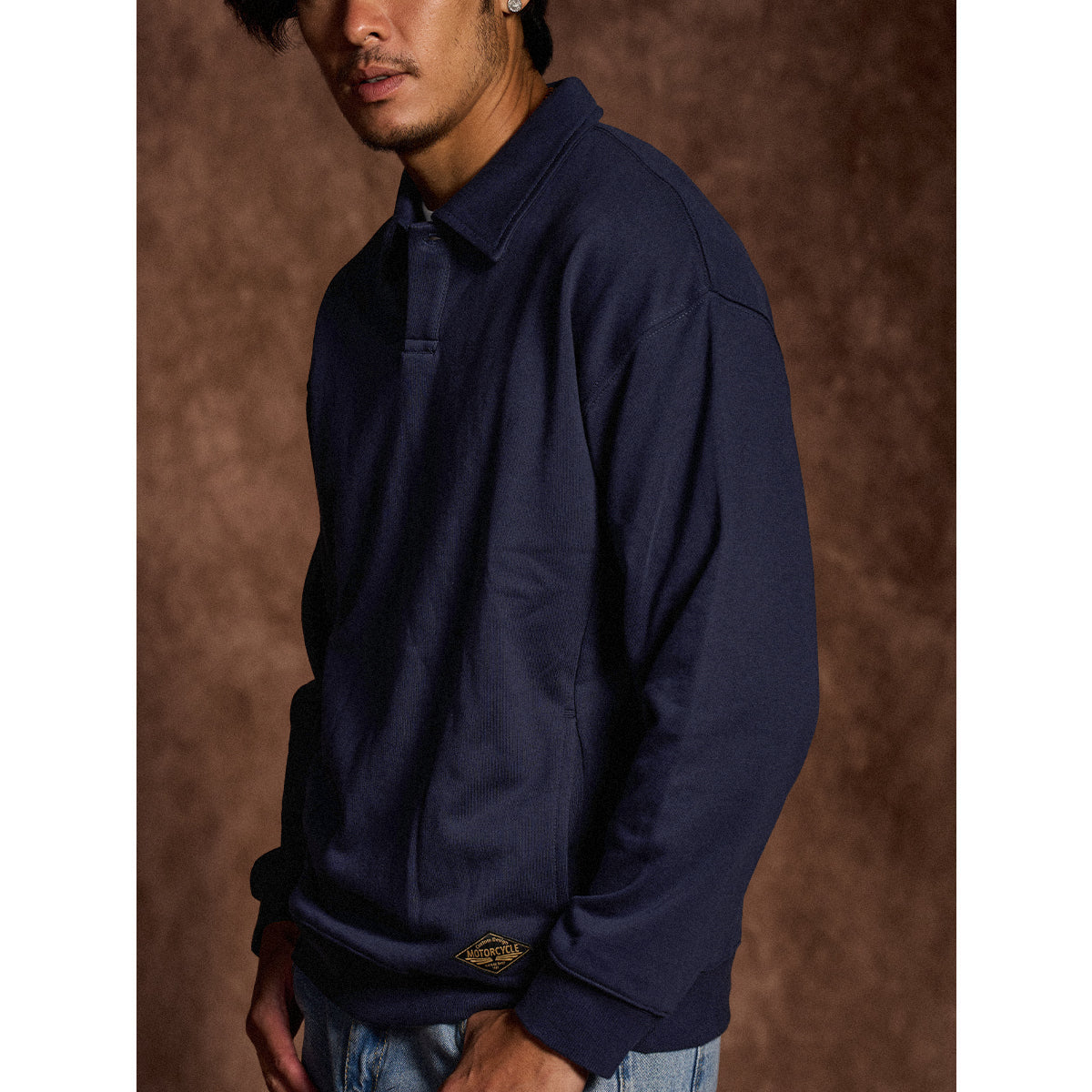 폴로 칼라와 원버튼 디테일, 리브 처리로 캐주얼과 포멀 스타일 모두 연출 가능한 드롭 숄더 릴랙스핏 스웨트셔츠.