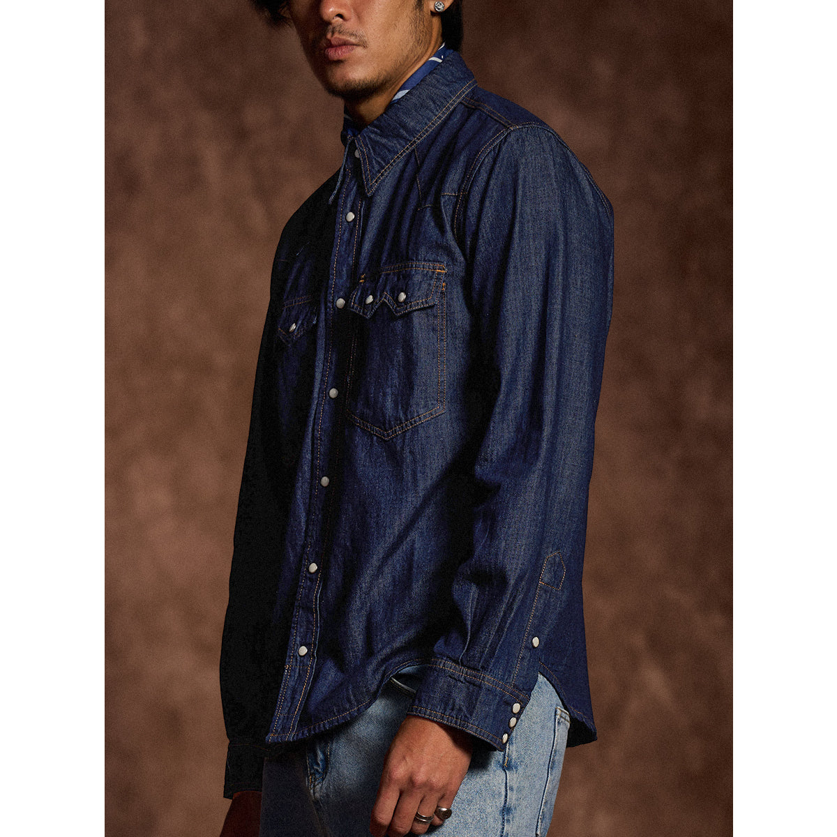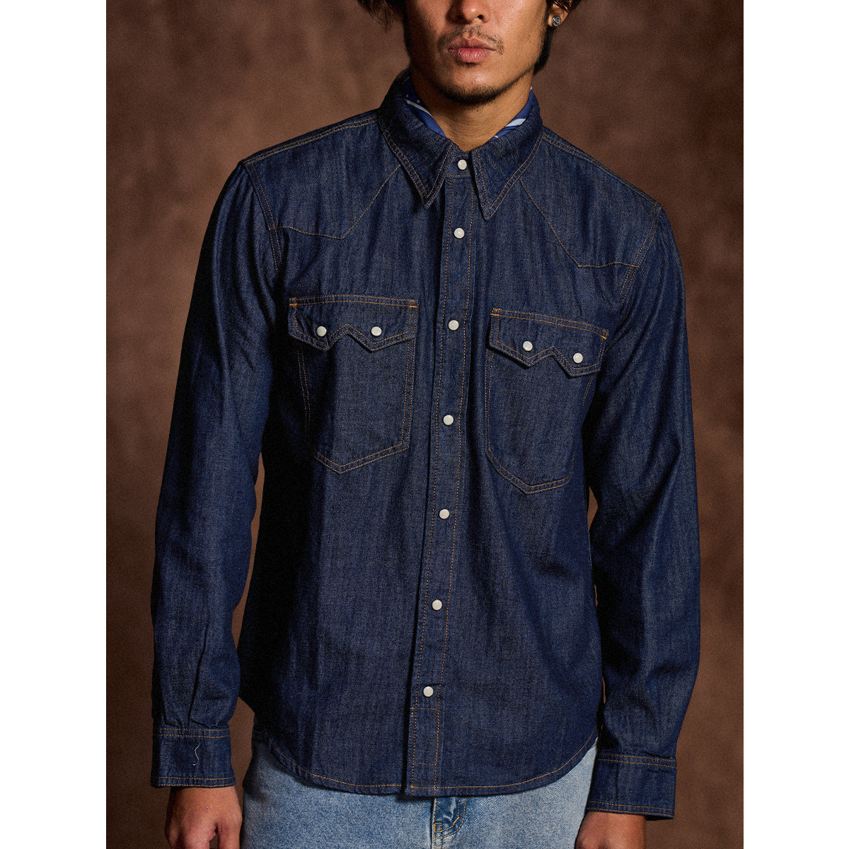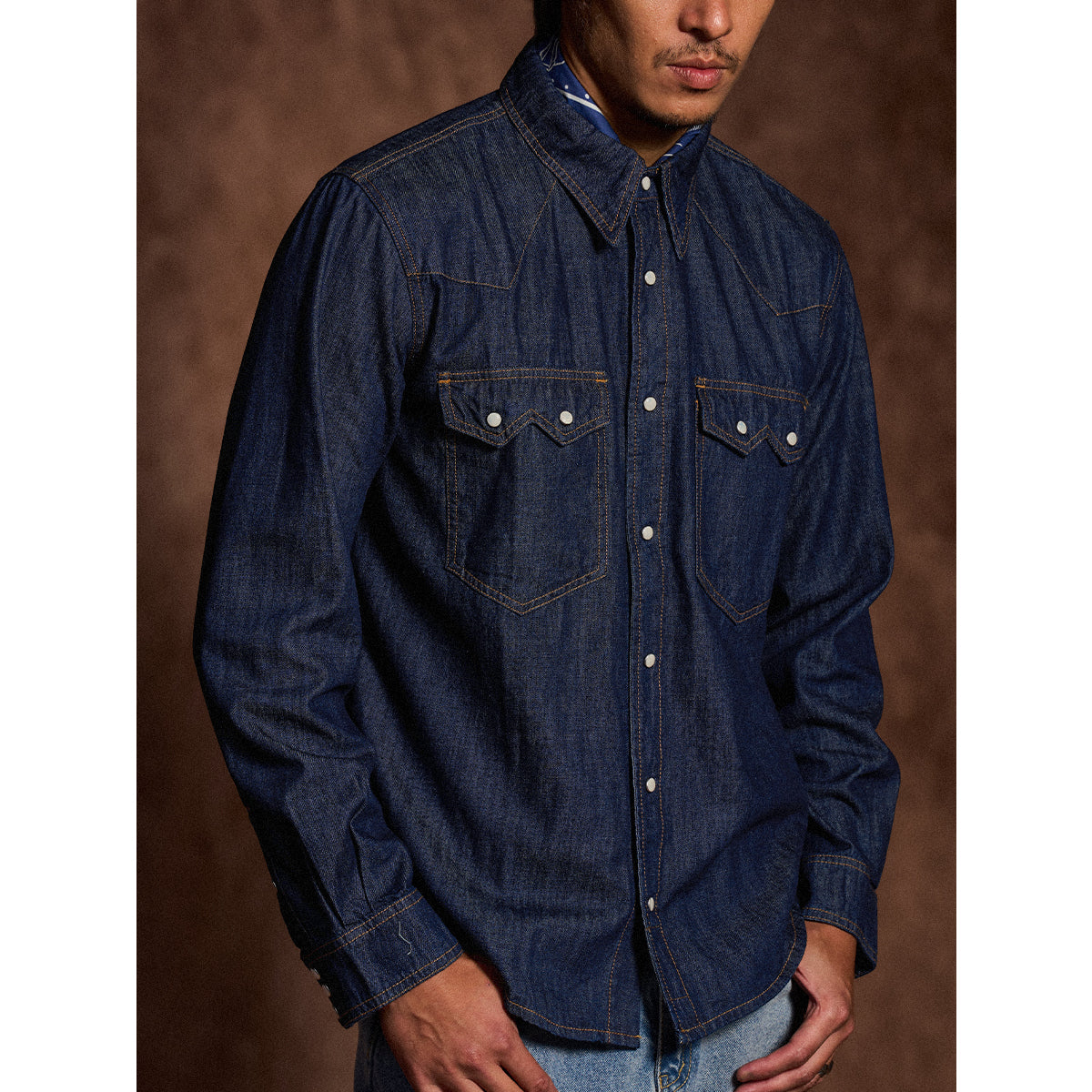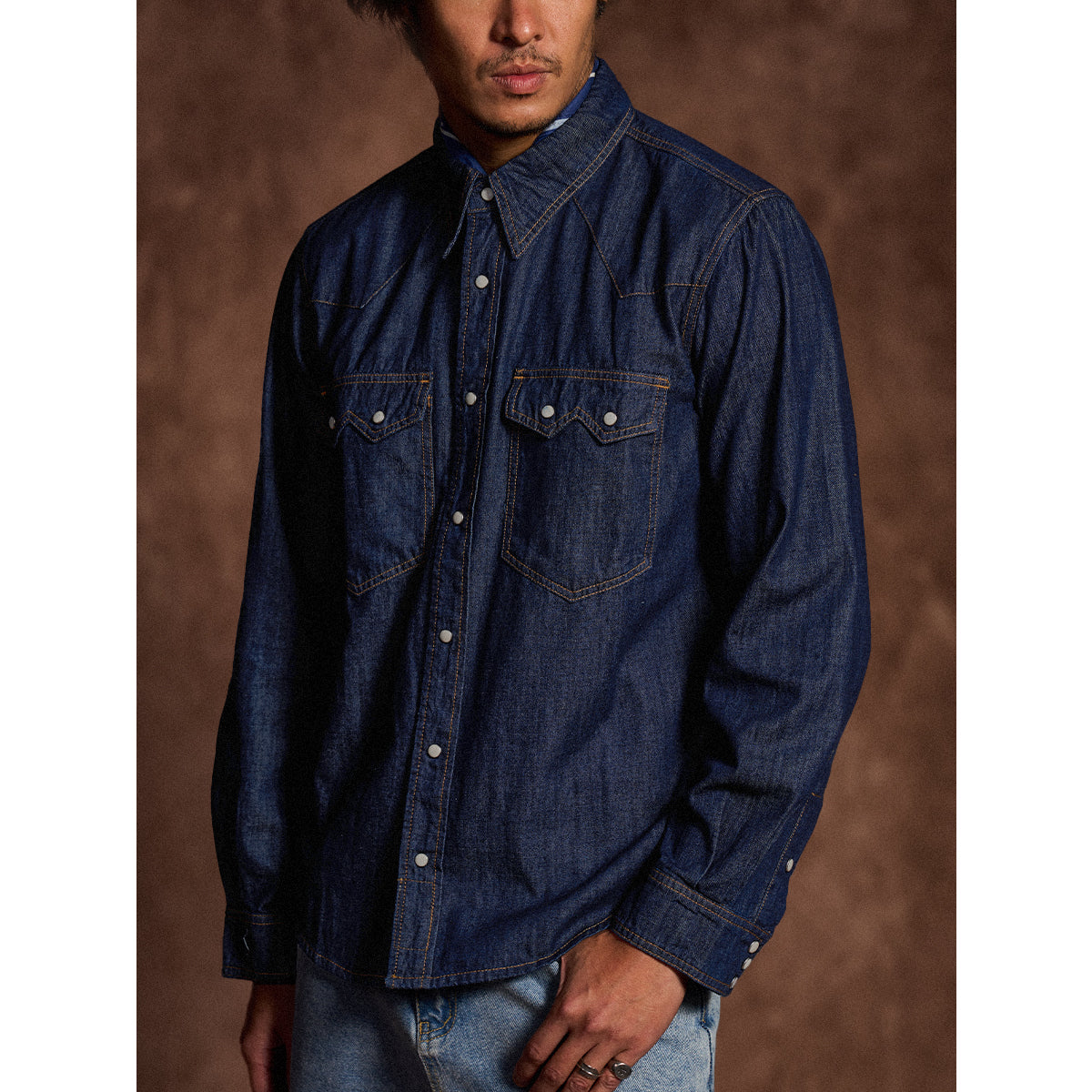 7oz 슬라브 데님 웨스턴 워크 셔츠로, 배색 스냅 버튼과 클래식 디테일이 빈티지 무드를 더하며 현대적 실루엣으로 완성. 아우터와 이너로 모두 활용 가능한 아이템.
