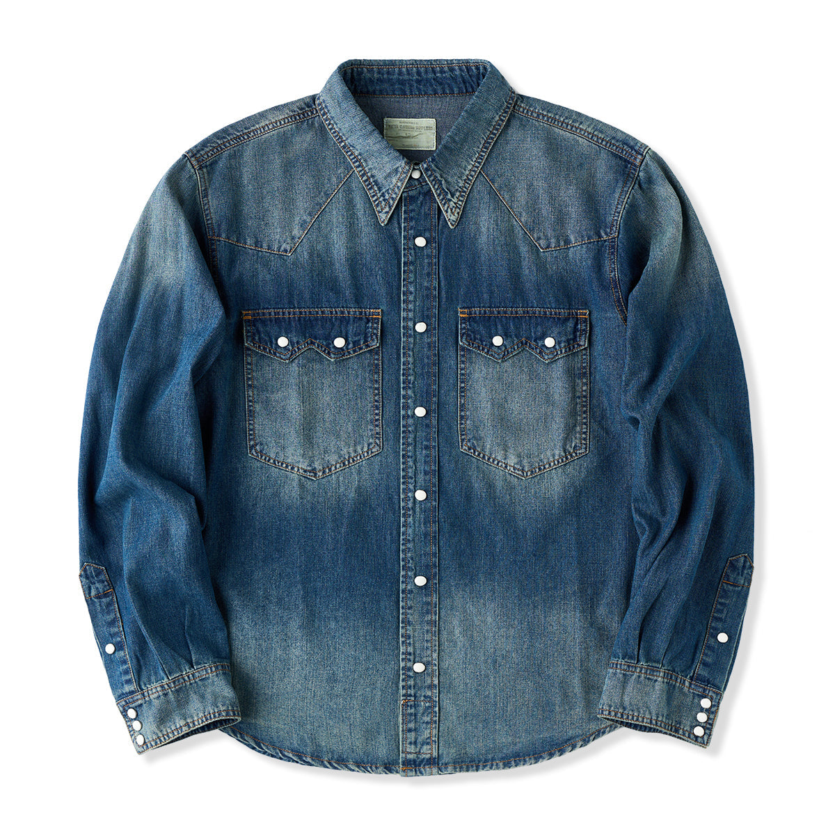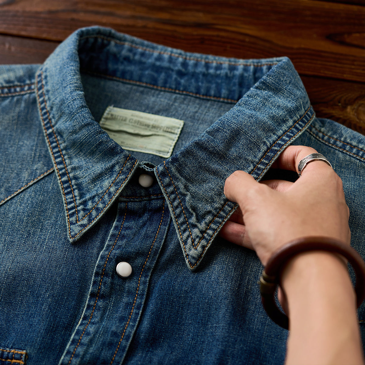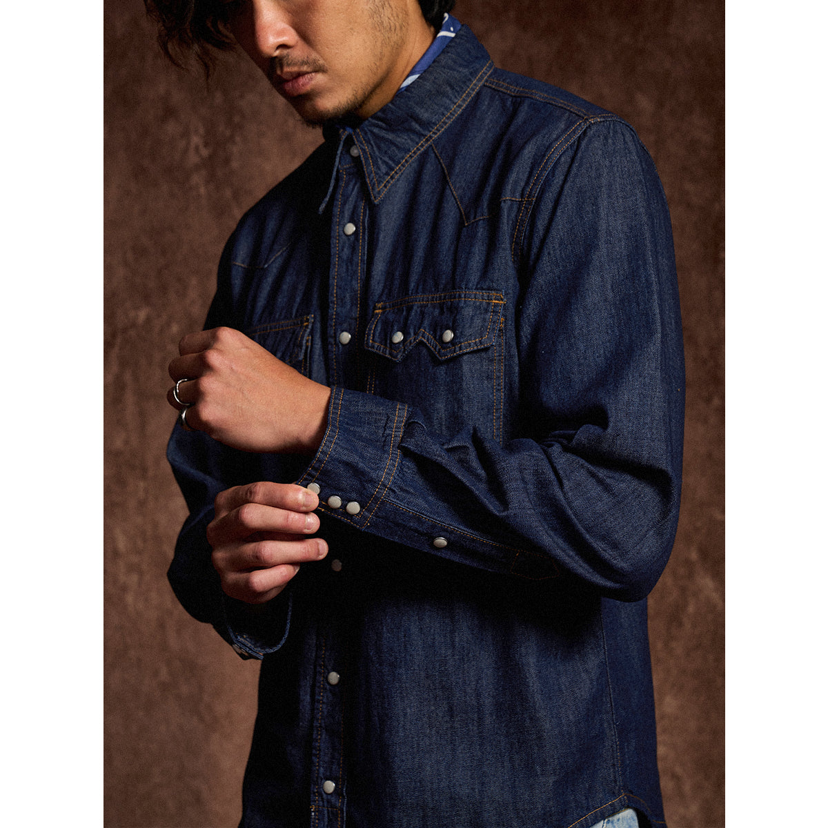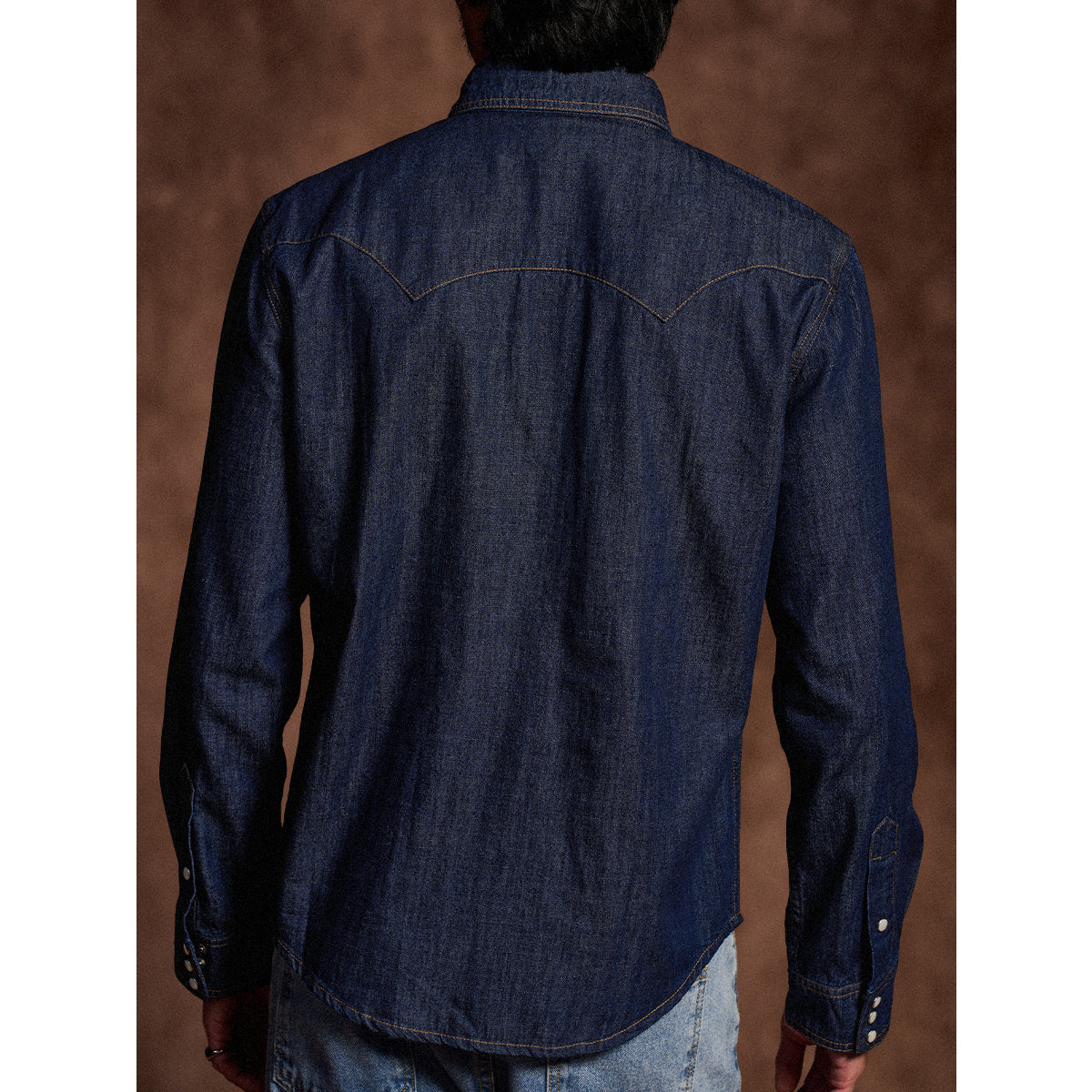 7oz 슬라브 데님 웨스턴 워크 셔츠로, 배색 스냅 버튼과 클래식 디테일이 빈티지 무드를 더하며 현대적 실루엣으로 완성. 아우터와 이너로 모두 활용 가능한 아이템.
