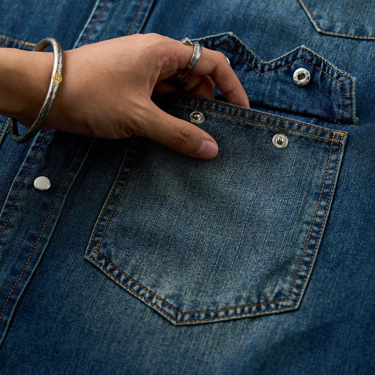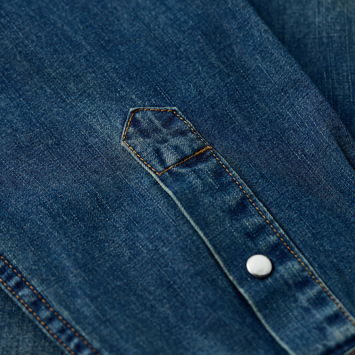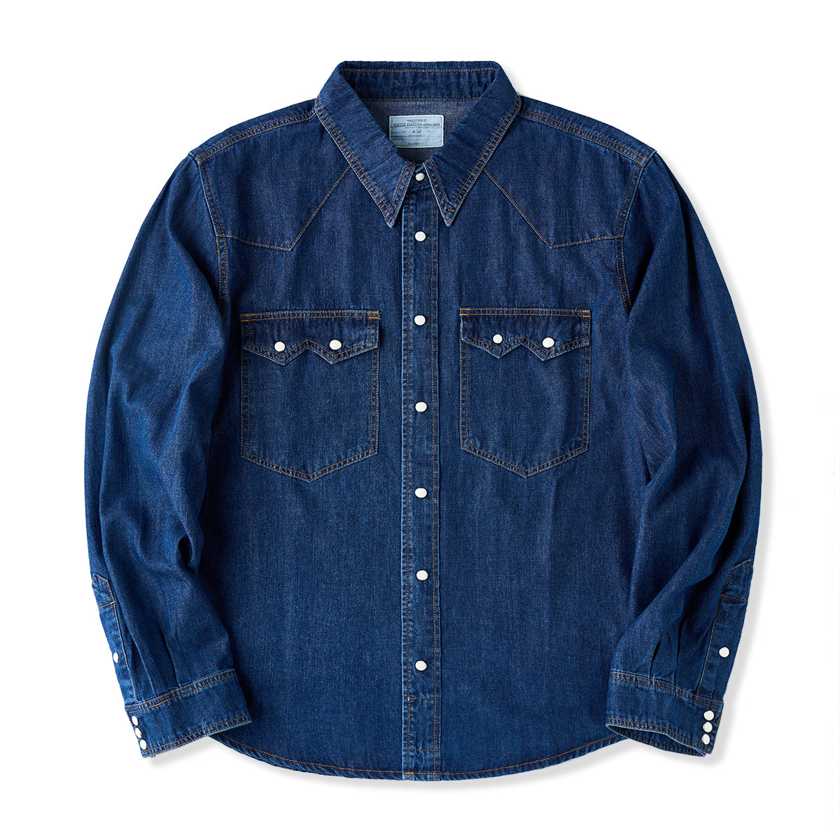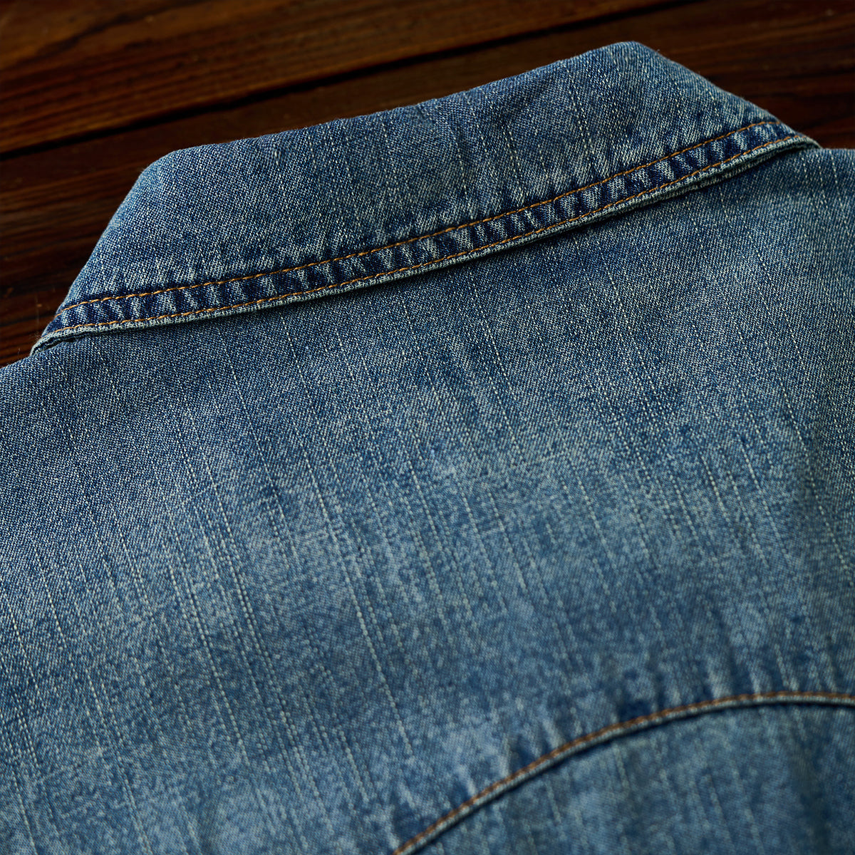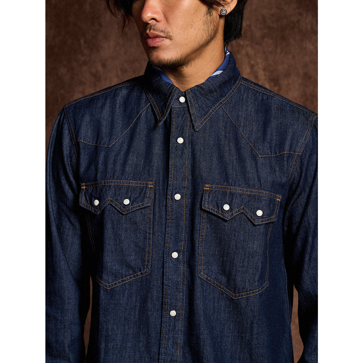 7oz 슬라브 데님 웨스턴 워크 셔츠로, 배색 스냅 버튼과 클래식 디테일이 빈티지 무드를 더하며 현대적 실루엣으로 완성. 아우터와 이너로 모두 활용 가능한 아이템.