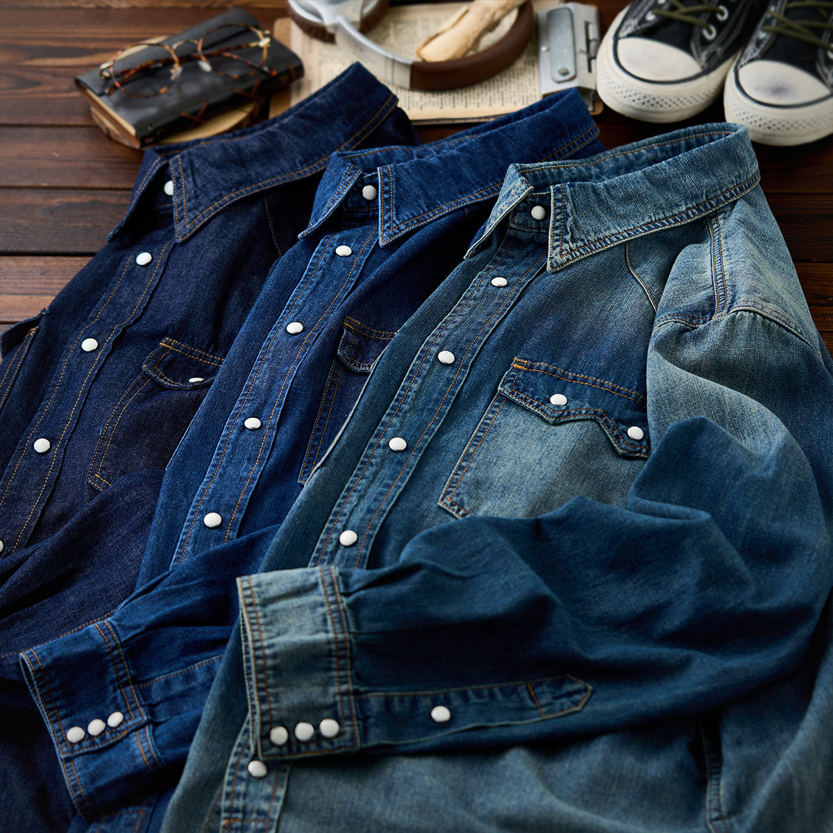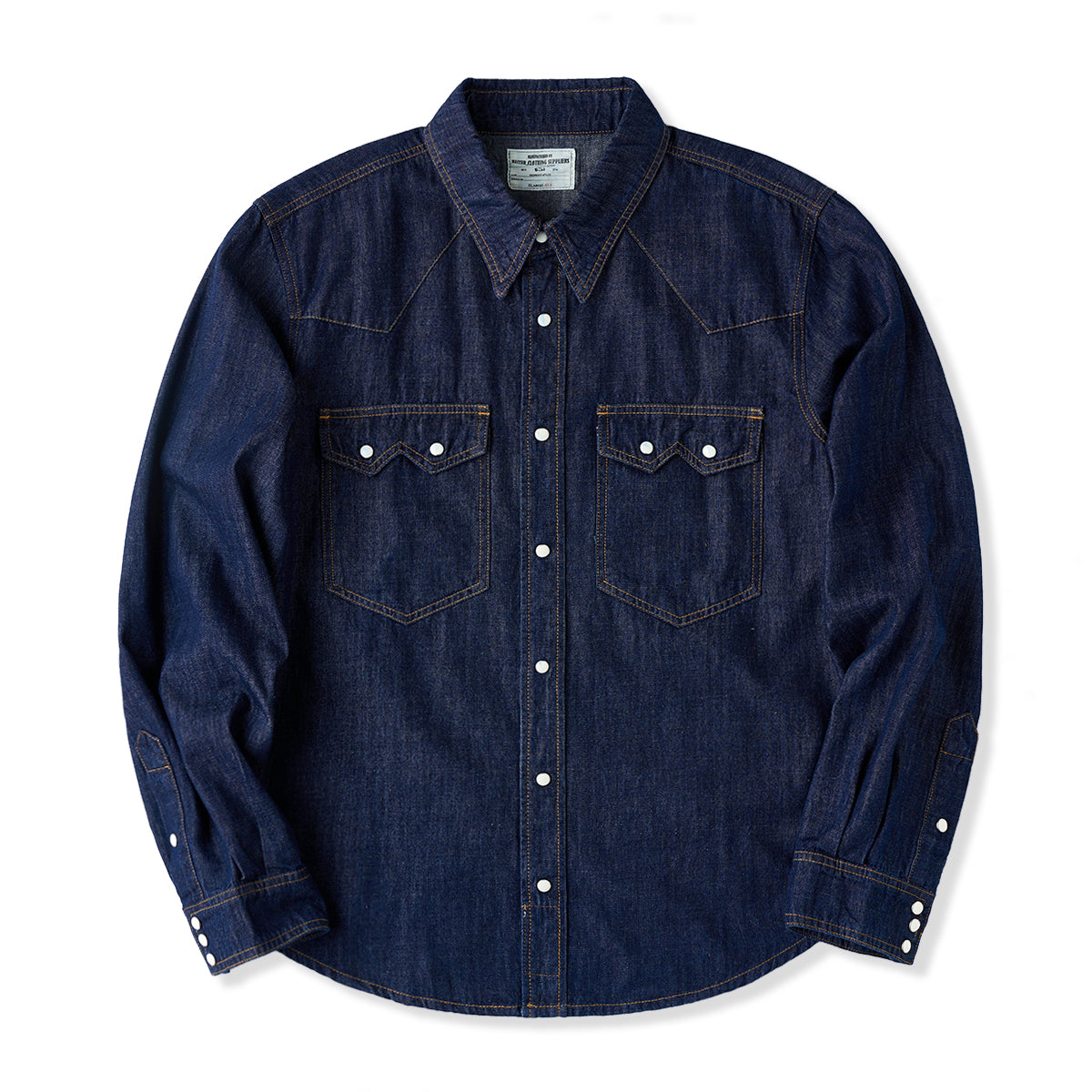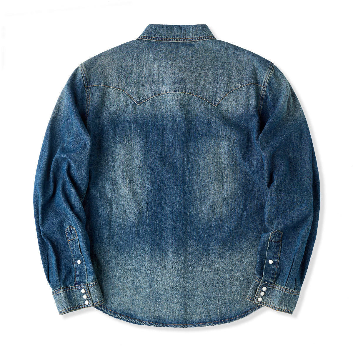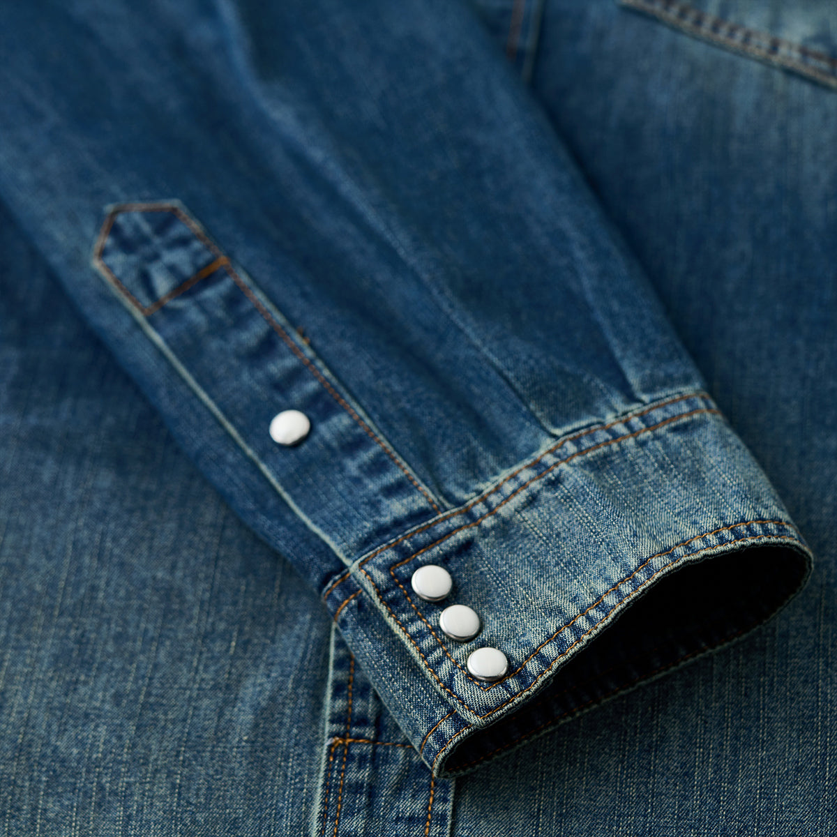7oz 슬라브 데님 웨스턴 워크 셔츠로, 배색 스냅 버튼과 클래식 디테일이 빈티지 무드를 더하며 현대적 실루엣으로 완성. 아우터와 이너로 모두 활용 가능한 아이템.