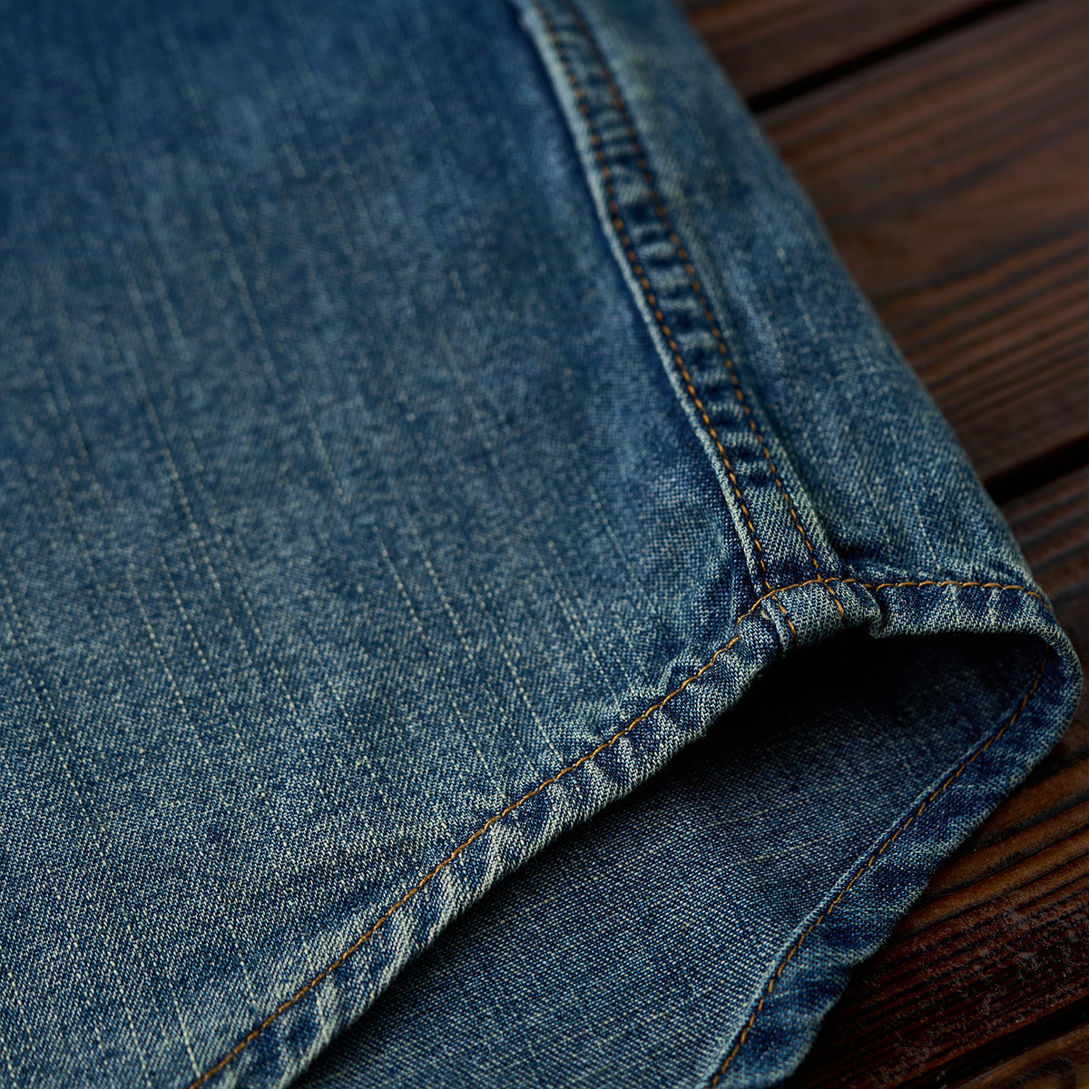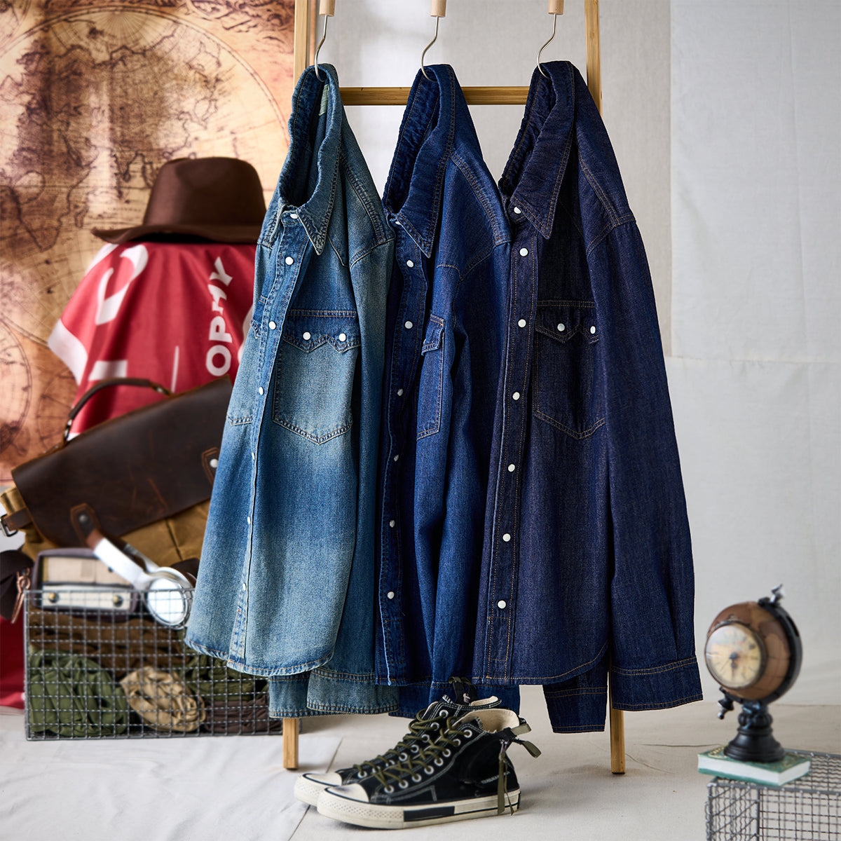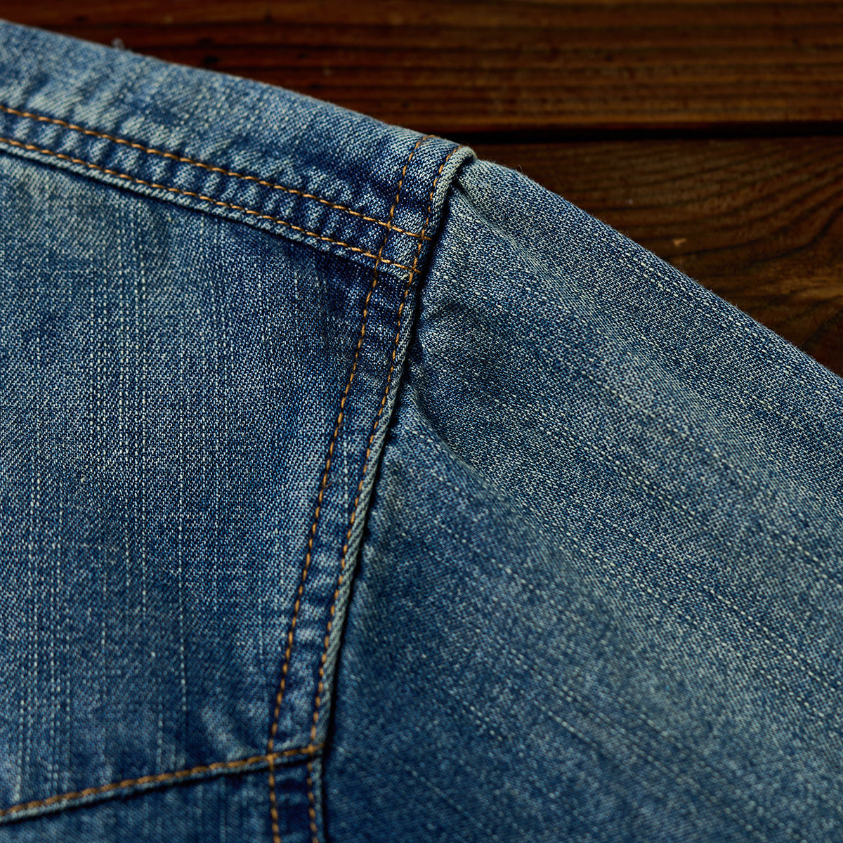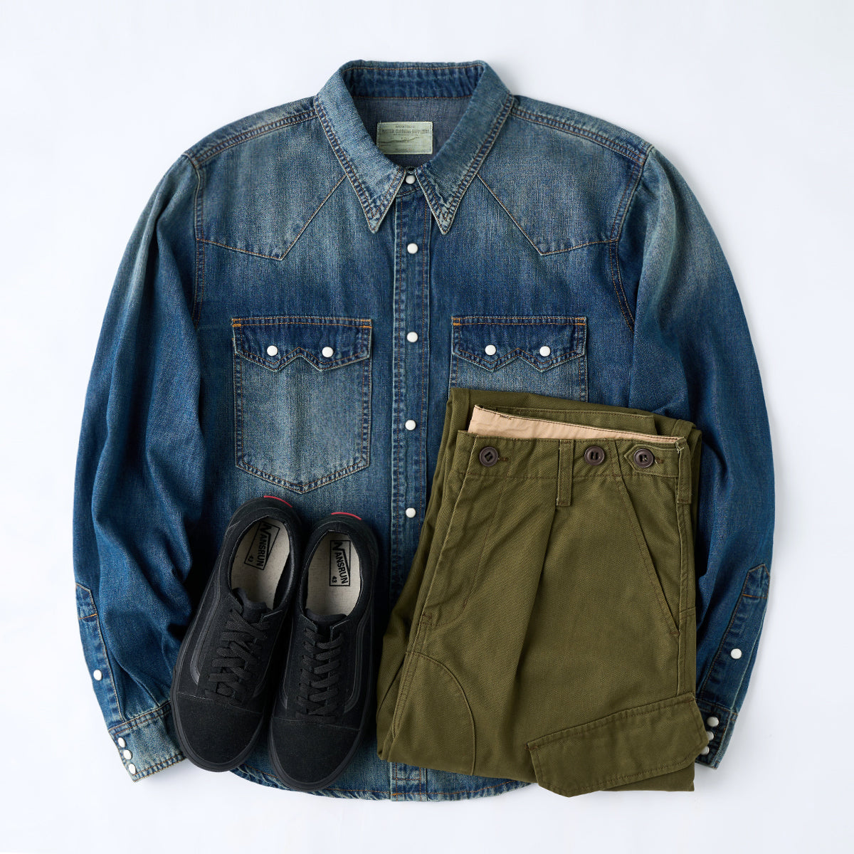 7oz 슬라브 데님 웨스턴 워크 셔츠로, 배색 스냅 버튼과 클래식 디테일이 빈티지 무드를 더하며 현대적 실루엣으로 완성. 아우터와 이너로 모두 활용 가능한 아이템.