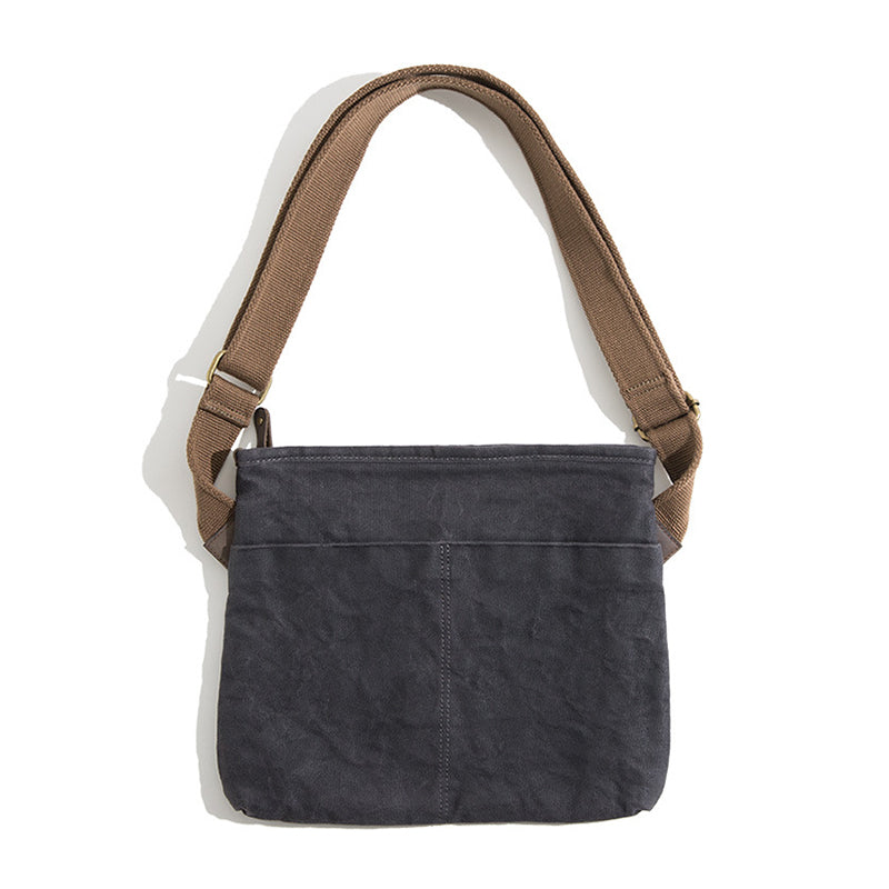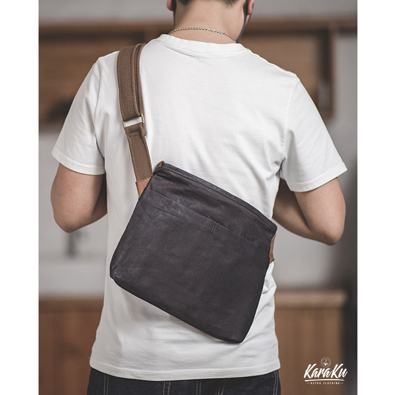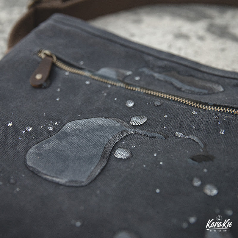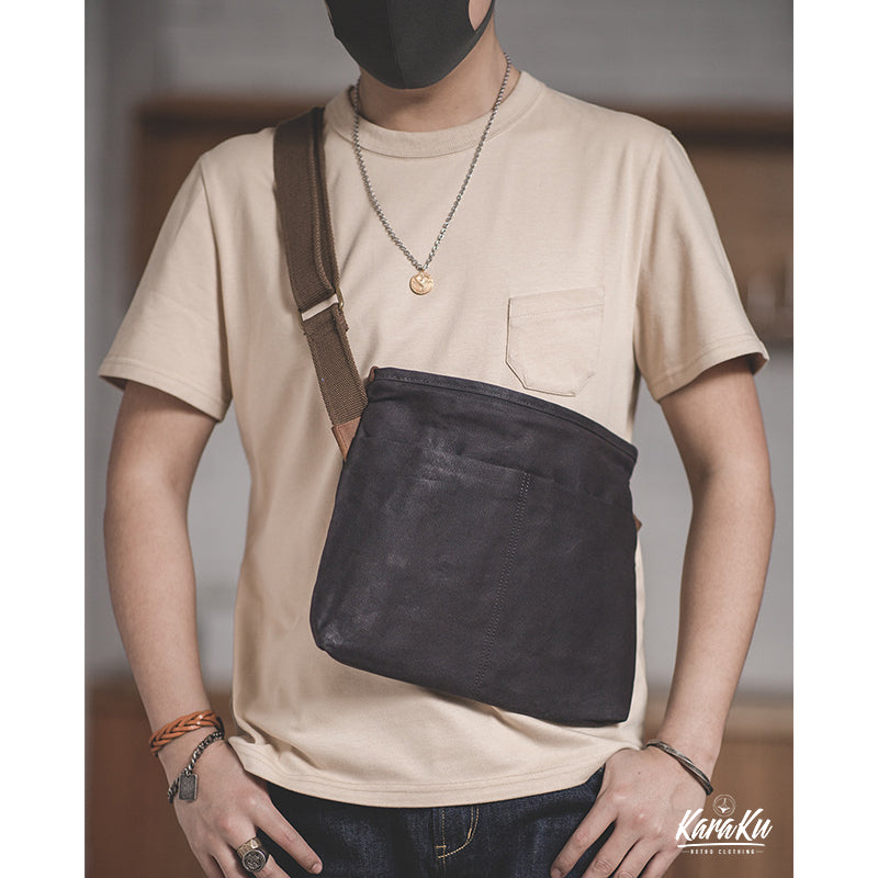 This item is made of oil wax canvas with a water-repellent coating, and the wide strap is made of high-quality polyester. It is less burdensome on the shoulders and arms. It is a combination of materials that smell more after use.