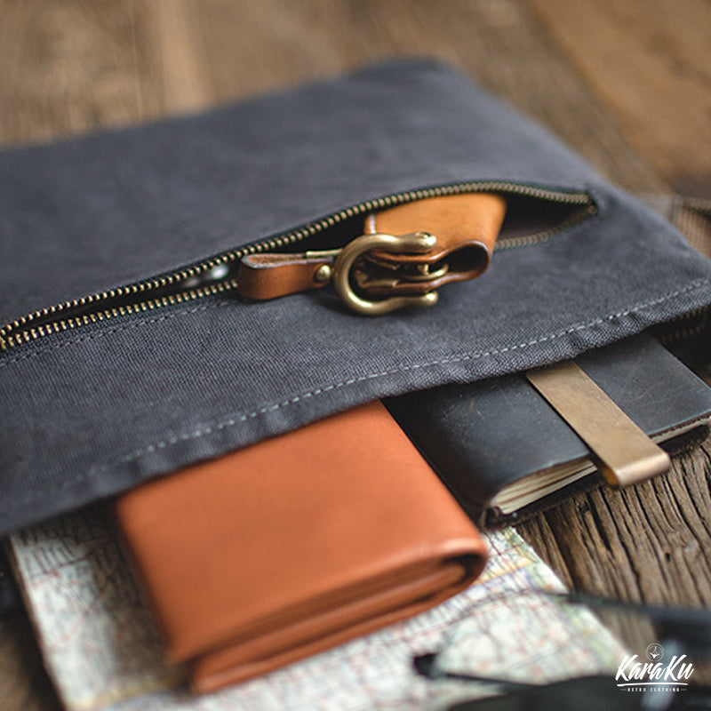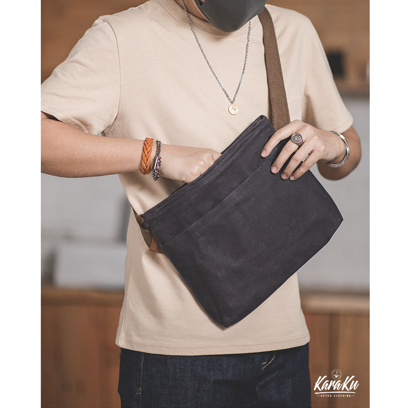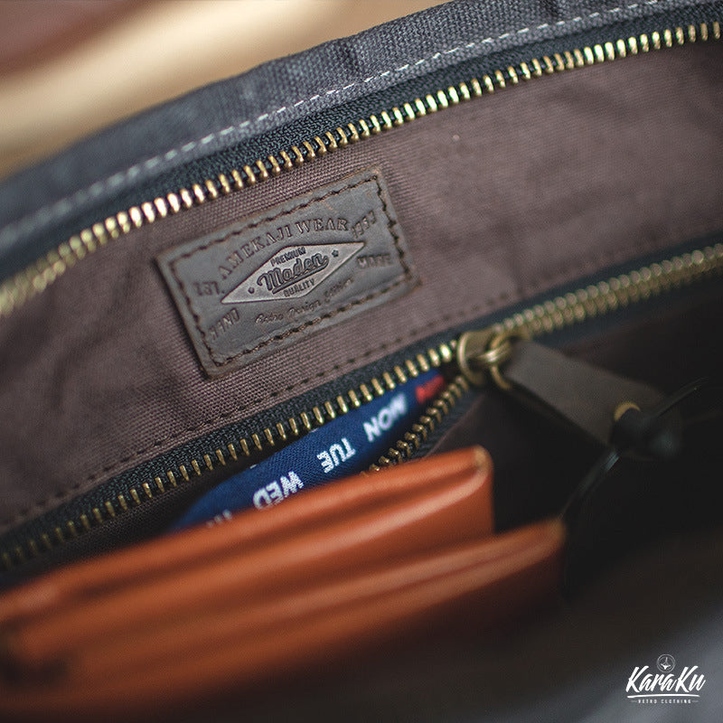 It is stable in shape, has excellent resilience, and does not wrinkle or lose shape easily. It is durable and water-repellent, and its toughness is also attractive. The leather patch is called crazy horse leather. It uses full-grain cowhide, the world's highest quality natural leather. It is characterized by a sturdy, beautiful, and elegant visual, and is full of a vintage feel. It is made of 16oz sturdy waxed canvas material and has a moderate storage capacity, creating a vintage feel. There are no unnecessary dividers on the inside, and it includes one zipper pocket, so you can efficiently store your iPad, umbrella, pen, notebook, small items, or valuables.