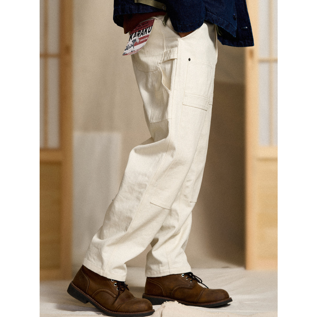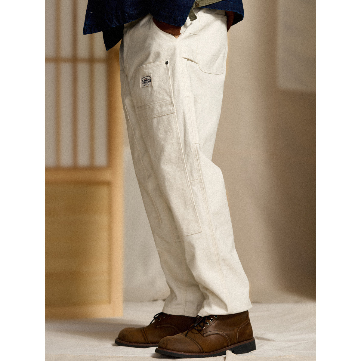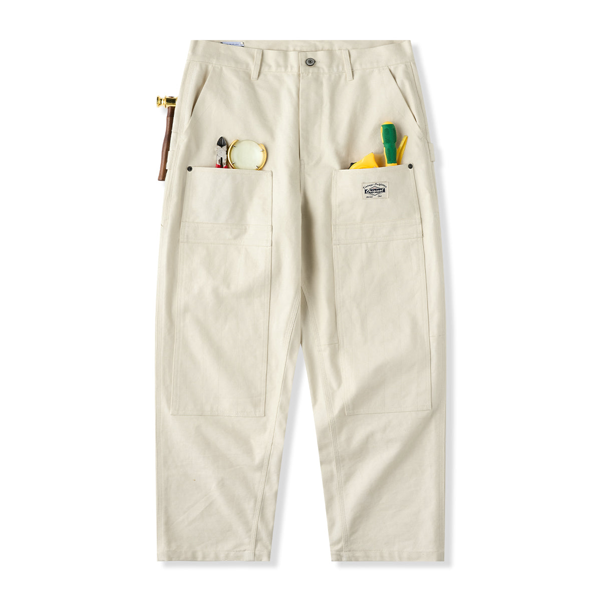 Painter pants are work pants frequently used by paint craftsmen and are characterized by hammer loops (hooks for hanging hammers) and wrench pockets. This item has improved design while incorporating painter pants details and is also functional.