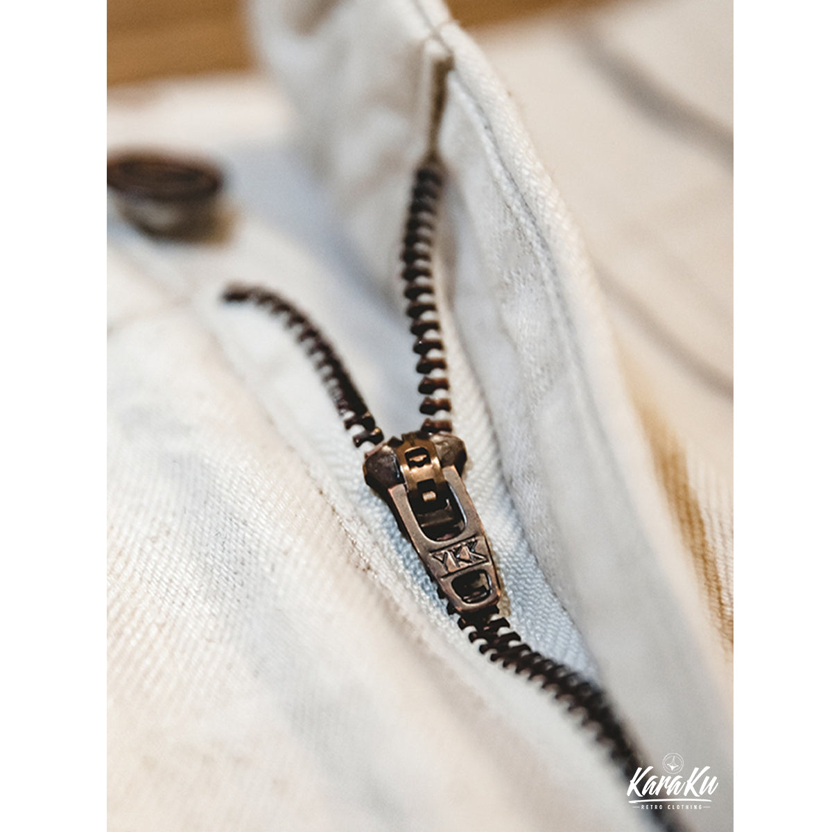 The warp and weft yarns are made of thicker, more spotty yarns than usual. 11.2oz natural cotton sail denim, woven on old-fashioned power looms and shuttle looms, has a unique uneven feel. Finished with a wash process, it feels good to the touch and does not wrinkle easily. Natural cotton sack material was used, expressed in its original state with the cotton husk or cotton thread remaining.