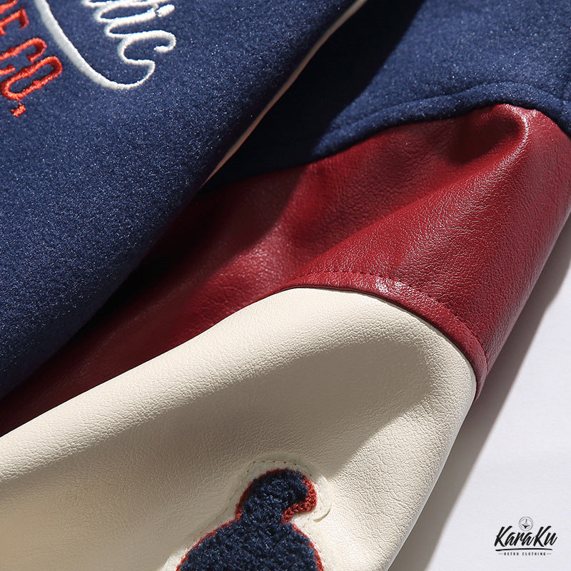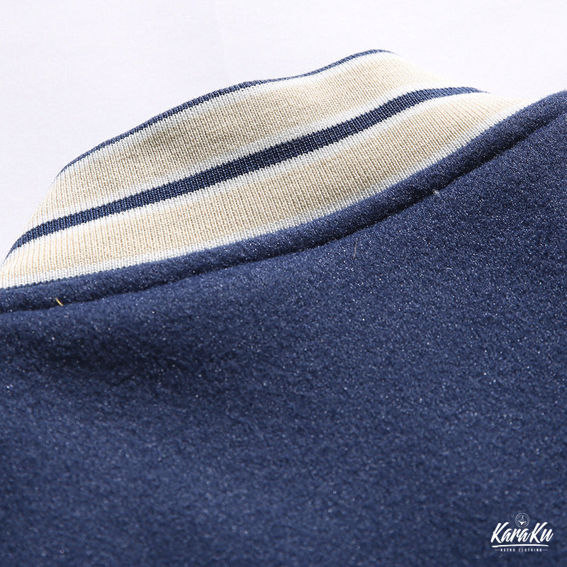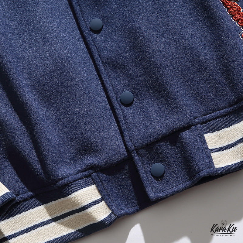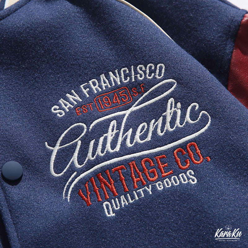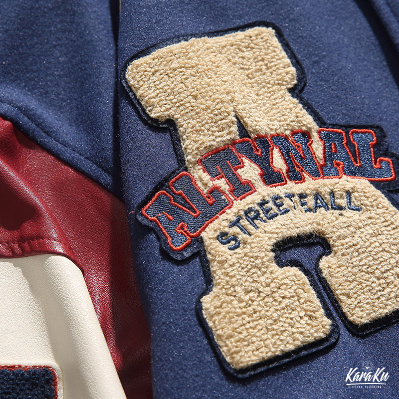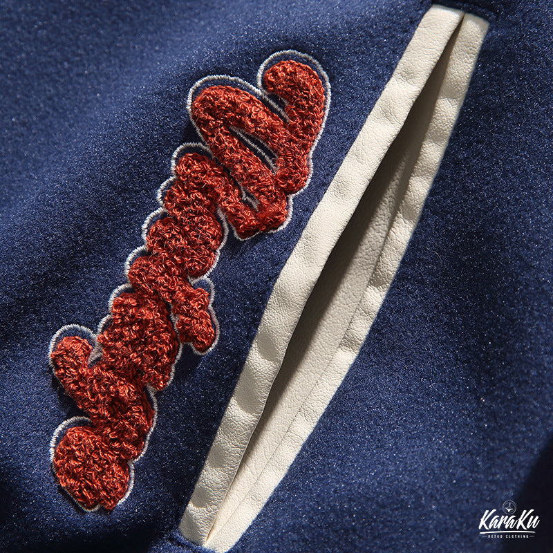 The royal road design with large embroidery on the front, including the sleeves, gives off an American casual and vintage feel.