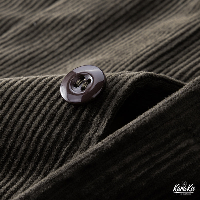 This material has a surface that changes to a vintage feel when washed, and the fluffiness makes it a warm fabric that is perfect for fall and winter. When matched with buttons, it creates an even more vintage feel.