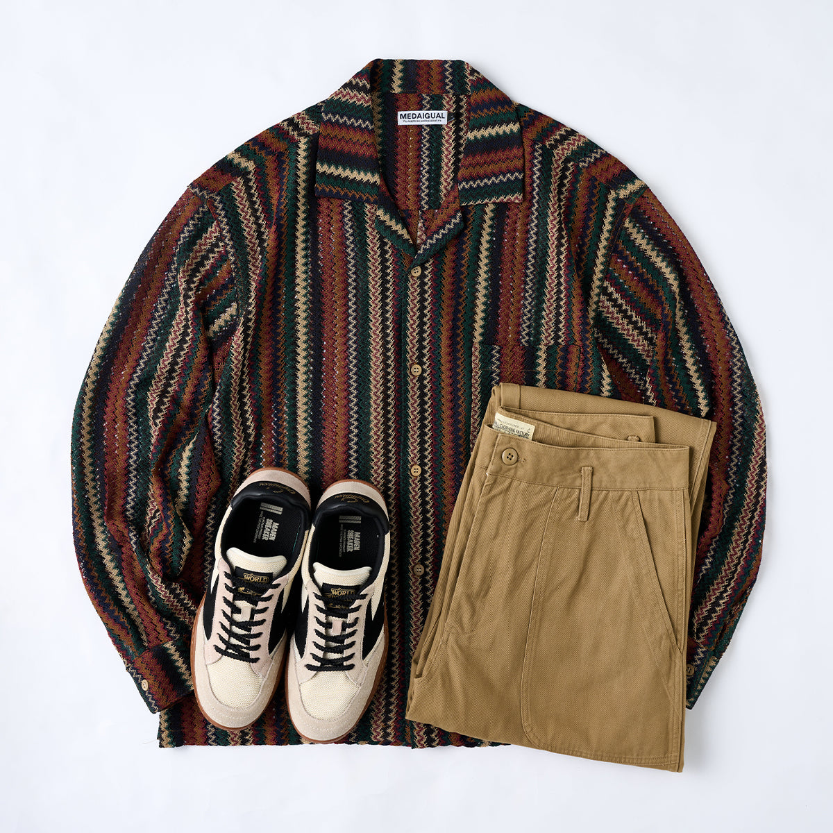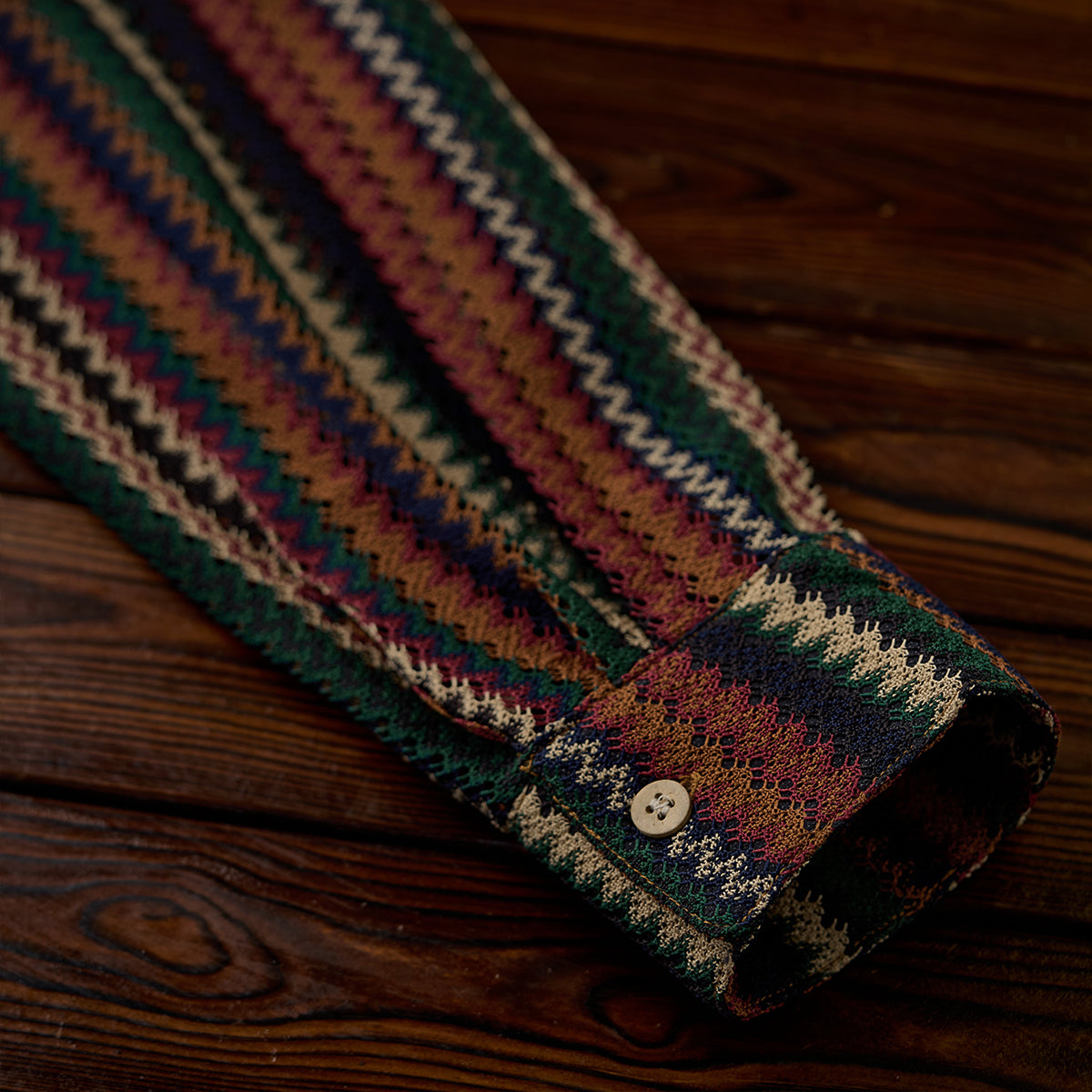 전통 쿠바 셔츠 스타일을 현대적인 색감과 패턴으로 재해석한 긴팔 셔츠로, 차분한 어스톤 컬러와 입체감 있는 짜임이 빈티지하면서도 모던한 분위기를 연출합니다.