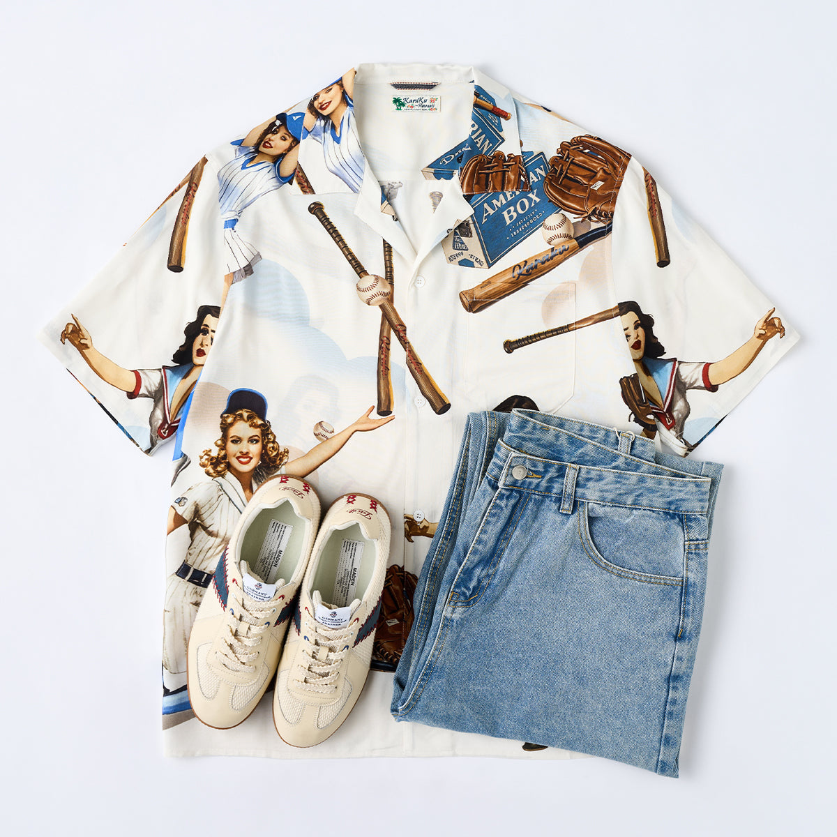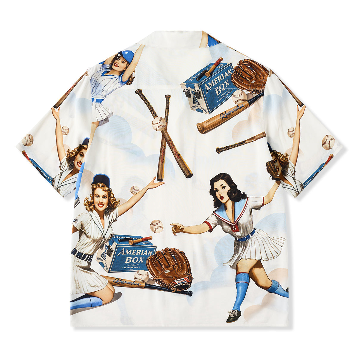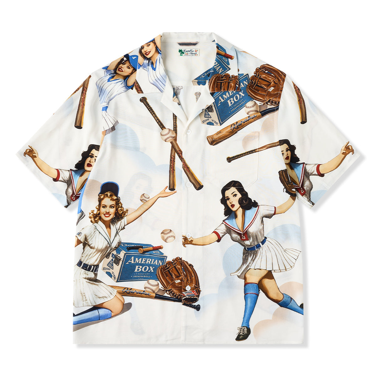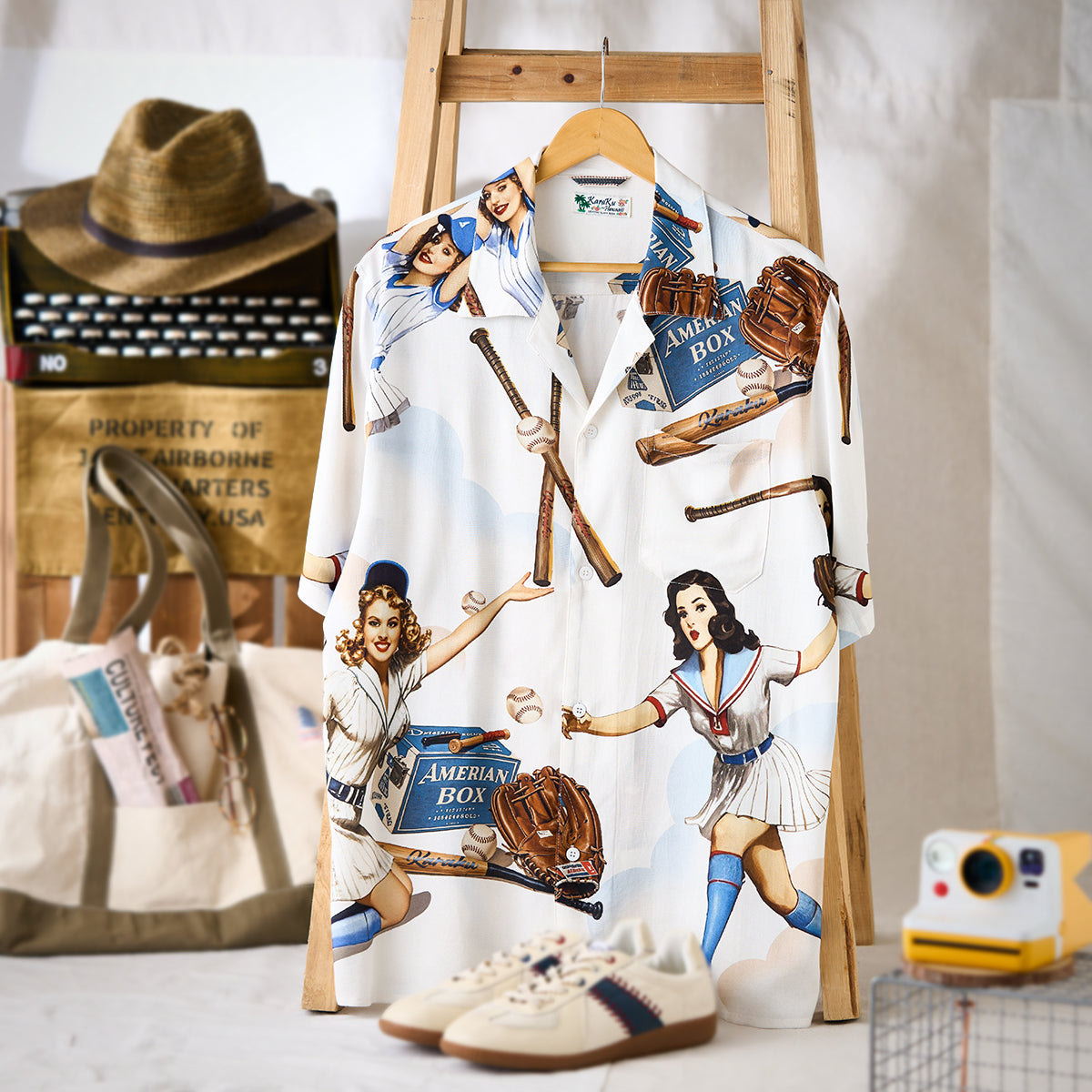 빈티지한 아메리칸 무드에 ‘베이스볼 걸’ 프린트가 가득한, 시선 강탈 하와이안 셔츠입니다.