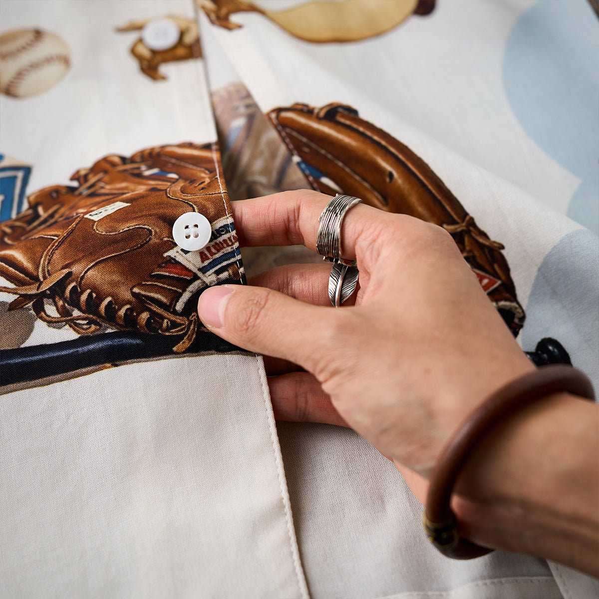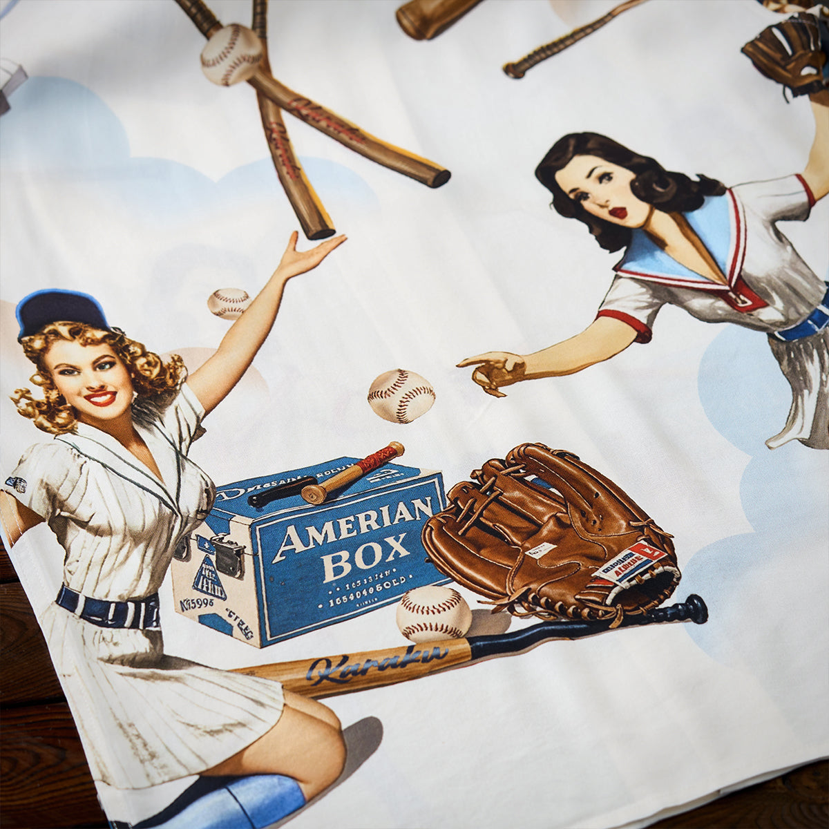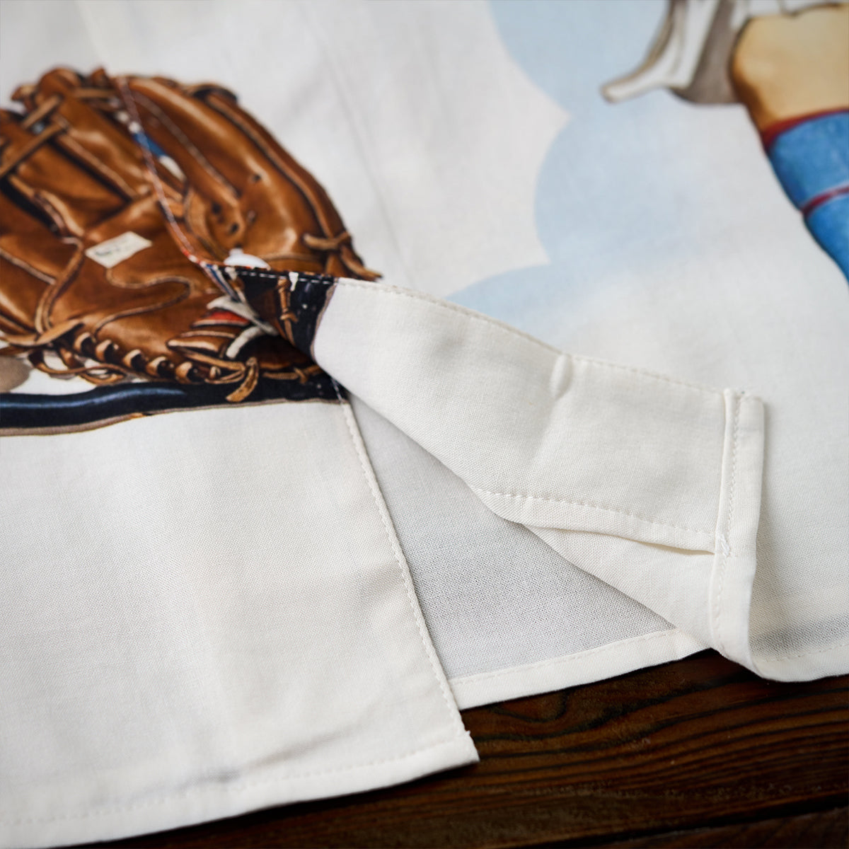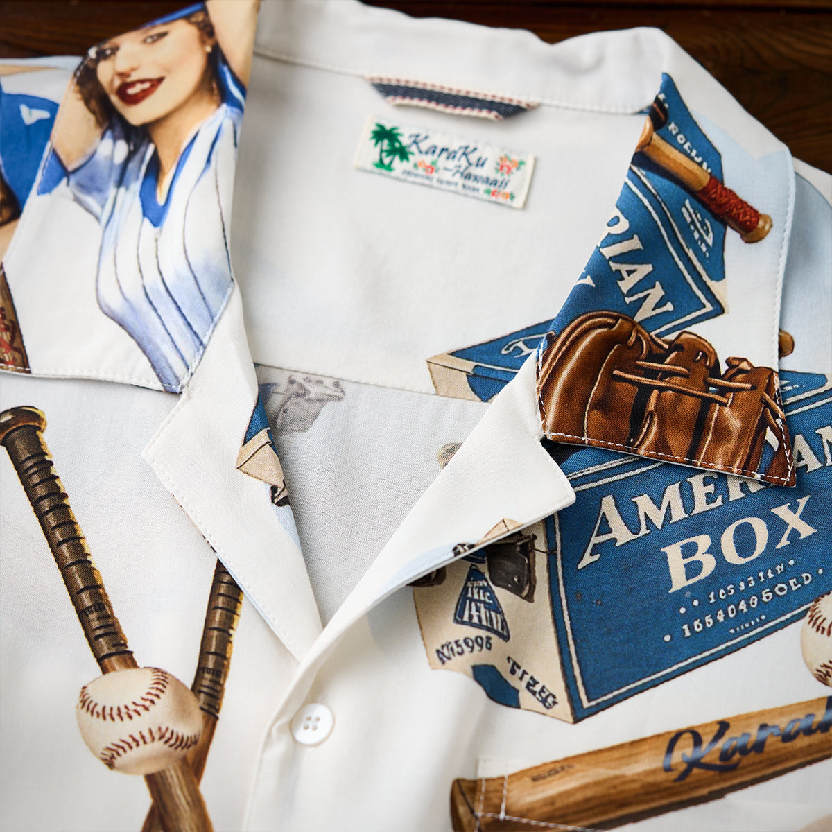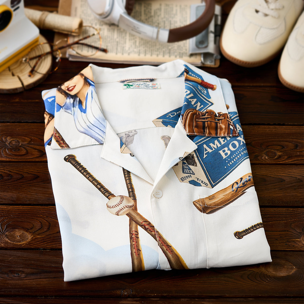 빈티지한 아메리칸 무드에 ‘베이스볼 걸’ 프린트가 가득한, 시선 강탈 하와이안 셔츠입니다.