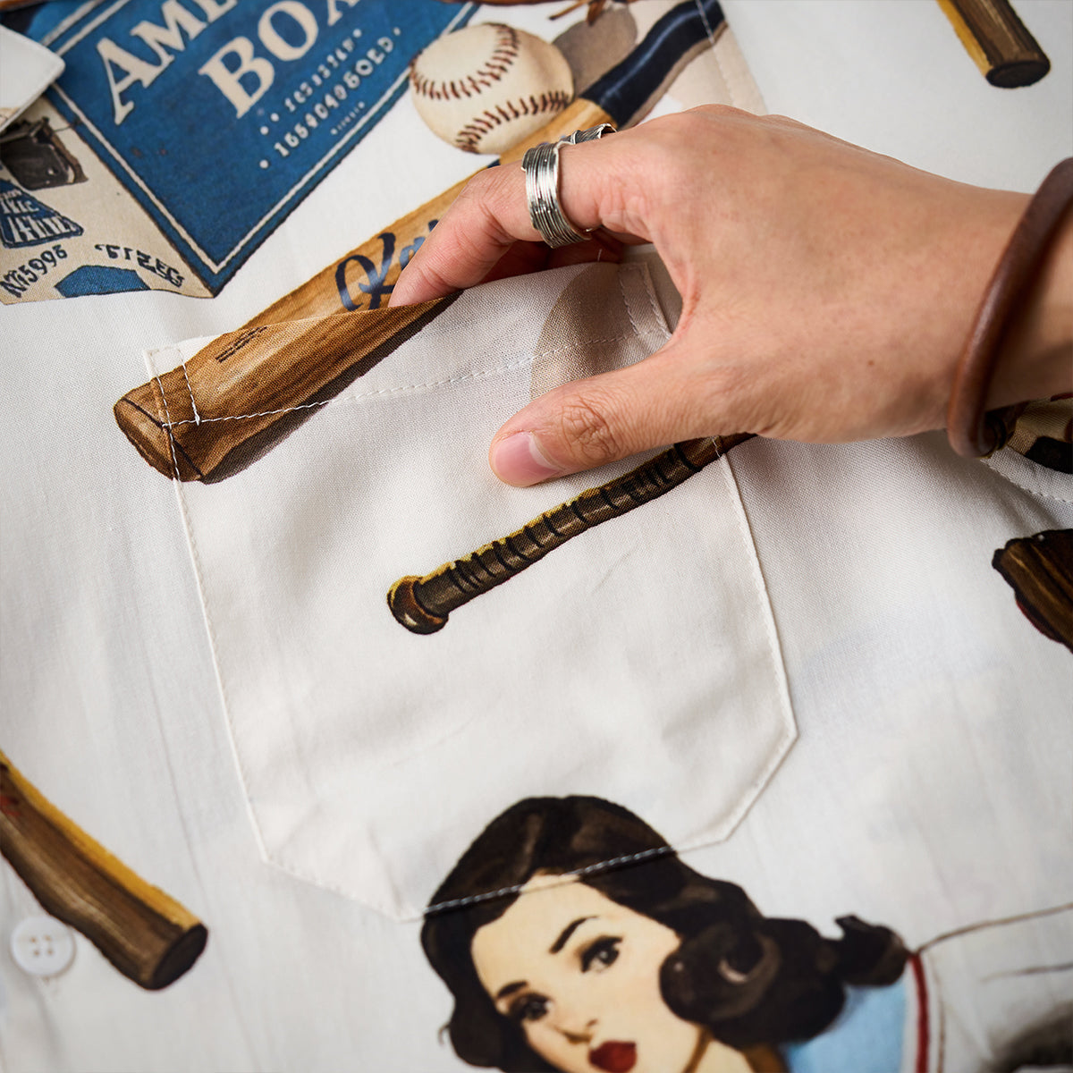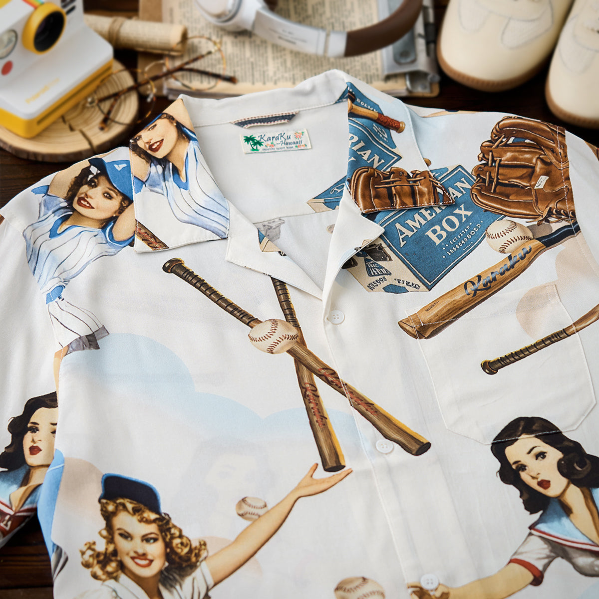 「핀업 베이스볼 걸」올오버 프린트 알로하 셔츠
