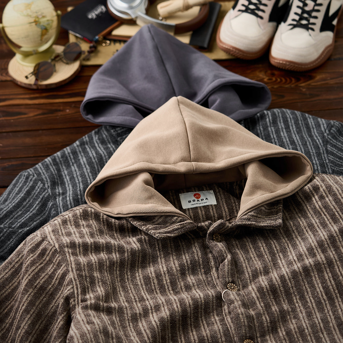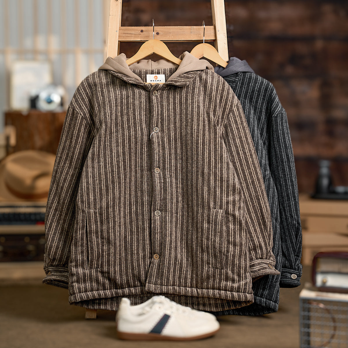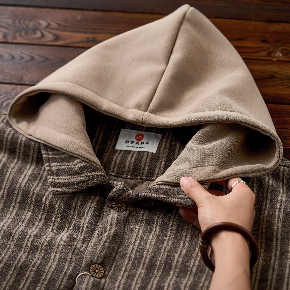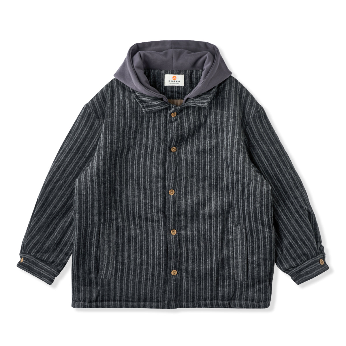 스트라이프 패턴과 독특한 버튼, 단색 후드가 돋보이는 트위드 자켓으로, 실용성과 보온성을 갖춰 가을·겨울 시즌에 적합한 아이템입니다.