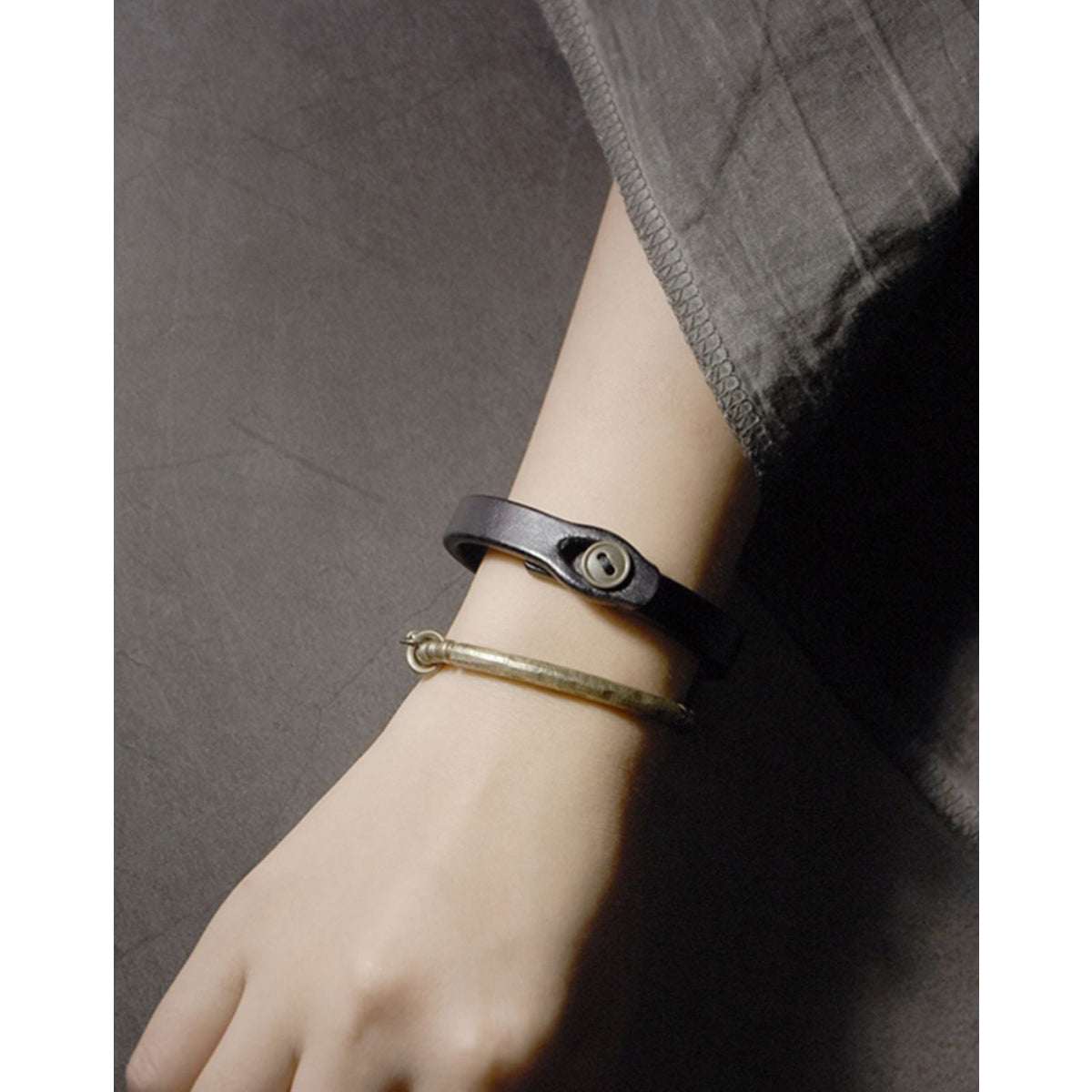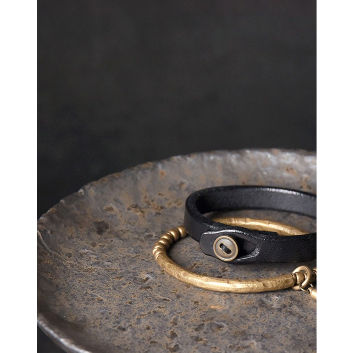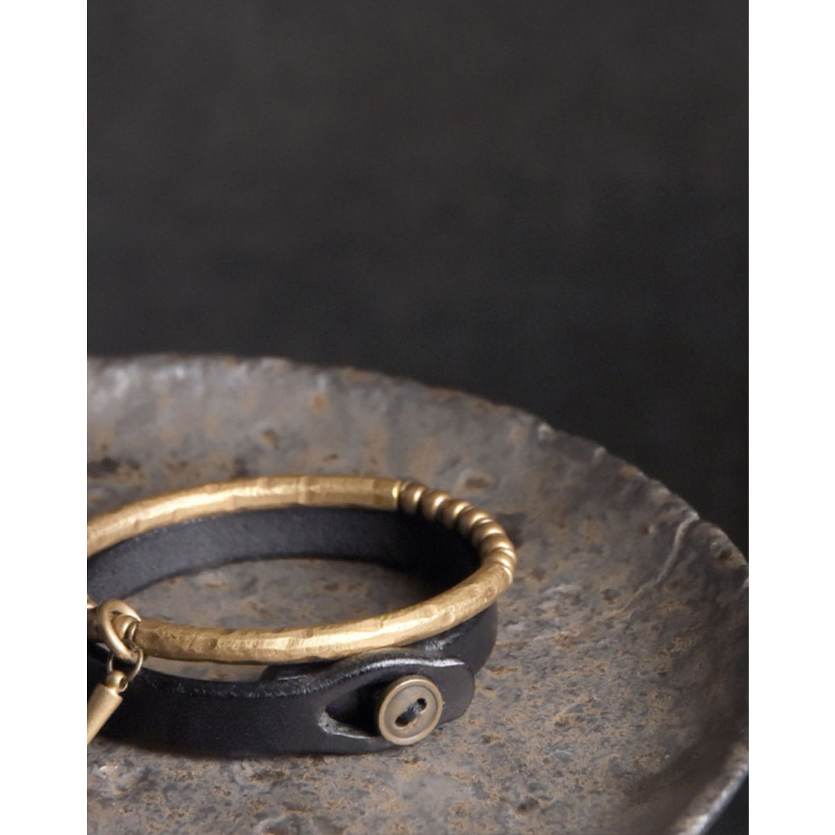 핸드메이드 태닝 가죽 팔찌와 해머 텍스처 황동 팔찌 세트로, 심플하면서도 실용적이며, 착용할수록 멋스러운 에이징이 돋보이는 제품입니다.
