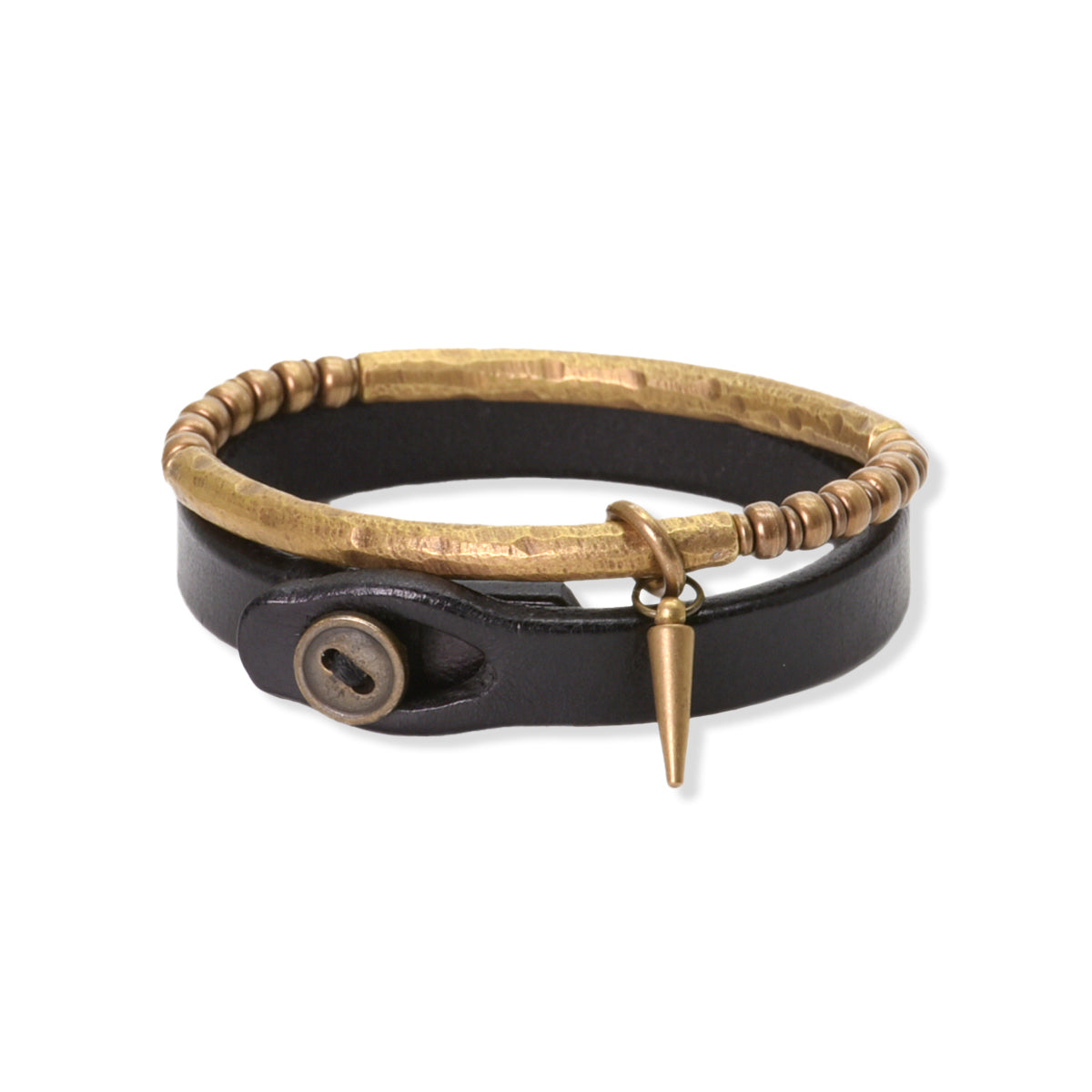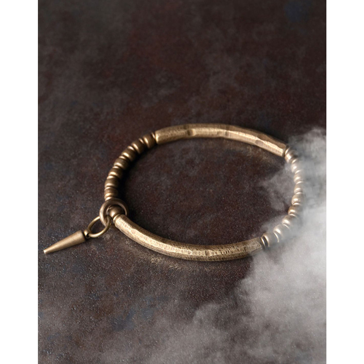 해머 텍스처가 더해진 황동 파츠로 제작되어 핸드메이드 특유의 따뜻한 감성이 느껴지며, 연결 부분의 비즈 장식이 리듬감을 더합니다. 또한 작은 스파이크 형태의 참이 위트와 엣지를 더해 디자인에 개성을 더합니다.