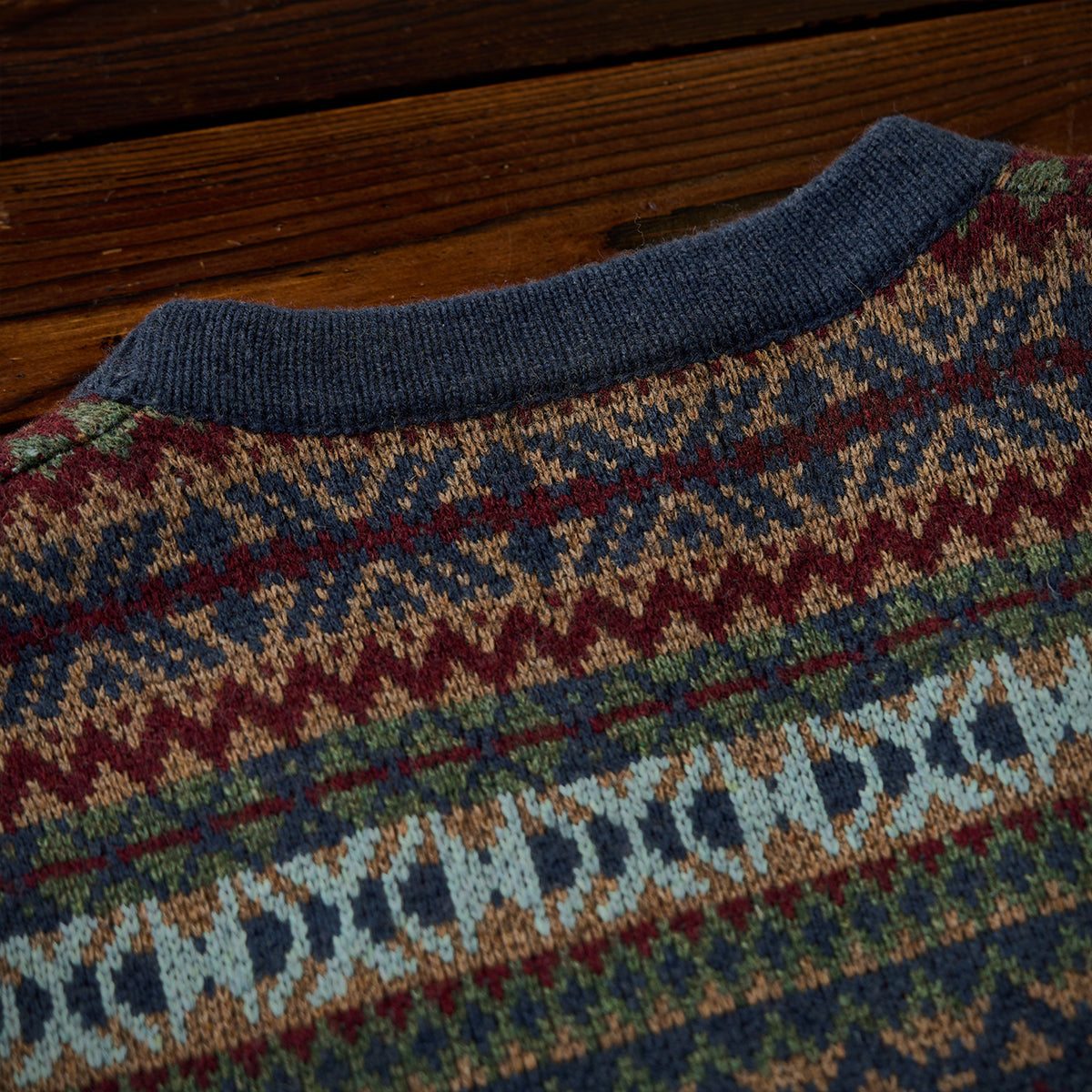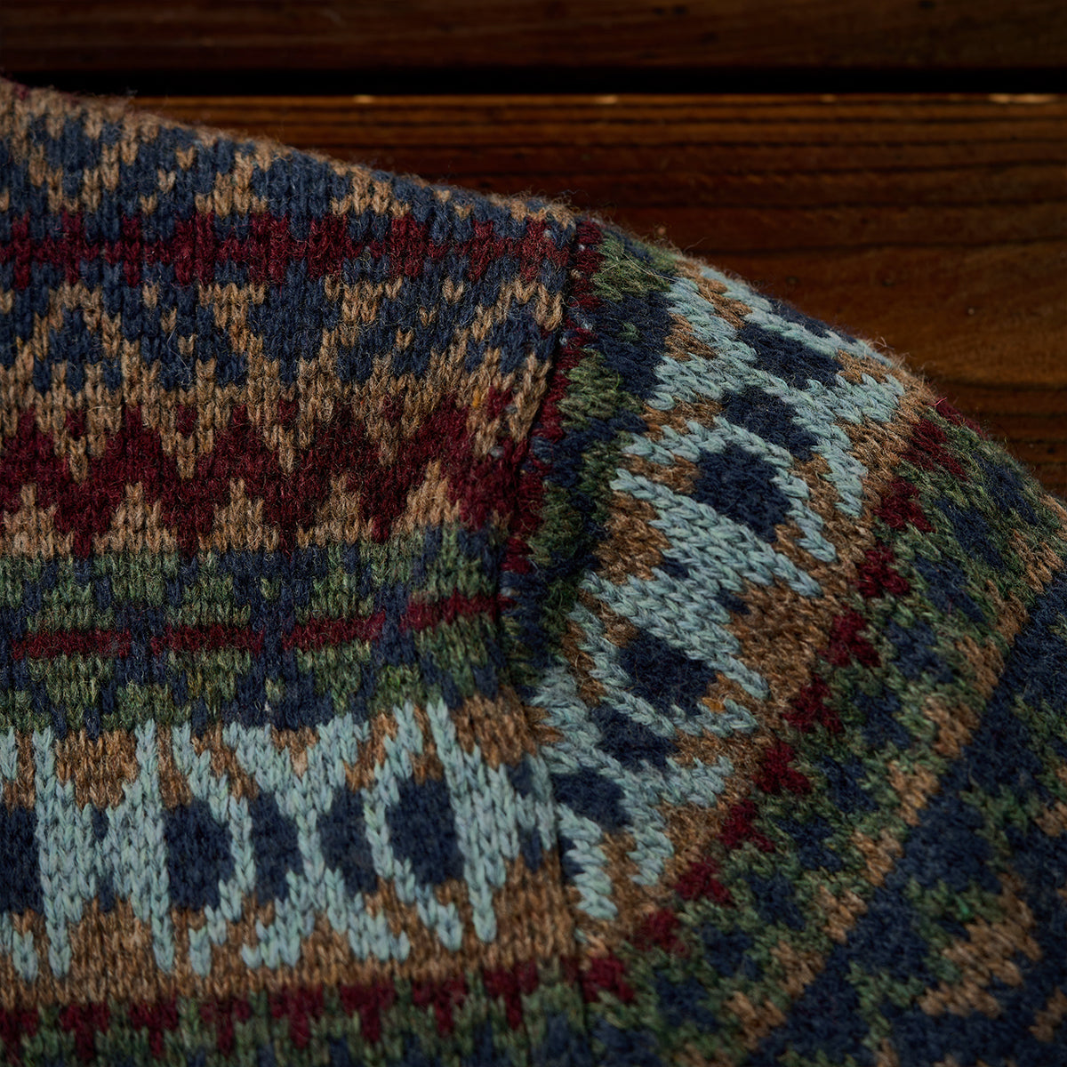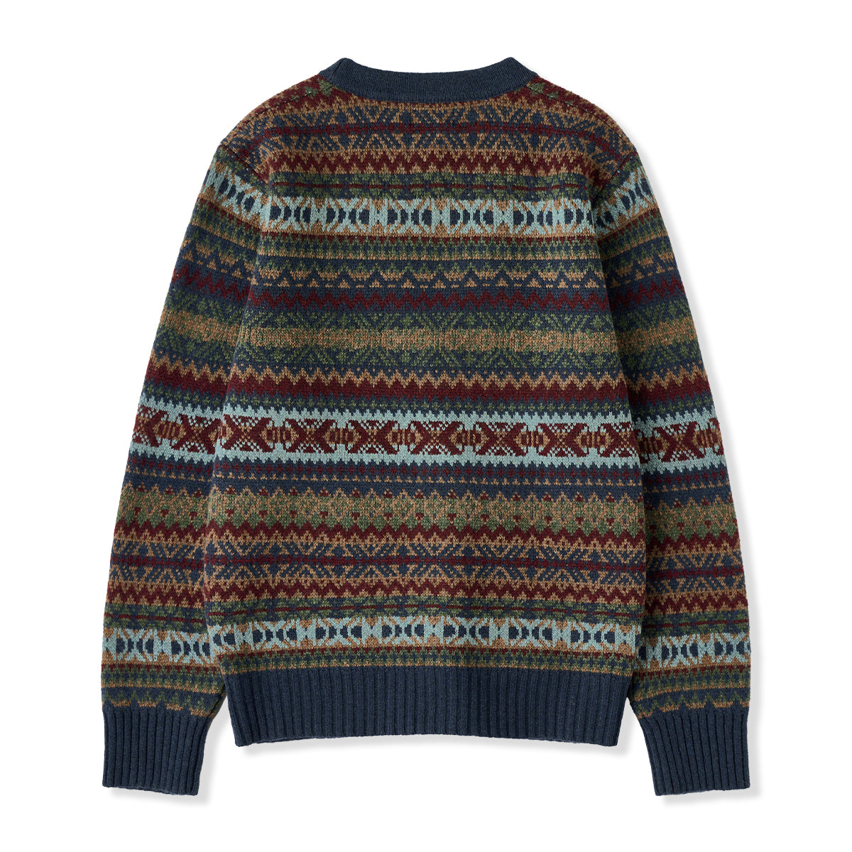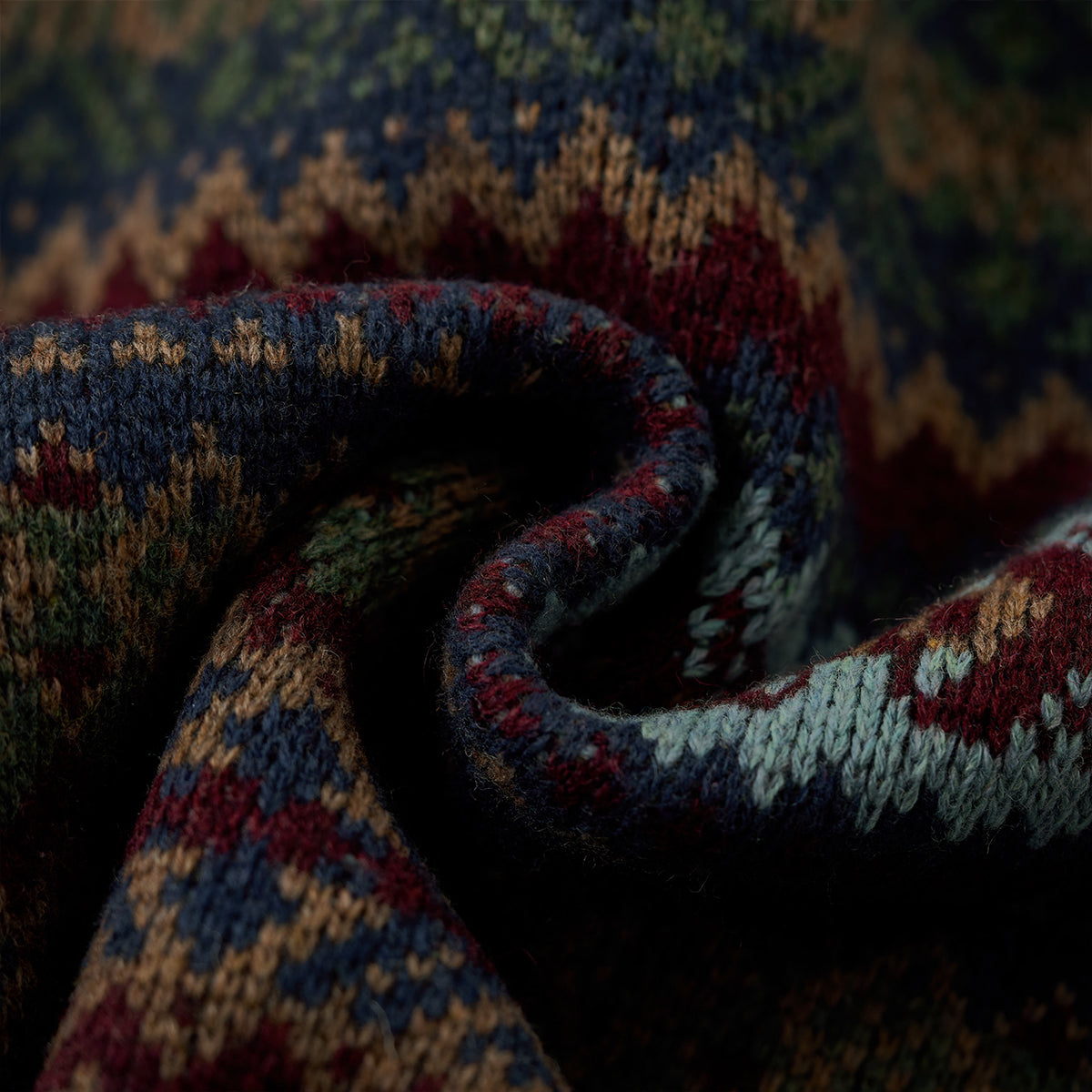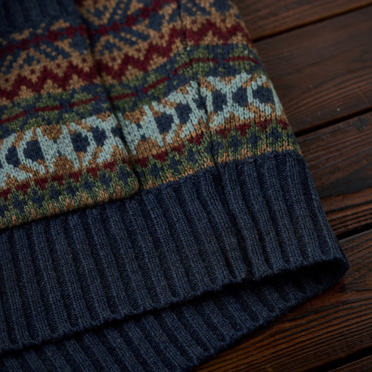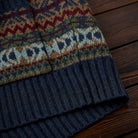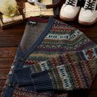 기하학적 디자인과 전통적인 페어아일 무늬를 조합해 반복적으로 구성했으며, 시각적으로 리듬감 있는 인상을 줍니다.