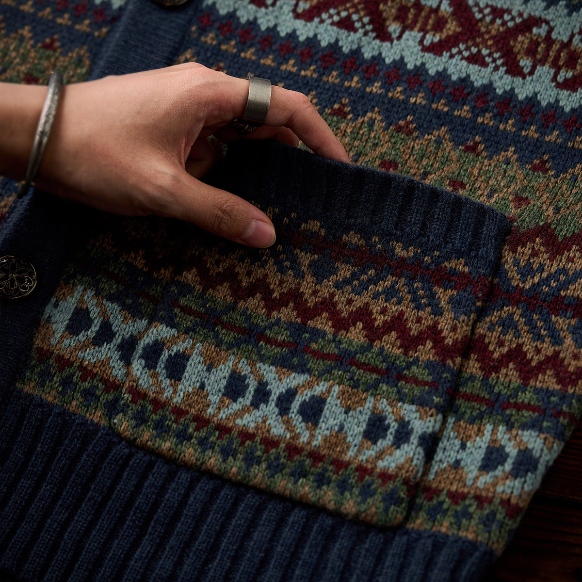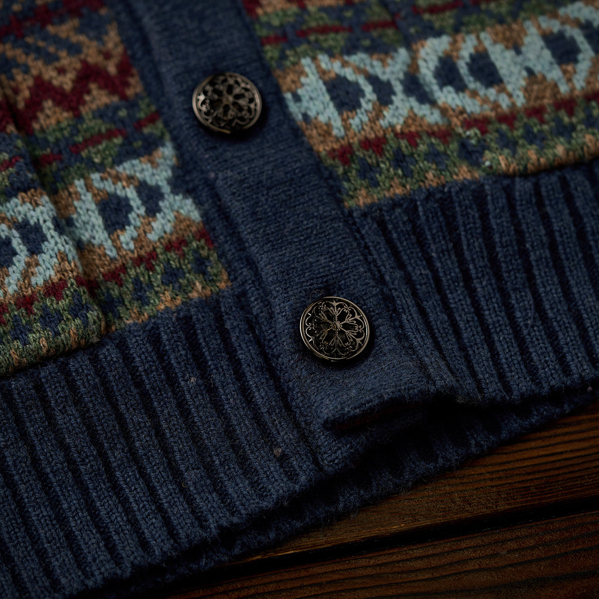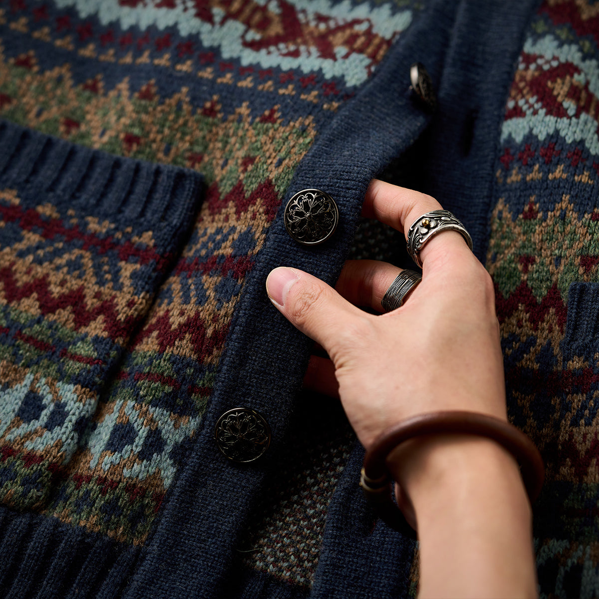 페어아일 패턴과 자카드 디테일로 고급스러운 분위기를 살린 가디건으로, 메탈 톤 버튼이 빈티지한 포인트를 더해 전체 무드와 조화를 이룹니다.
