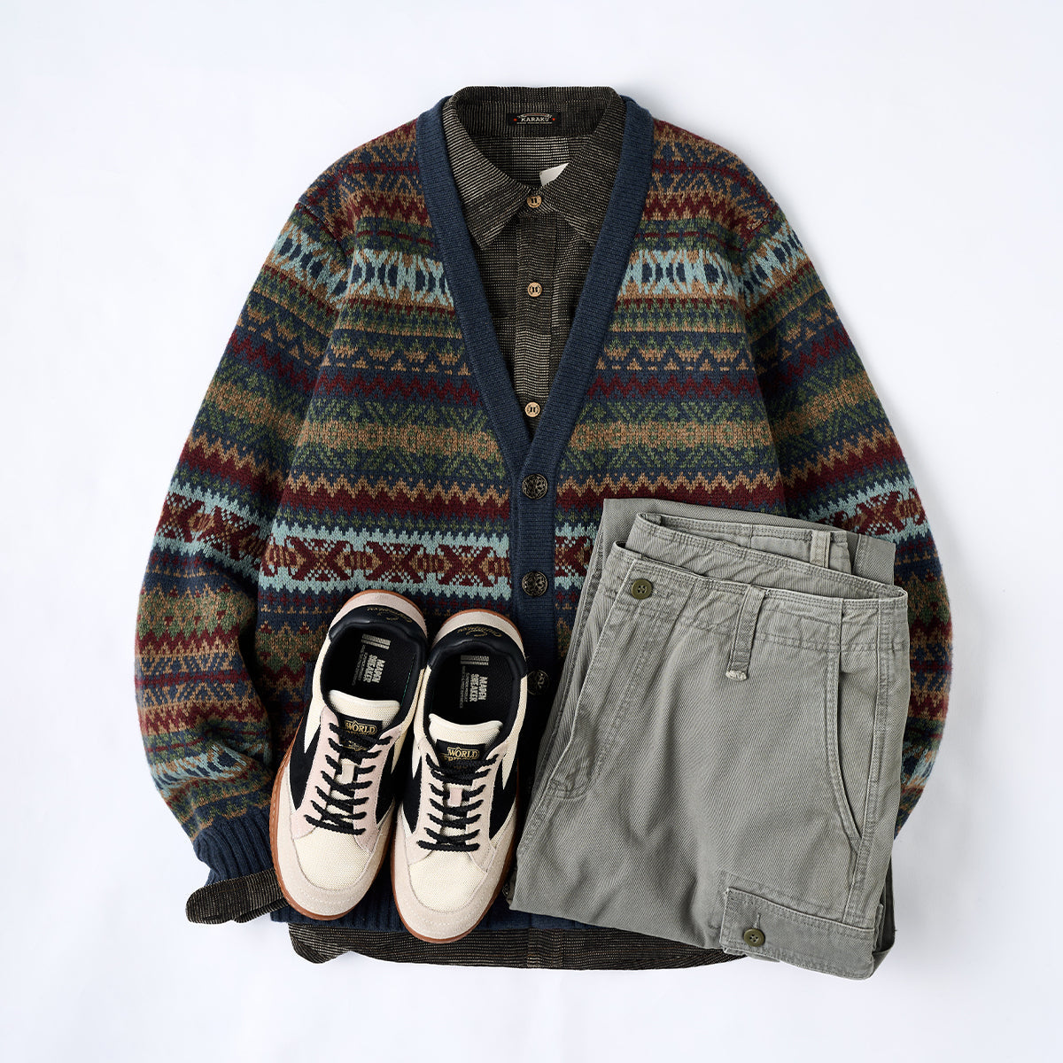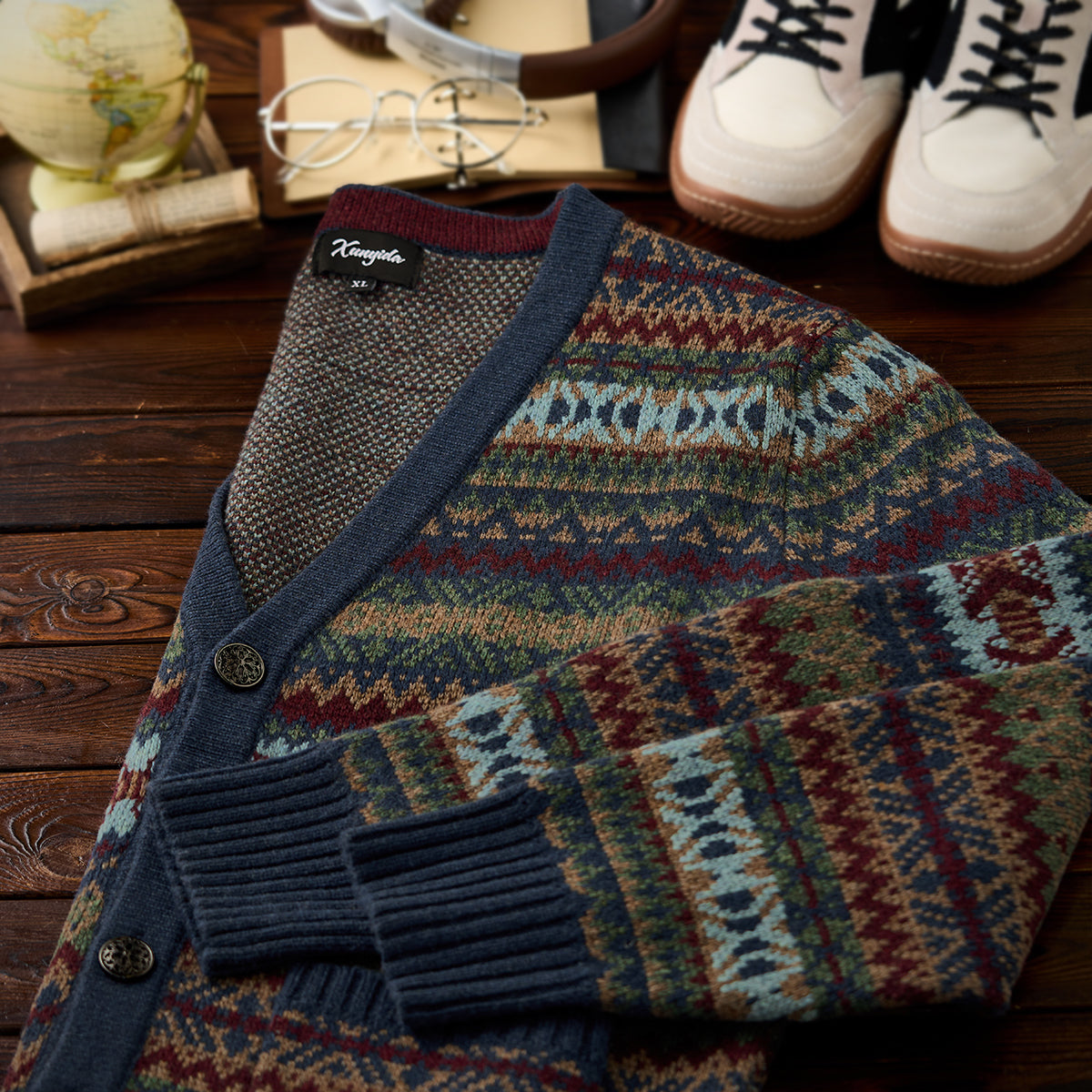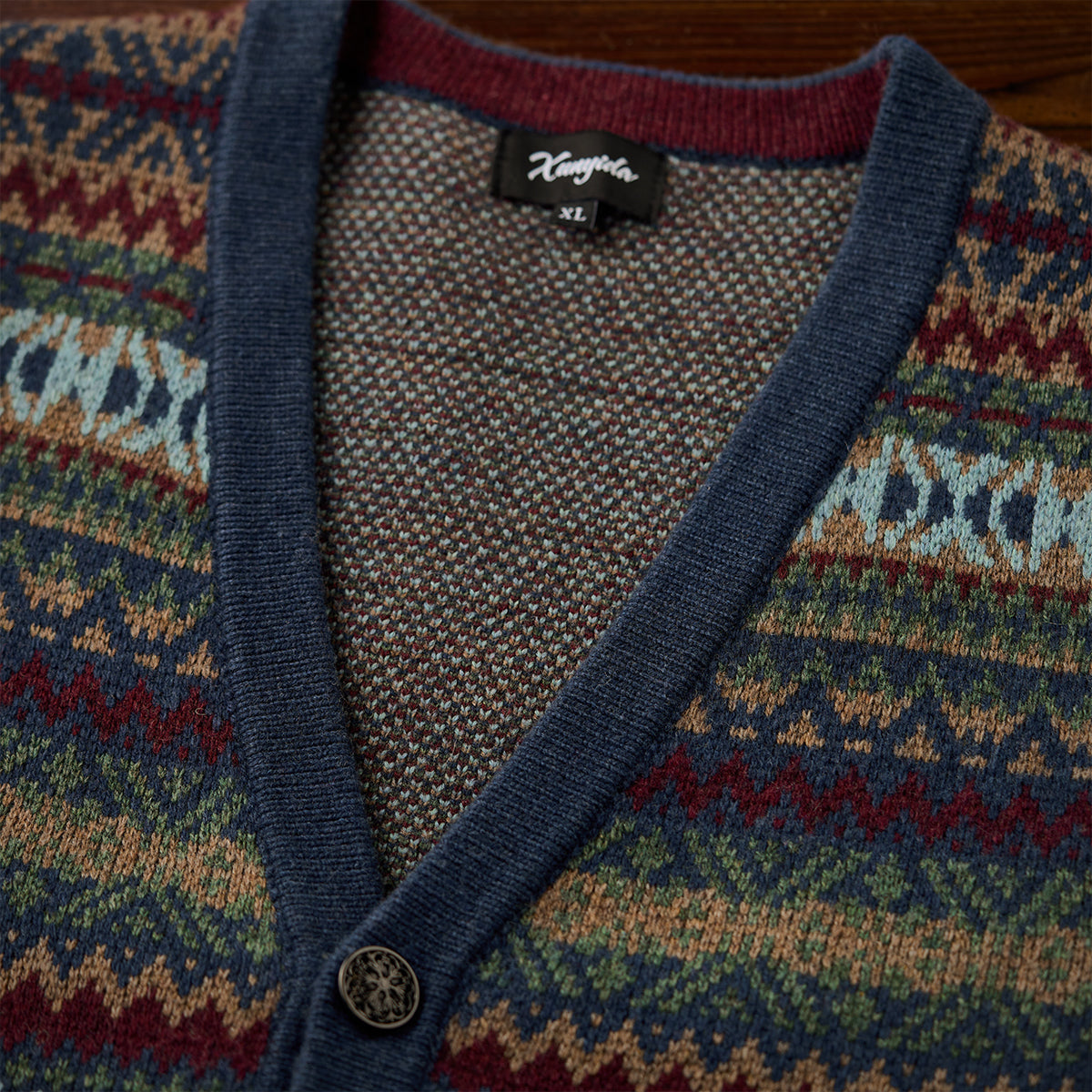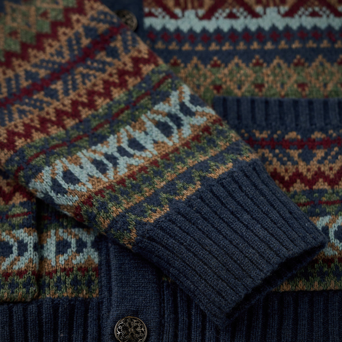 페어아일 패턴과 자카드 디테일로 고급스러운 분위기를 살린 가디건으로, 메탈 톤 버튼이 빈티지한 포인트를 더해 전체 무드와 조화를 이룹니다.