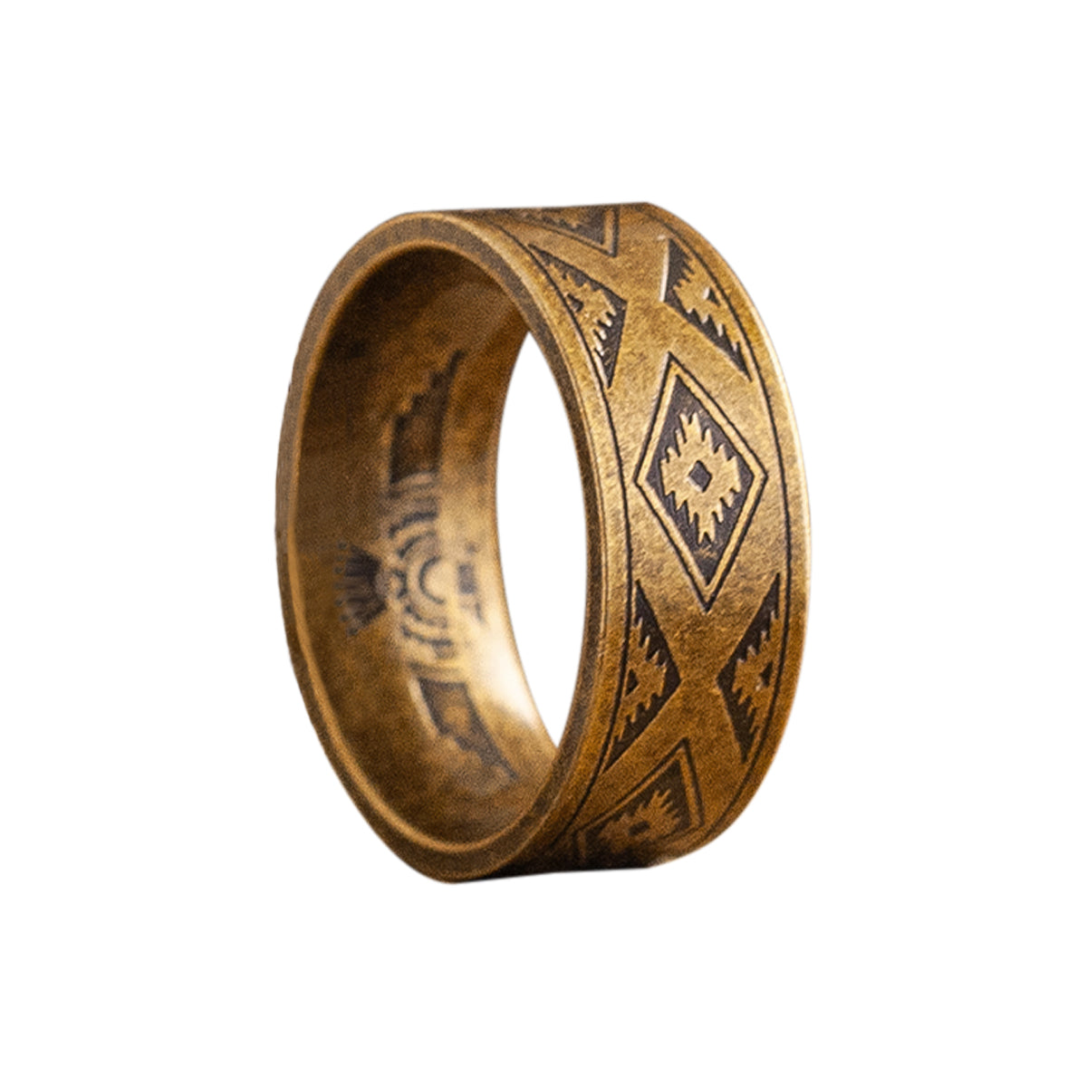 외부 나바호 패턴과 내부 썬더버드 패턴이 돋보이는 티타늄 링으로, 가볍고 내구성과 내식성이 뛰어납니다.